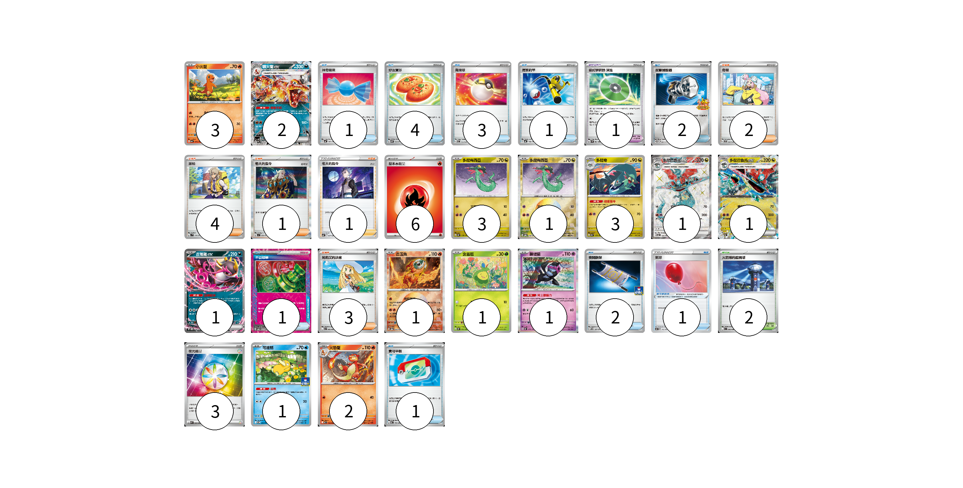 牌組構築方案 以此牌組為基礎新構築牌組 顯示卡面 顯示列表 寶可夢卡(21) 3 2 3 1 3 1 1 1 1 1 1 1 2 寶可夢道具(2) 1 1 物品卡(15) 1 4 3 1 2 1 2 1 支援者卡(11) 2 4 1 1 3 競技場卡(2) 2 能量卡(9) 6 3 寶可夢卡(21) 卡牌名稱 張數 卡牌名稱 張數 小火龍 SV4a 025/190 03 噴火龍ex SV4a 115/190 02 多龍梅西亞 SV8a 118/187 03 多龍梅西亞 SV8a 118/187 01 多龍奇 SV8a 119/187 03 多龍巴魯托ex SV6 120/101 01 多龍巴魯托ex SV8a 120/187 01 吉雉雞ex SVOM 009/021 01 古玉魚 SV8a 025/187 01 含羞苞 SV8a 001/187 01 願增猿 SV8a 075/187 01 可達鴨 SV-P 220/SV-P 01 火恐龍 M2 012/080 02 寶可夢道具(2) 卡牌名稱 張數 卡牌名稱 張數 招式學習器 演進 SV4M 063/066 01 氣球 S8b 145/184 01 物品卡(15) 卡牌名稱 張數 卡牌名稱 張數 神奇糖果 SV4a 163/190 01 好友寶芬 SV5K 063/071 04 高級球 SVEL 012/020 03 厲害釣竿 SV4a 158/190 01 反擊捕捉器 SV-P 083/SV-P 02 不公印章 SV5a 053/066 01 夜間擔架 SV-P 227/SV-P 02 寶可平板 M3 070/080 01 支援者卡(11) 卡牌名稱 張數 卡牌名稱 張數 奇樹 SVF 029/038 02 派帕 SV1V 076/078 04 老大的指令 SV1a 069/073 01 老大的指令(赤日) SVB 024/028 01 莉莉艾的決意 M1L 062/063 03 競技場卡(2) 卡牌名稱 張數 卡牌名稱 張數 火箭隊的監視塔 SV10 096/098 02 能量卡(9) 卡牌名稱 張數 卡牌名稱 張數 基本火能量 sv-p FIR 06 夜光能量 SVK 042/042 03 以此牌組為基礎新構築牌組 牌組編碼 YIaodN-clZLee-bvOWjn copy 列印牌組單 牌組編碼已複製 分享至SNS