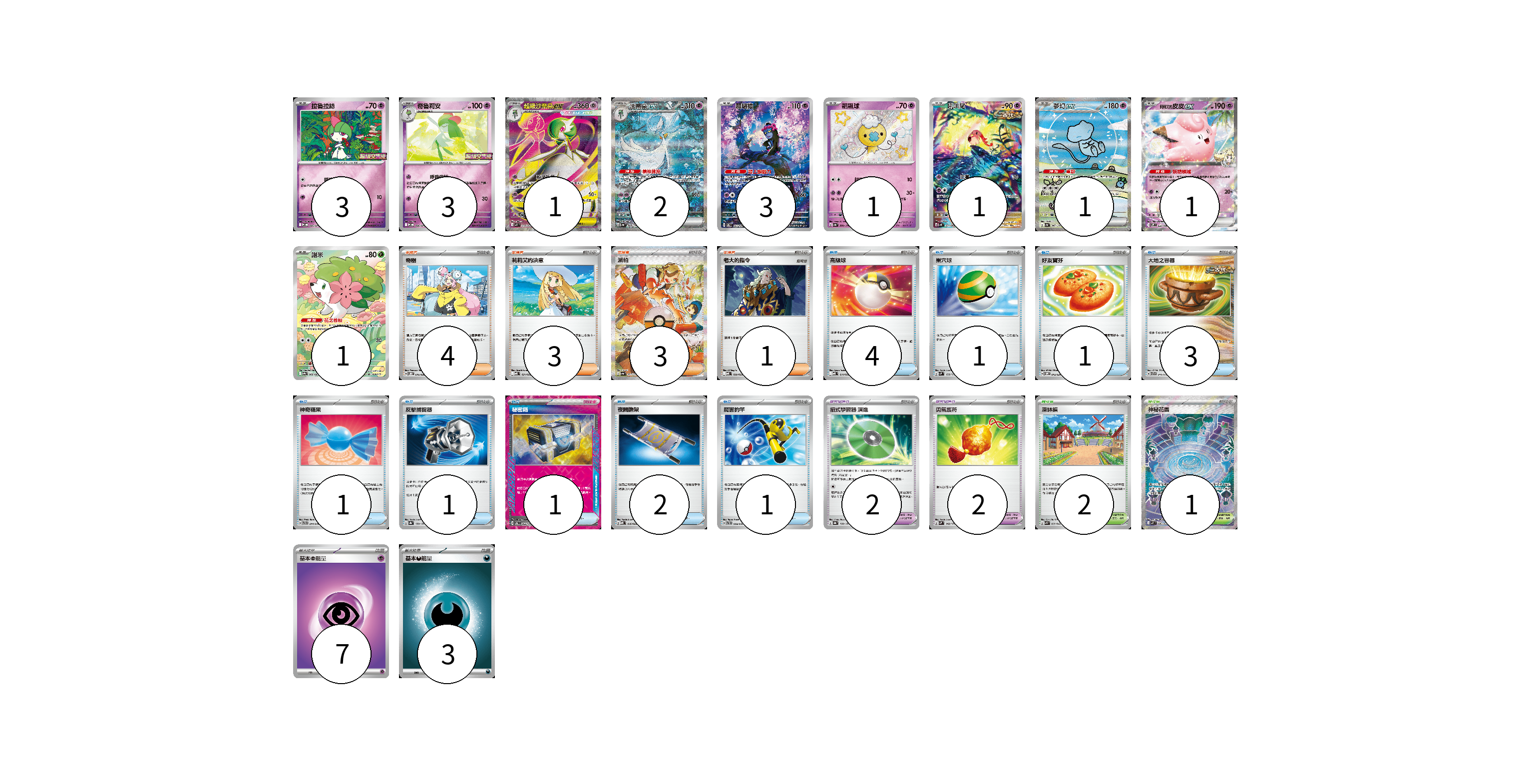 牌組構築方案 以此牌組為基礎新構築牌組 顯示卡面 顯示列表 寶可夢卡(17) 3 3 1 2 3 1 1 1 1 1 寶可夢道具(4) 2 2 物品卡(15) 4 1 1 3 1 1 1 2 1 支援者卡(11) 4 3 3 1 競技場卡(3) 2 1 能量卡(10) 7 3 寶可夢卡(17) 卡牌名稱 張數 卡牌名稱 張數 拉魯拉絲 M-P 005/M-P 03 奇魯莉安 M-P 006/M-P 03 超級沙奈朵ex M1S 078/063 01 沙奈朵ex SV4a 348/190 02 願增猿 SV6 107/101 03 飄飄球 SV4a 260/190 01 吼叫尾 SV4K 071/066 01 夢幻ex SV4a 347/190 01 莉莉艾的皮皮ex SV9 033/100 01 謝米 SV9a 066/063 01 寶可夢道具(4) 卡牌名稱 張數 卡牌名稱 張數 招式學習器 演進 SV8a 160/187 02 勇氣護符 SVM 142/175 02 物品卡(15) 卡牌名稱 張數 卡牌名稱 張數 高級球 MBD 014/022 04 巢穴球 SVM 133/175 01 好友寶芬 SVOM 012/021 01 大地之容器 SVTG 010/019 03 神奇糖果 SVTG 014/019 01 反擊捕捉器 SV8a 139/187 01 秘密箱 SV6 092/101 01 夜間擔架 MBD 016/022 02 厲害釣竿 SVTH 008/018 01 支援者卡(11) 卡牌名稱 張數 卡牌名稱 張數 奇樹 SVOD 016/020 04 莉莉艾的決意 MBD 021/022 03 派帕 SV4a 353/190 03 老大的指令 MBD 020/022 01 競技場卡(3) 卡牌名稱 張數 卡牌名稱 張數 深缽鎮 SVK 039/042 02 神秘花園 M1S 086/063 01 能量卡(10) 卡牌名稱 張數 卡牌名稱 張數 基本【超】能量 SVTS PSY 07 基本【惡】能量 M-P DAR 03 以此牌組為基礎新構築牌組 牌組編碼 YJohcZ-uWpcLv-cxfCaB copy 列印牌組單 牌組編碼已複製 分享至SNS