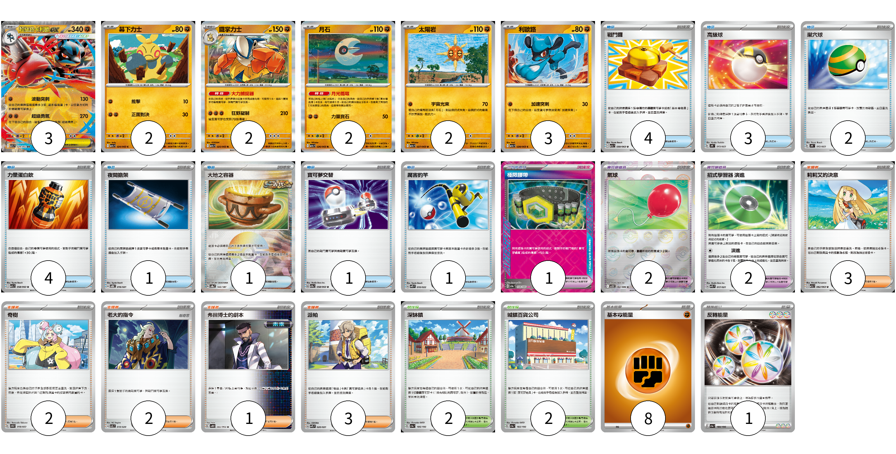 牌組構築方案 以此牌組為基礎新構築牌組 顯示卡面 顯示列表 寶可夢卡(14) 3 2 2 2 2 3 寶可夢道具(5) 1 2 2 物品卡(17) 4 3 2 4 1 1 1 1 支援者卡(11) 3 2 2 1 3 競技場卡(4) 2 2 能量卡(9) 8 1 寶可夢卡(14) 卡牌名稱 張數 卡牌名稱 張數 超級路卡利歐ex M1L 029/063 03 幕下力士 M1L 024/063 02 鐵掌力士 M1L 025/063 02 月石 M1L 026/063 02 太陽岩 M1L 027/063 02 利歐路 M1L 028/063 03 寶可夢道具(5) 卡牌名稱 張數 卡牌名稱 張數 極限腰帶 SV8a 159/187 01 氣球 SV11B 082/086 02 招式學習器 演進 SVTL 017/021 02 物品卡(17) 卡牌名稱 張數 卡牌名稱 張數 戰鬥鑼 M1L 059/063 04 高級球 SVHK 013/022 03 巢穴球 SVHK 012/022 02 力量蛋白飲 M1L 058/063 04 夜間擔架 SVOM 016/021 01 大地之容器 SV8a 143/187 01 寶可夢交替 SV9a 058/063 01 厲害釣竿 SVTS 010/022 01 支援者卡(11) 卡牌名稱 張數 卡牌名稱 張數 莉莉艾的決意 M1L 062/063 03 奇樹 SVHM 018/022 02 老大的指令 SVEL 019/020 02 弗圖博士的劇本 SV4M 065/066 01 派帕 SVTL 020/021 03 競技場卡(4) 卡牌名稱 張數 卡牌名稱 張數 深缽鎮 SV4a 185/190 02 城鎮百貨公司 SV4a 183/190 02 能量卡(9) 卡牌名稱 張數 卡牌名稱 張數 基本【鬥】能量 SVAM FIG 08 反轉能量 SV4a 189/190 01 以此牌組為基礎新構築牌組 牌組編碼 YJzKKe-VNjvzl-JRmATg copy 列印牌組單 牌組編碼已複製 分享至SNS
