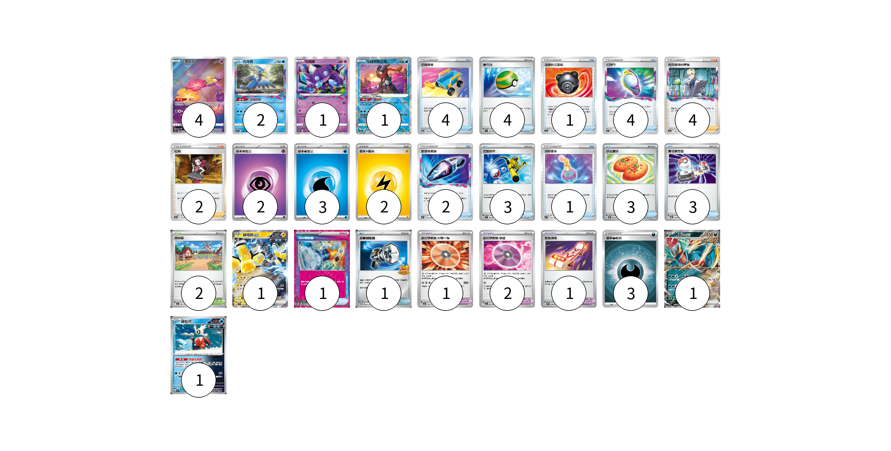 牌組構築方案 以此牌組為基礎新構築牌組 顯示卡面 顯示列表 寶可夢卡(11) 4 2 1 1 1 1 1 寶可夢道具(4) 1 2 1 物品卡(27) 4 4 1 4 2 3 1 3 3 1 1 支援者卡(6) 4 2 競技場卡(2) 2 能量卡(10) 2 3 2 3 寶可夢卡(11) 卡牌名稱 張數 卡牌名稱 張數 花療環環 S12a 187/172 04 古月鳥 S11 033/100 02 勾魂眼 S11 044/100 01 光輝甲賀忍蛙 S12a 033/172 01 鐵臂膀ex SV4M 027/066 01 轟鳴月ex SV4K 054/066 01 鐵包袱 SV4M 020/066 01 寶可夢道具(4) 卡牌名稱 張數 卡牌名稱 張數 招式學習器 火場一爆 SV4a 170/190 01 招式學習器 衰退 SV4K 063/066 02 緊急滑板 SV5K 064/071 01 物品卡(27) 卡牌名稱 張數 卡牌名稱 張數 交替推車 S10D 060/067 04 巢穴球 SV1S 070/078 04 洗翠的沉重球 S12a 140/172 01 幻想門 S11 092/100 04 放逐吸塵器 SVB 016/028 02 厲害釣竿 SV2P 066/071 03 消除香水 SVF 011/038 01 好友寶芬 SV5K 063/071 03 寶可夢交替 SVHK 014/022 03 頂尖捕捉器 SV5M 062/071 01 反擊捕捉器 SV-P 083/SV-P 01 支援者卡(6) 卡牌名稱 張數 卡牌名稱 張數 阿克羅瑪的實驗 S12a 148/172 04 杜娟 S12a 157/172 02 競技場卡(2) 卡牌名稱 張數 卡牌名稱 張數 深缽鎮 SV4a 185/190 02 能量卡(10) 卡牌名稱 張數 卡牌名稱 張數 基本超能量 sv-p PSY 02 基本水能量 sv-p WAT 03 基本【雷】能量 SVB LIG 02 基本【惡】能量 SI DAR 03 以此牌組為基礎新構築牌組 牌組編碼 YKbKCE-NYBRps-HszBBv copy 列印牌組單 牌組編碼已複製 分享至SNS