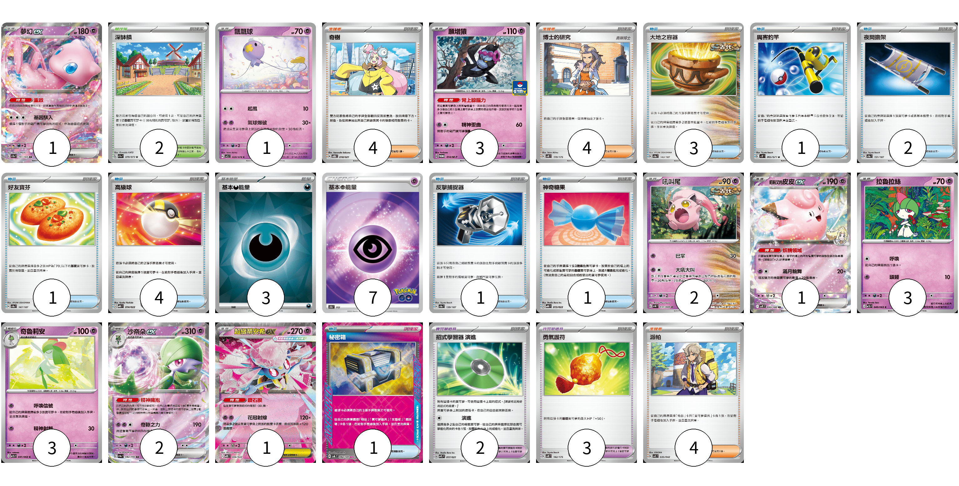 牌組構築方案 以此牌組為基礎新構築牌組 顯示卡面 顯示列表 寶可夢卡(17) 1 1 3 2 1 3 3 2 1 寶可夢道具(5) 2 3 物品卡(14) 3 1 2 1 4 1 1 1 支援者卡(12) 4 4 4 競技場卡(2) 2 能量卡(10) 3 7 寶可夢卡(17) 卡牌名稱 張數 卡牌名稱 張數 夢幻ex SV2a 151/165 01 飄飄球 SV1S 029/078 01 願增猿 M-P 014/M-P 03 吼叫尾 SV4K 032/066 02 莉莉艾的皮皮ex SV9 033/100 01 拉魯拉絲 M1S 040/063 03 奇魯莉安 M1S 041/063 03 沙奈朵ex SV4a 082/190 02 超級蒂安希ex MBD 006/022 01 寶可夢道具(5) 卡牌名稱 張數 卡牌名稱 張數 招式學習器 演進 SVTL 017/021 02 勇氣護符 SVM 142/175 03 物品卡(14) 卡牌名稱 張數 卡牌名稱 張數 大地之容器 SV8a 143/187 03 厲害釣竿 SV2P 066/071 01 夜間擔架 SV8a 151/187 02 好友寶芬 SV8a 147/187 01 高級球 MBD 014/022 04 反擊捕捉器 SV8a 139/187 01 神奇糖果 MBG 013/022 01 秘密箱 SV6 092/101 01 支援者卡(12) 卡牌名稱 張數 卡牌名稱 張數 奇樹 SVOM 018/021 04 博士的研究 SVM 170/175 04 派帕 SVK 035/042 04 競技場卡(2) 卡牌名稱 張數 卡牌名稱 張數 深缽鎮 SV1a 070/073 02 能量卡(10) 卡牌名稱 張數 卡牌名稱 張數 基本【惡】能量 SVOM DAR 03 基本超能量 S10b PSY 07 以此牌組為基礎新構築牌組 牌組編碼 YLbRrj-DXDXQy-OzCOuk copy 列印牌組單 牌組編碼已複製 分享至SNS