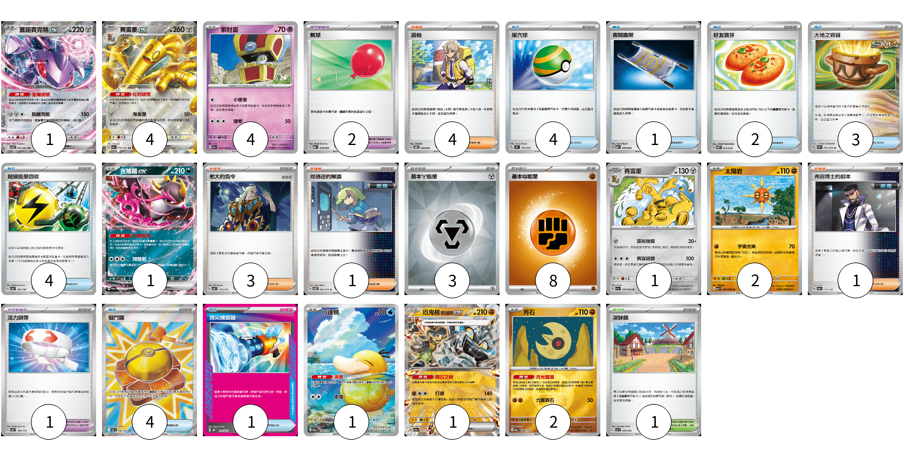 牌組構築方案 以此牌組為基礎新構築牌組 顯示卡面 顯示列表 寶可夢卡(17) 1 4 4 1 1 2 1 1 2 寶可夢道具(3) 2 1 物品卡(19) 4 1 2 3 4 4 1 支援者卡(9) 4 3 1 1 競技場卡(1) 1 能量卡(11) 3 8 寶可夢卡(17) 卡牌名稱 張數 卡牌名稱 張數 蓋諾賽克特ex SV11B 069/086 01 賽富豪ex SV3a 050/062 04 索財靈 SV7a 024/064 04 吉雉雞ex SV8a 104/187 01 賽富豪 SV7a 038/064 01 太陽岩 M1L 027/063 02 可達鴨 M2a 199/193 01 厄鬼椪 礎石面具ex SV8a 091/187 01 月石 M2a 086/193 02 寶可夢道具(3) 卡牌名稱 張數 卡牌名稱 張數 氣球 MBD 018/022 02 活力頭帶 SVM 140/175 01 物品卡(19) 卡牌名稱 張數 卡牌名稱 張數 巢穴球 SVHK 012/022 04 夜間擔架 MBD 016/022 01 好友寶芬 SVTG 011/019 02 大地之容器 SV4K 060/066 03 超級能量回收 SV8a 141/187 04 戰鬥鑼 M1L 082/063 04 頂尖捕捉器 MBG 014/022 01 支援者卡(9) 卡牌名稱 張數 卡牌名稱 張數 派帕 SVOD 018/020 04 老大的指令 SVM 172/175 03 暗碼迷的解讀 SV5M 067/071 01 弗圖博士的劇本 SV8a 175/187 01 競技場卡(1) 卡牌名稱 張數 卡牌名稱 張數 深缽鎮 SVK 039/042 01 能量卡(11) 卡牌名稱 張數 卡牌名稱 張數 基本【鋼】能量 SVOD MET 03 基本【鬥】能量 M-P FIG 08 以此牌組為基礎新構築牌組 牌組編碼 YMdhPy-qwZHMJ-EyAqik copy 列印牌組單 牌組編碼已複製 分享至SNS