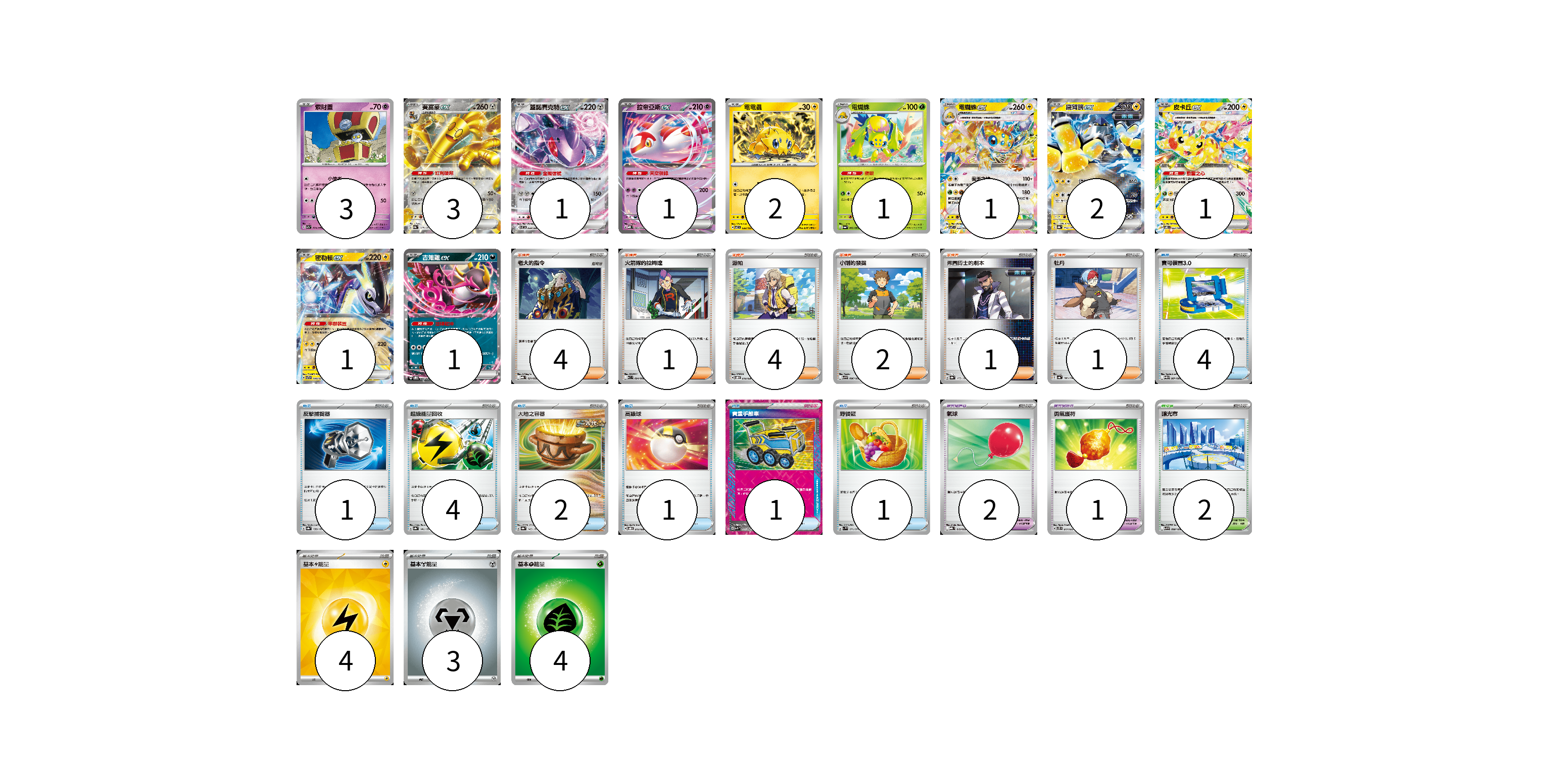 牌組構築方案 以此牌組為基礎新構築牌組 顯示卡面 顯示列表 寶可夢卡(17) 3 3 1 1 2 1 1 2 1 1 1 寶可夢道具(3) 2 1 物品卡(14) 4 1 4 2 1 1 1 支援者卡(13) 4 1 4 2 1 1 競技場卡(2) 2 能量卡(11) 4 3 4 寶可夢卡(17) 卡牌名稱 張數 卡牌名稱 張數 索財靈 SV7a 024/064 03 賽富豪ex SV8a 117/187 03 蓋諾賽克特ex SV11B 069/086 01 拉帝亞斯ex MBD 003/022 01 電電蟲 SV7 032/102 02 電蜘蛛 SV6a 002/064 01 電蜘蛛ex SV7 033/102 01 鐵臂膀ex SV8a 054/187 02 皮卡丘ex SV8 033/106 01 密勒頓ex SVTR 008/021 01 吉雉雞ex SVOD 004/020 01 寶可夢道具(3) 卡牌名稱 張數 卡牌名稱 張數 氣球 MBG 019/022 02 勇氣護符 SVTS 017/022 01 物品卡(14) 卡牌名稱 張數 卡牌名稱 張數 寶可裝置3.0 SV11B 081/086 04 反擊捕捉器 SV8a 139/187 01 超級能量回收 SV8a 141/187 04 大地之容器 SV8a 143/187 02 高級球 SVOD 012/020 01 貴重手推車 SVK 020/042 01 野餐籃 SV1V 071/078 01 支援者卡(13) 卡牌名稱 張數 卡牌名稱 張數 老大的指令 MBG 021/022 04 火箭隊的拉姆達 SV10 094/098 01 派帕 SVOD 018/020 04 小剛的發掘 SV9 096/100 02 弗圖博士的劇本 SV8a 175/187 01 牡丹 SV4a 182/190 01 競技場卡(2) 卡牌名稱 張數 卡牌名稱 張數 釀光市 SV9 098/100 02 能量卡(11) 卡牌名稱 張數 卡牌名稱 張數 基本【雷】能量 SVQP LIG 04 基本【鋼】能量 M-P MET 03 基本【草】能量 M-P GRA 04 以此牌組為基礎新構築牌組 牌組編碼 YMuiuP-VIYefe-CdnECr copy 列印牌組單 牌組編碼已複製 分享至SNS