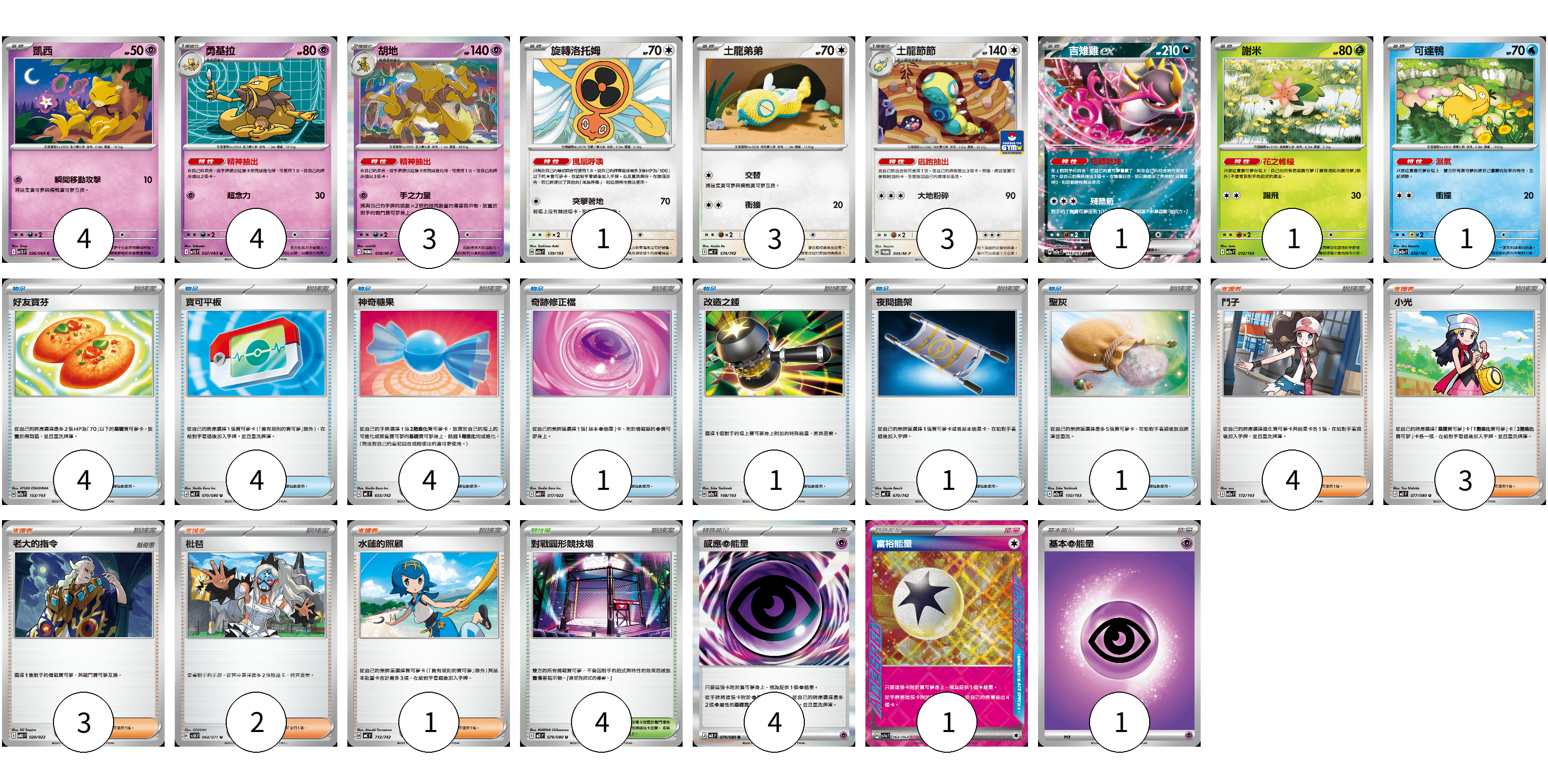 牌組構築方案 以此牌組為基礎新構築牌組 顯示卡面 顯示列表 寶可夢卡(21) 4 4 3 1 3 3 1 1 1 物品卡(16) 4 4 4 1 1 1 1 支援者卡(13) 4 3 3 2 1 競技場卡(4) 4 能量卡(6) 4 1 1 寶可夢卡(21) 卡牌名稱 張數 卡牌名稱 張數 凱西 M1S 036/063 04 勇基拉 M1S 037/063 04 胡地 M-P 058/M-P 03 旋轉洛托姆 M2a 139/193 01 土龍弟弟 MC 574/742 03 土龍節節 M-P 045/M-P 03 吉雉雞ex M2a 114/193 01 謝米 M2a 012/193 01 可達鴨 M2a 032/193 01 物品卡(16) 卡牌名稱 張數 卡牌名稱 張數 好友寶芬 M2a 153/193 04 寶可平板 M3 070/080 04 神奇糖果 MC 655/742 04 奇跡修正檔 MBD 017/022 01 改造之錘 M2a 148/193 01 夜間擔架 MC 670/742 01 聖灰 M2a 150/193 01 支援者卡(13) 卡牌名稱 張數 卡牌名稱 張數 鬥子 M2a 172/193 04 小光 M2 077/080 03 老大的指令 MBD 020/022 03 枇琶 SV5K 068/071 02 水蓮的照顧 MC 712/742 01 競技場卡(4) 卡牌名稱 張數 卡牌名稱 張數 對戰圓形競技場 M2 079/080 04 能量卡(6) 卡牌名稱 張數 卡牌名稱 張數 感應【超】能量 M3 079/080 04 富裕能量 SV7a 064/064 01 基本【超】能量 MC PSY 01 以此牌組為基礎新構築牌組 牌組編碼 YQfYen-fIsJsM-EQNhFp copy 列印牌組單 牌組編碼已複製 分享至SNS