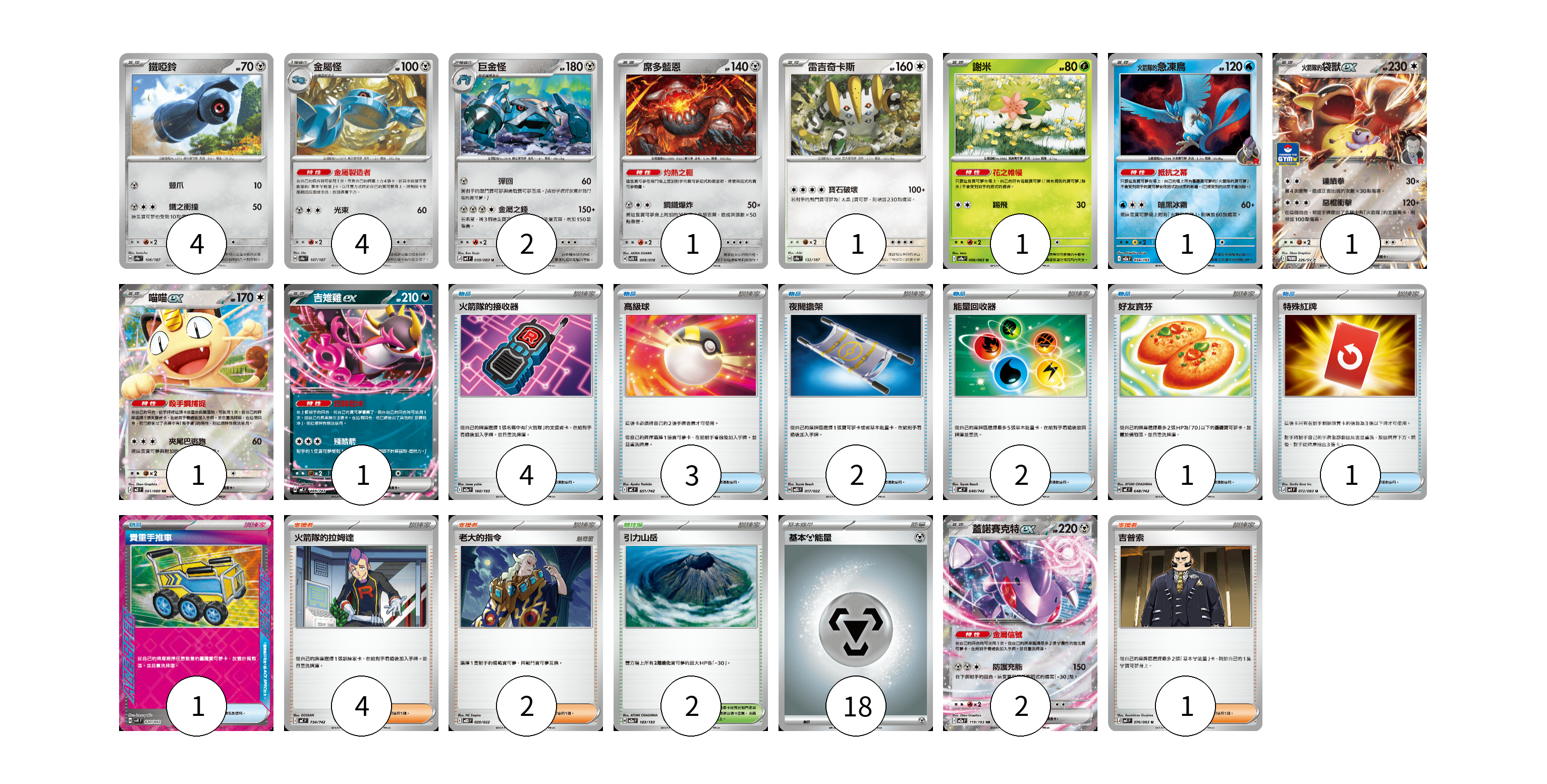 牌組構築方案 以此牌組為基礎新構築牌組 顯示卡面 顯示列表 寶可夢卡(19) 4 4 2 1 1 1 1 1 1 1 2 物品卡(14) 4 3 2 2 1 1 1 支援者卡(7) 4 2 1 競技場卡(2) 2 能量卡(18) 18 寶可夢卡(19) 卡牌名稱 張數 卡牌名稱 張數 鐵啞鈴 SV8a 106/187 04 金屬怪 SV8a 107/187 04 巨金怪 M4 059/083 02 席多藍恩 SVTH 005/018 01 雷吉奇卡斯 SV8a 132/187 01 謝米 SV9a 006/063 01 <火箭隊的>急凍鳥 M2a 034/193 01 <火箭隊的>袋獸ex SV-P 226/SV-P 01 喵喵ex M3 061/080 01 吉雉雞ex MC 489/742 01 蓋諾賽克特ex M2a 119/193 02 物品卡(14) 卡牌名稱 張數 卡牌名稱 張數 火箭隊的接收器 M2a 160/193 04 高級球 MC 651/742 03 夜間擔架 MBG 017/022 02 能量回收器 MC 640/742 02 好友寶芬 MC 648/742 01 特殊紅牌 M4 072/083 01 貴重手推車 SVK 020/042 01 支援者卡(7) 卡牌名稱 張數 卡牌名稱 張數 火箭隊的拉姆達 MC 734/742 04 老大的指令 MBD 020/022 02 吉普索 M4 076/083 01 競技場卡(2) 卡牌名稱 張數 卡牌名稱 張數 引力山岳 M2a 183/193 02 能量卡(18) 卡牌名稱 張數 卡牌名稱 張數 基本【鋼】能量 M-P MET 18 以此牌組為基礎新構築牌組 牌組編碼 YRbQzx-QunbPB-OZBwNc copy 列印牌組單 牌組編碼已複製 分享至SNS