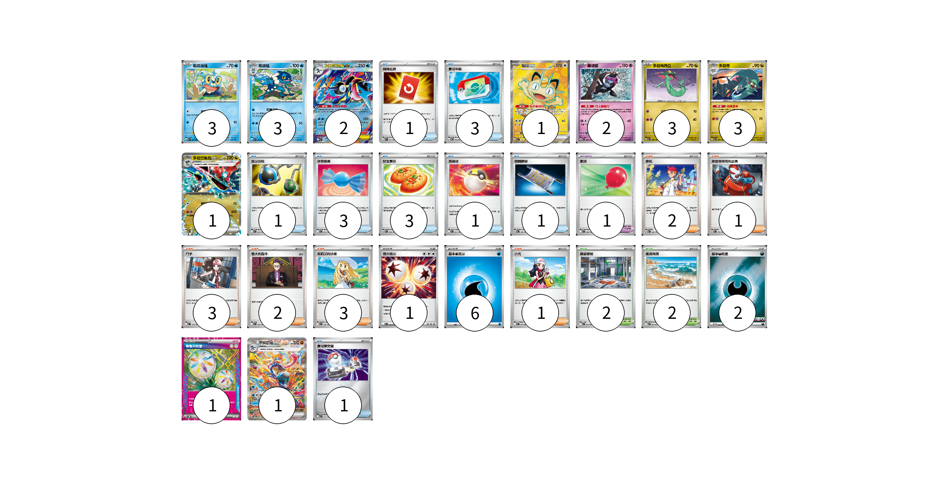 牌組構築方案 以此牌組為基礎新構築牌組 顯示卡面 顯示列表 寶可夢卡(19) 3 3 2 1 2 3 3 1 1 寶可夢道具(1) 1 物品卡(14) 1 3 1 3 3 1 1 1 支援者卡(12) 2 1 3 2 3 1 競技場卡(4) 2 2 能量卡(10) 1 6 2 1 寶可夢卡(19) 卡牌名稱 張數 卡牌名稱 張數 呱呱泡蛙 M4 020/083 03 呱頭蛙 M4 021/083 03 超級甲賀忍蛙ex M4 022/083 02 喵喵ex M3 100/080 01 願增猿 MC 358/742 02 多龍梅西亞 MC 546/742 03 多龍奇 MC 547/742 03 多龍巴魯托ex MC 548/742 01 甲賀忍蛙ex SV5a 090/066 01 寶可夢道具(1) 卡牌名稱 張數 卡牌名稱 張數 氣球 MC 688/742 01 物品卡(14) 卡牌名稱 張數 卡牌名稱 張數 特殊紅牌 M4 072/083 01 寶可平板 M3 070/080 03 能量回收 MC 636/742 01 神奇糖果 MC 655/742 03 好友寶芬 MC 648/742 03 高級球 MC 651/742 01 夜間擔架 MC 670/742 01 寶可夢交替 MC 663/742 01 支援者卡(12) 卡牌名稱 張數 卡牌名稱 張數 赤松 MC 696/742 02 庫瑟洛斯奇的企圖 MC 705/742 01 鬥子 MC 718/742 03 老大的指令 MC 724/742 02 莉莉艾的決意 MC 729/742 03 小光 M2 077/080 01 競技場卡(4) 卡牌名稱 張數 卡牌名稱 張數 險惡廢墟 M1L 063/063 02 衝浪海灘 M1S 062/063 02 能量卡(10) 卡牌名稱 張數 卡牌名稱 張數 燃火能量 MC 736/742 01 基本【水】能量 MC WAT 06 基本【惡】能量 M-P 034/M-P 02 新衝天能量 SV5K 071/071 01 以此牌組為基礎新構築牌組 牌組編碼 YRkbLH-sWXASJ-wJtSjl copy 列印牌組單 牌組編碼已複製 分享至SNS