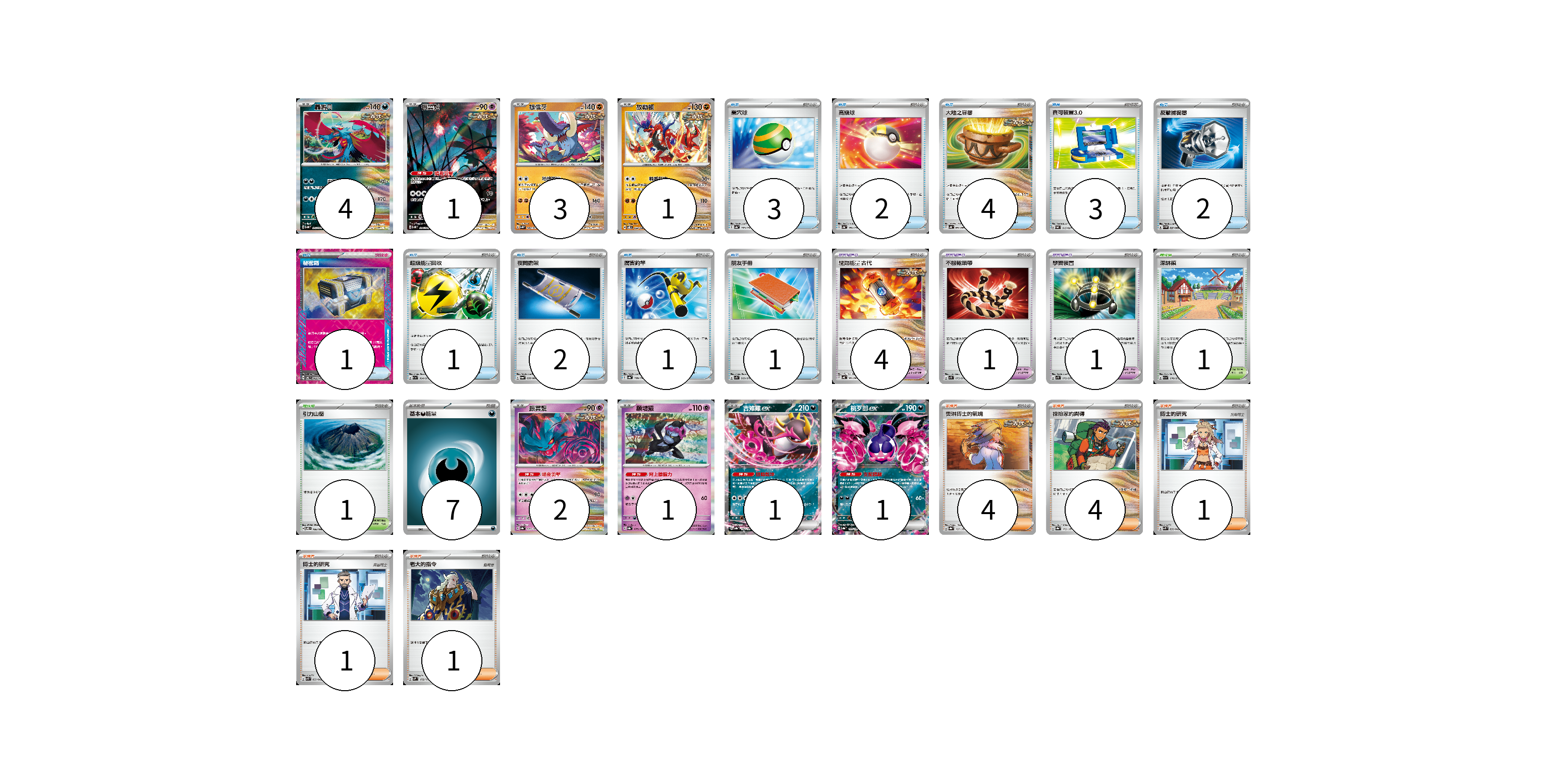 牌組構築方案 以此牌組為基礎新構築牌組 顯示卡面 顯示列表 寶可夢卡(14) 4 1 3 1 2 1 1 1 寶可夢道具(6) 4 1 1 物品卡(20) 3 2 4 3 2 1 1 2 1 1 支援者卡(11) 4 4 1 1 1 競技場卡(2) 1 1 能量卡(7) 7 寶可夢卡(14) 卡牌名稱 張數 卡牌名稱 張數 轟鳴月 SV5K 051/071 04 振翼髮 SV5K 076/071 01 雄偉牙 SV5K 042/071 03 故勒頓 SV8 069/106 01 振翼髮 SV8a 072/187 02 願增猿 SV8a 075/187 01 吉雉雞ex SV8a 104/187 01 桃歹郎ex SV8a 105/187 01 寶可夢道具(6) 卡牌名稱 張數 卡牌名稱 張數 驅勁能量 古代 SV4K 061/066 04 不服輸頭帶 SV1S 073/078 01 學習裝置 SV1S 072/078 01 物品卡(20) 卡牌名稱 張數 卡牌名稱 張數 巢穴球 SV4a 159/190 03 高級球 SV4a 161/190 02 大地之容器 SV4K 060/066 04 寶可裝置3.0 SVAL 015/021 03 反擊捕捉器 SV4M 059/066 02 秘密箱 SV6 092/101 01 超級能量回收 SV1a 064/073 01 夜間擔架 SV6a 056/064 02 厲害釣竿 SV4a 158/190 01 朋友手冊 SV1S 069/078 01 支援者卡(11) 卡牌名稱 張數 卡牌名稱 張數 奧琳博士的氣魄 SV8a 167/187 04 探險家的嚮導 SV8a 172/187 04 博士的研究 SVK 032/042 01 博士的研究 SVK 033/042 01 老大的指令 SVM 172/175 01 競技場卡(2) 卡牌名稱 張數 卡牌名稱 張數 深缽鎮 SV1a 070/073 01 引力山岳 SV8 106/106 01 能量卡(7) 卡牌名稱 張數 卡牌名稱 張數 基本【惡】能量 SVF DAR 07 以此牌組為基礎新構築牌組 牌組編碼 YRvwuh-CjjzEe-OOcuwa copy 列印牌組單 牌組編碼已複製 分享至SNS