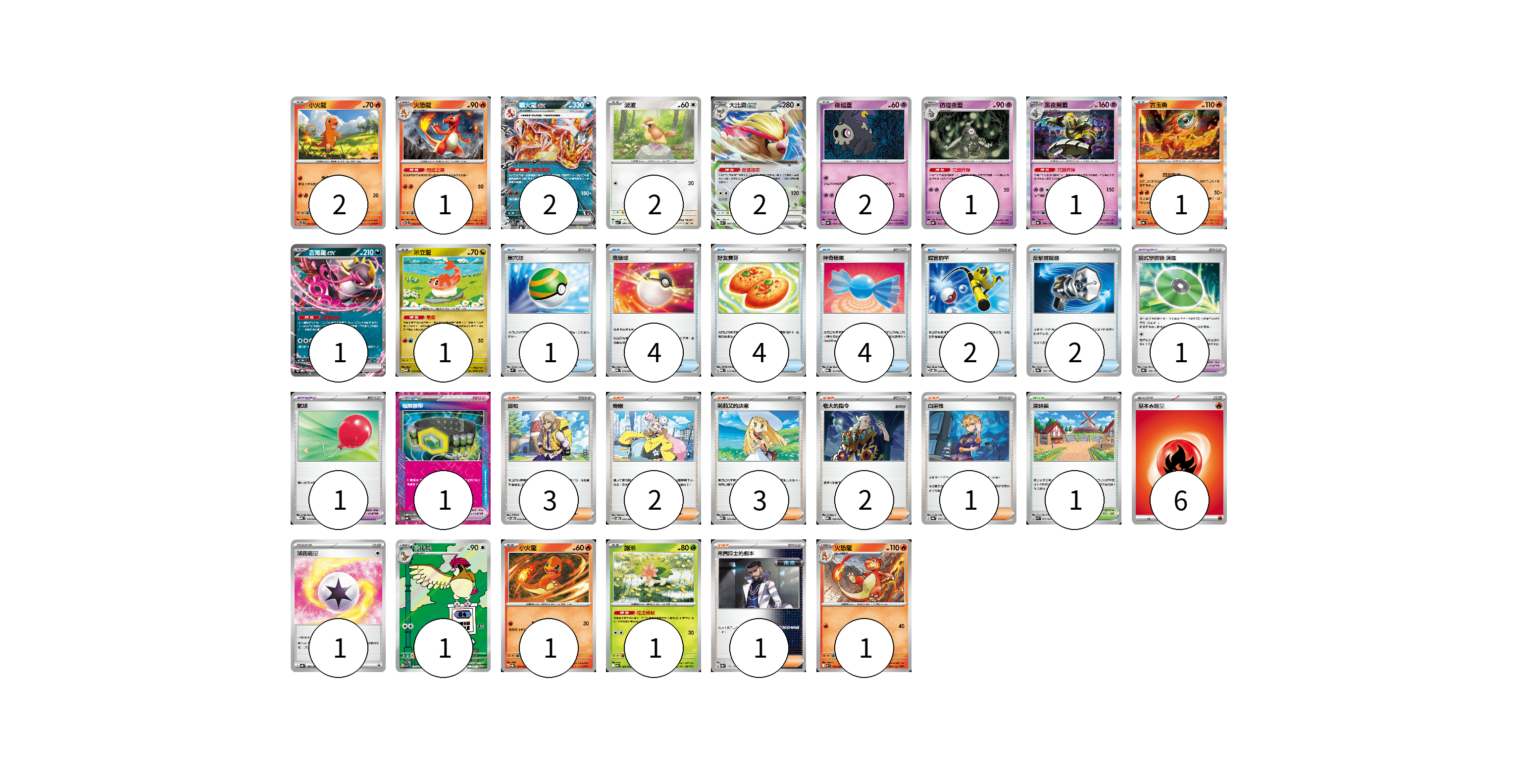 牌組構築方案 以此牌組為基礎新構築牌組 顯示卡面 顯示列表 寶可夢卡(20) 2 1 2 2 2 2 1 1 1 1 1 1 1 1 1 寶可夢道具(3) 1 1 1 物品卡(17) 1 4 4 4 2 2 支援者卡(12) 3 2 3 2 1 1 競技場卡(1) 1 能量卡(7) 6 1 寶可夢卡(20) 卡牌名稱 張數 卡牌名稱 張數 小火龍 SVTL 001/021 02 火恐龍 SVTL 002/021 01 噴火龍ex SVTL 006/021 02 波波 SV3 087/108 02 大比鳥ex SVK 005/042 02 夜巡靈 SV8a 064/187 02 彷徨夜靈 SV8a 065/187 01 黑夜魔靈 SV8a 066/187 01 古玉魚 SV8a 025/187 01 吉雉雞ex SVOD 004/020 01 米立龍 MBD 010/022 01 比比鳥 SV3 119/108 01 小火龍 SVQL 001/022 01 謝米 SV9a 006/063 01 火恐龍 M2 012/080 01 寶可夢道具(3) 卡牌名稱 張數 卡牌名稱 張數 招式學習器 演進 SV8a 160/187 01 氣球 MBD 018/022 01 極限腰帶 SV8a 159/187 01 物品卡(17) 卡牌名稱 張數 卡牌名稱 張數 巢穴球 SVM 133/175 01 高級球 MBD 014/022 04 好友寶芬 MBD 013/022 04 神奇糖果 MBG 013/022 04 厲害釣竿 SVOD 010/020 02 反擊捕捉器 SV8a 139/187 02 支援者卡(12) 卡牌名稱 張數 卡牌名稱 張數 派帕 SVOD 018/020 03 奇樹 SVOD 016/020 02 莉莉艾的決意 MBD 021/022 03 老大的指令 MBD 020/022 02 白蕾雅 SV8a 176/187 01 弗圖博士的劇本 SV8a 175/187 01 競技場卡(1) 卡牌名稱 張數 卡牌名稱 張數 深缽鎮 SVK 039/042 01 能量卡(7) 卡牌名稱 張數 卡牌名稱 張數 基本火能量 sv-p FIR 06 薄霧能量 SV8a 186/187 01 以此牌組為基礎新構築牌組 牌組編碼 YVZCPi-BBXAuk-puLcfh copy 列印牌組單 牌組編碼已複製 分享至SNS