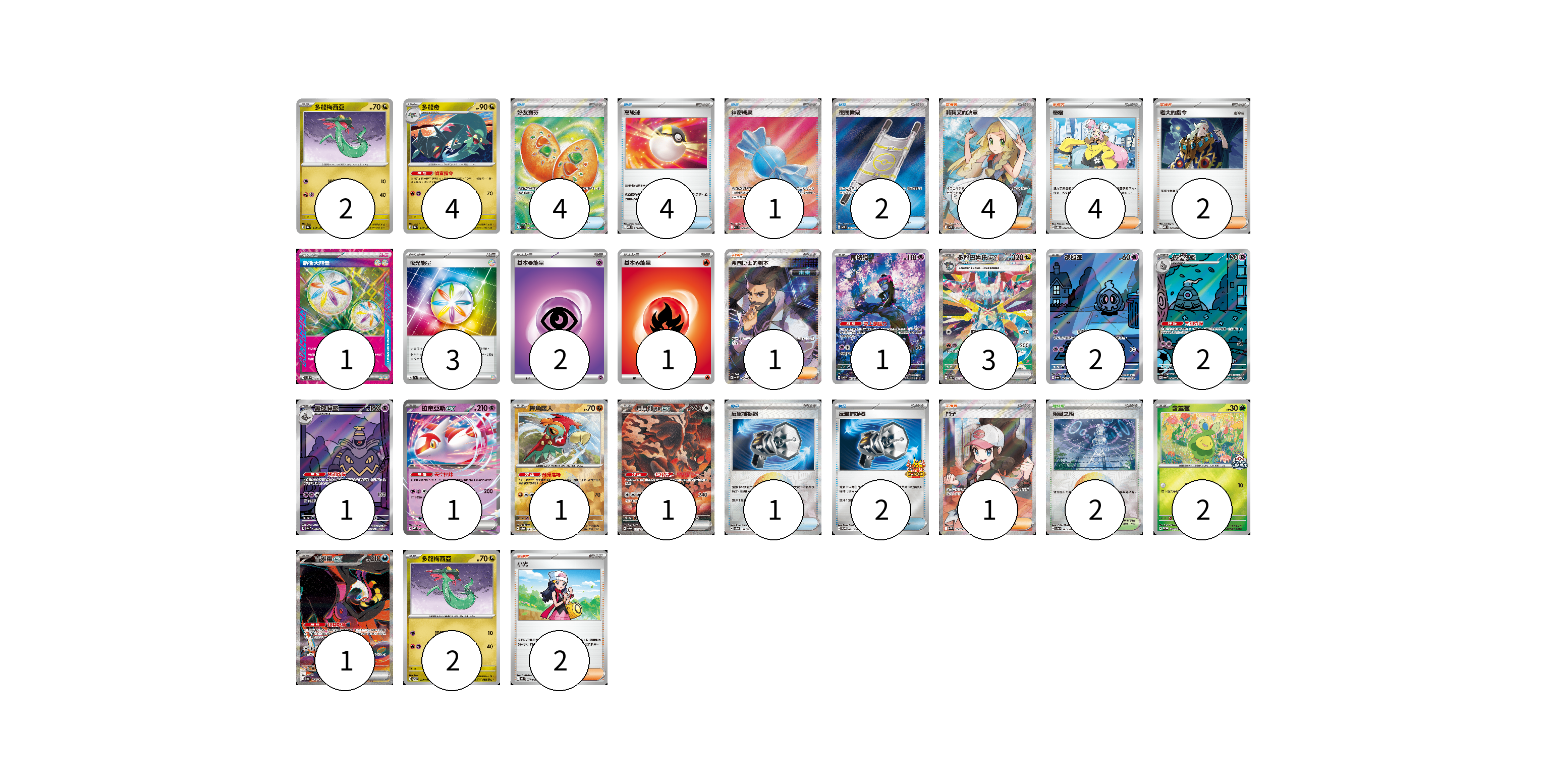 牌組構築方案 以此牌組為基礎新構築牌組 顯示卡面 顯示列表 寶可夢卡(23) 2 4 1 3 2 2 1 1 1 1 2 1 2 物品卡(14) 4 4 1 2 1 2 支援者卡(14) 4 4 2 1 1 2 競技場卡(2) 2 能量卡(7) 1 3 2 1 寶可夢卡(23) 卡牌名稱 張數 卡牌名稱 張數 多龍梅西亞 SV8a 118/187 02 多龍奇 SV8a 119/187 04 願增猿 SV6 107/101 01 多龍巴魯托ex SV8a 221/187 03 夜巡靈 SV6a 068/064 02 彷徨夜靈 SV6a 069/064 02 黑夜魔靈 SV6a 070/064 01 拉帝亞斯ex MBD 003/022 01 摔角鷹人 SV8a 084/187 01 月月熊 赫月ex SV8a 225/187 01 含羞苞 M-P 037/M-P 02 吉雉雞ex SV6a 089/064 01 多龍梅西亞 SV6 079/101 02 物品卡(14) 卡牌名稱 張數 卡牌名稱 張數 好友寶芬 M1S 081/063 04 高級球 MBD 014/022 04 神奇糖果 M1S 082/063 01 夜間擔架 M1L 083/063 02 反擊捕捉器 SV8a 139/187 01 反擊捕捉器 SV-P 083/SV-P 02 支援者卡(14) 卡牌名稱 張數 卡牌名稱 張數 莉莉艾的決意 M1L 086/063 04 奇樹 SVOD 016/020 04 老大的指令 MBD 020/022 02 弗圖博士的劇本 SV4M 086/066 01 鬥子 SV11W 166/086 01 小光 M2 077/080 02 競技場卡(2) 卡牌名稱 張數 卡牌名稱 張數 阻礙之塔 SV8a 181/187 02 能量卡(7) 卡牌名稱 張數 卡牌名稱 張數 新衝天能量 SV5K 071/071 01 夜光能量 SV1a 073/073 03 基本【超】能量 SVB PSY 02 基本【火】能量 SVAL FIR 01 以此牌組為基礎新構築牌組 牌組編碼 YbAMzg-aJUuJb-RlsWvj copy 列印牌組單 牌組編碼已複製 分享至SNS