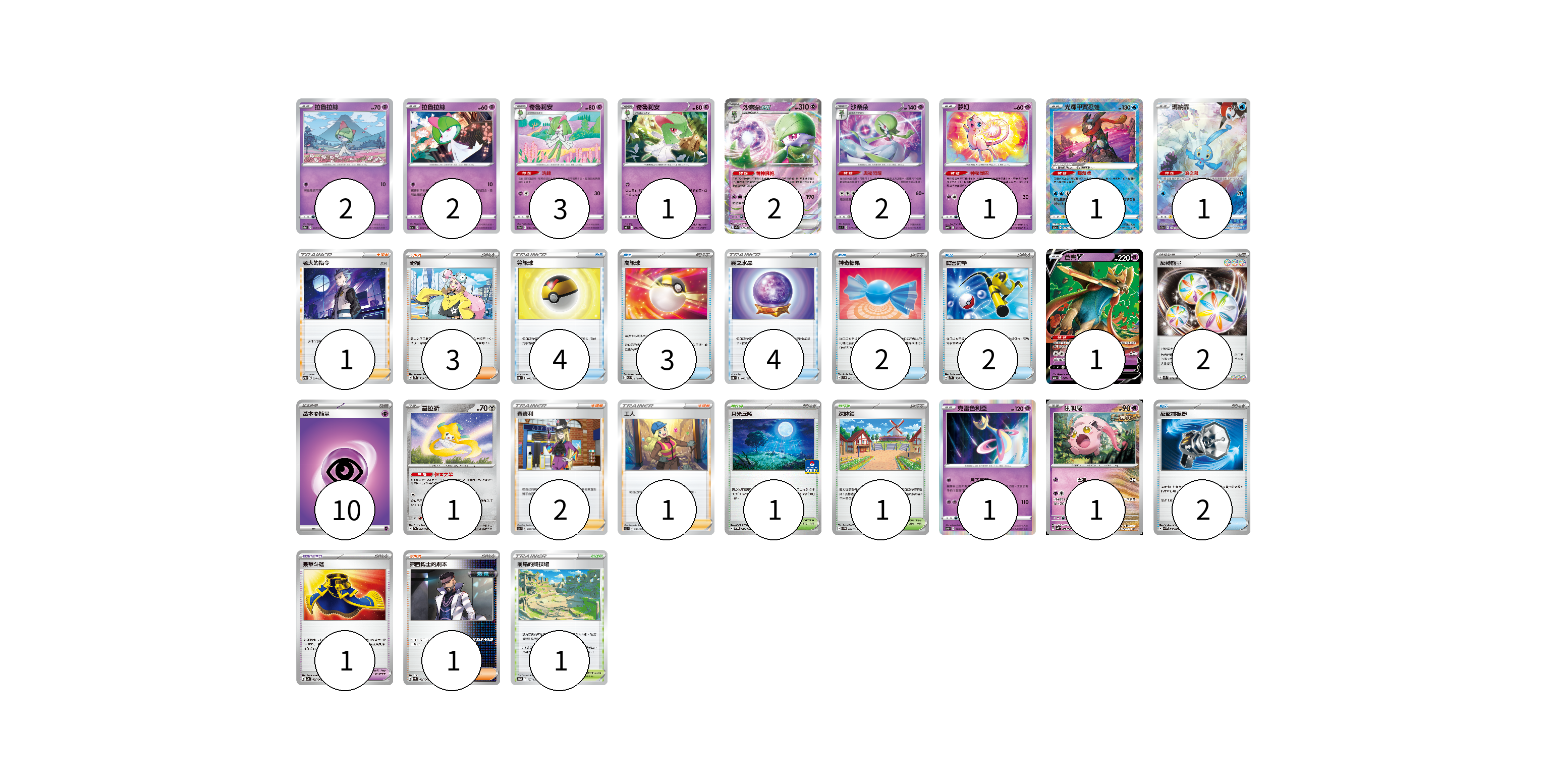 牌組構築方案 以此牌組為基礎新構築牌組 顯示卡面 顯示列表 寶可夢卡(19) 2 2 3 1 2 2 1 1 1 1 1 1 1 寶可夢道具(1) 1 物品卡(17) 4 3 4 2 2 2 支援者卡(8) 1 3 2 1 1 競技場卡(3) 1 1 1 能量卡(12) 2 10 寶可夢卡(19) 卡牌名稱 張數 卡牌名稱 張數 拉魯拉絲 S9a 032/067 02 拉魯拉絲 S11a 036/068 02 奇魯莉安 S11a 037/068 03 奇魯莉安 S6H 034/070 01 沙奈朵ex SV1S 028/078 02 沙奈朵 SI 177/414 02 夢幻 SVB 011/028 01 光輝甲賀忍蛙 S12a 033/172 01 瑪納霏 S12a 178/172 01 蒼響V S12a 067/172 01 基拉祈 SV3a 042/062 01 克雷色利亞 S10D 028/067 01 吼叫尾 SV4K 032/066 01 寶可夢道具(1) 卡牌名稱 張數 卡牌名稱 張數 豪華斗篷 SV3a 055/062 01 物品卡(17) 卡牌名稱 張數 卡牌名稱 張數 等級球 SVB 015/028 04 高級球 SVC 014/021 03 霧之水晶 SVB 013/028 04 神奇糖果 SVB 003/028 02 厲害釣竿 SV2P 066/071 02 反擊捕捉器 SV4M 059/066 02 支援者卡(8) 卡牌名稱 張數 卡牌名稱 張數 老大的指令(赤日) SVB 024/028 01 奇樹 SV2D 069/071 03 賽寶利 S5a 068/070 02 工人 S12 093/098 01 弗圖博士的劇本 SV4M 065/066 01 競技場卡(3) 卡牌名稱 張數 卡牌名稱 張數 月光丘陵 SV-P 049/SV-P 01 深缽鎮 SVF 036/038 01 崩塌的競技場 S12a 167/172 01 能量卡(12) 卡牌名稱 張數 卡牌名稱 張數 反轉能量 SV2P 071/071 02 基本【超】能量 SVB PSY 10 以此牌組為基礎新構築牌組 牌組編碼 YbDkoJ-eLVGTY-spBAfK copy 列印牌組單 牌組編碼已複製 分享至SNS