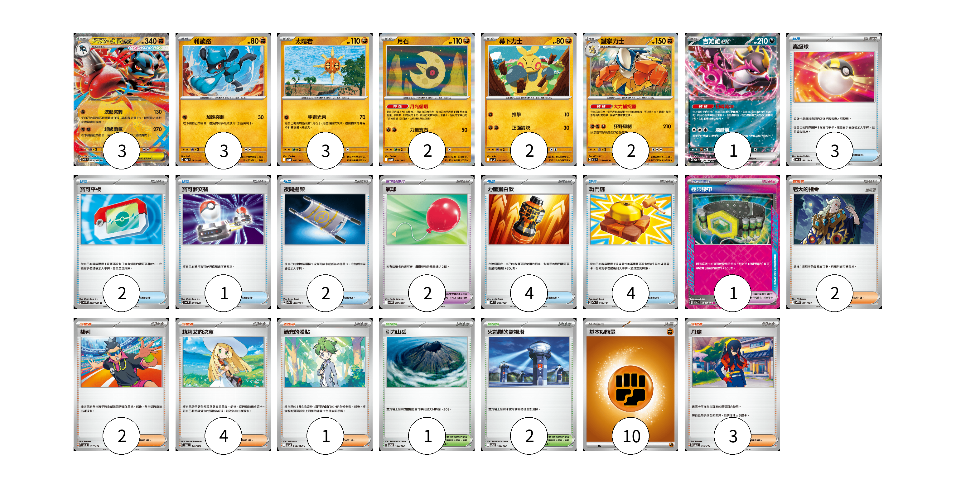 牌組構築方案 以此牌組為基礎新構築牌組 顯示卡面 顯示列表 寶可夢卡(16) 3 3 3 2 2 2 1 寶可夢道具(3) 2 1 物品卡(16) 3 2 1 2 4 4 支援者卡(12) 2 2 4 1 3 競技場卡(3) 1 2 能量卡(10) 10 寶可夢卡(16) 卡牌名稱 張數 卡牌名稱 張數 超級路卡利歐ex M1L 029/063 03 利歐路 M2a 091/193 03 太陽岩 M2a 087/193 03 月石 M2a 086/193 02 幕下力士 M1L 024/063 02 鐵掌力士 M1L 025/063 02 吉雉雞ex M2a 114/193 01 寶可夢道具(3) 卡牌名稱 張數 卡牌名稱 張數 氣球 MBD 018/022 02 極限腰帶 SV8a 159/187 01 物品卡(16) 卡牌名稱 張數 卡牌名稱 張數 高級球 MC 651/742 03 寶可平板 M3 070/080 02 寶可夢交替 MC 663/742 01 夜間擔架 SVOM 016/021 02 力量蛋白飲 MC 652/742 04 戰鬥鑼 M2a 155/193 04 支援者卡(12) 卡牌名稱 張數 卡牌名稱 張數 老大的指令 MBG 021/022 02 裁判 MC 711/742 02 莉莉艾的決意 M2a 175/193 04 滿充的體貼 M1S 060/063 01 丹瑜 MC 715/742 03 競技場卡(3) 卡牌名稱 張數 卡牌名稱 張數 引力山岳 M2a 183/193 01 火箭隊的監視塔 M2a 189/193 02 能量卡(10) 卡牌名稱 張數 卡牌名稱 張數 基本【鬥】能量 MC FIG 10 以此牌組為基礎新構築牌組 牌組編碼 Ybjumr-PRYjiT-ePvGVA copy 列印牌組單 牌組編碼已複製 分享至SNS