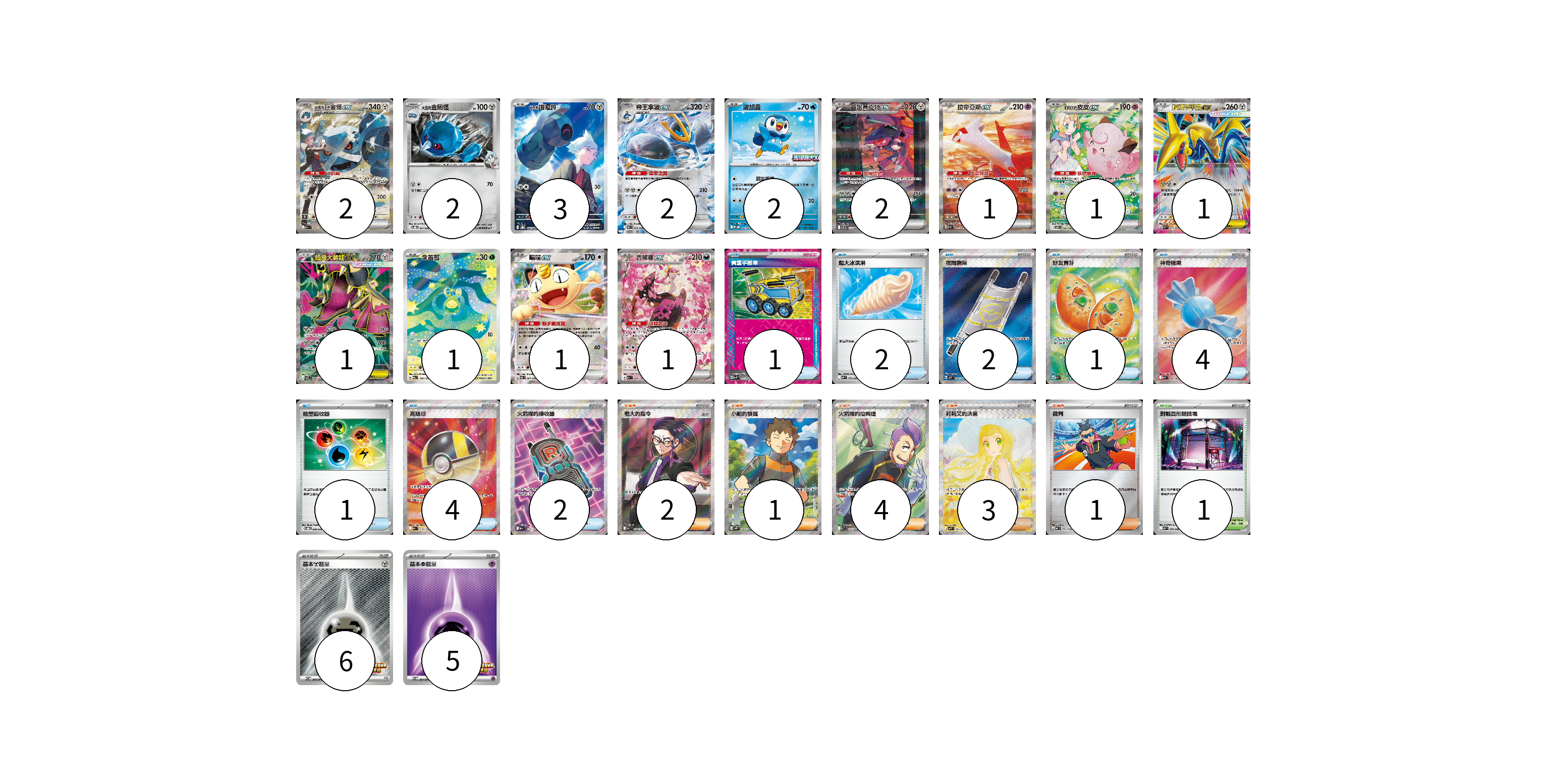牌組構築方案 以此牌組為基礎新構築牌組 顯示卡面 顯示列表 寶可夢卡(20) 2 2 3 2 2 2 1 1 1 1 1 1 1 物品卡(17) 1 2 2 1 4 1 4 2 支援者卡(11) 2 1 4 3 1 競技場卡(1) 1 能量卡(11) 6 5 寶可夢卡(20) 卡牌名稱 張數 卡牌名稱 張數 <大吾的>巨金怪ex M2a 245/193 02 <大吾的>金屬怪 SVOD 007/020 02 <大吾的>鐵啞鈴 SVOD 021/020 03 帝王拿波ex M2 058/080 02 波加曼 M-P 023/M-P 02 蓋諾賽克特ex SV11B 172/086 02 拉帝亞斯ex SV7a 087/064 01 莉莉艾的皮皮ex SV9 126/100 01 超級盔甲鳥ex M3 054/080 01 超級大嘴娃ex M1L 080/063 01 含羞苞 M2a 196/193 01 喵喵ex M3 061/080 01 吉雉雞ex M2a 244/193 01 物品卡(17) 卡牌名稱 張數 卡牌名稱 張數 貴重手推車 SVK 020/042 01 超大冰淇淋 M2 073/080 02 夜間擔架 M1L 083/063 02 好友寶芬 M1S 081/063 01 神奇糖果 M1S 082/063 04 能量回收器 SVOD 009/020 01 高級球 M2a 216/193 04 火箭隊的接收器 M2a 217/193 02 支援者卡(11) 卡牌名稱 張數 卡牌名稱 張數 老大的指令(烏羽) MC 760/742 02 小剛的發掘 SV9 123/100 01 火箭隊的拉姆達 SV10 122/098 04 莉莉艾的決意 M1L 091/063 03 裁判 MC 711/742 01 競技場卡(1) 卡牌名稱 張數 卡牌名稱 張數 對戰圓形競技場 M2 079/080 01 能量卡(11) 卡牌名稱 張數 卡牌名稱 張數 基本【鋼】能量 SV-P 264/SV-P 06 基本【超】能量 SV-P 261/SV-P 05 以此牌組為基礎新構築牌組 牌組編碼 YbrMey-OWCgtn-GiuuAh copy 列印牌組單 牌組編碼已複製 分享至SNS