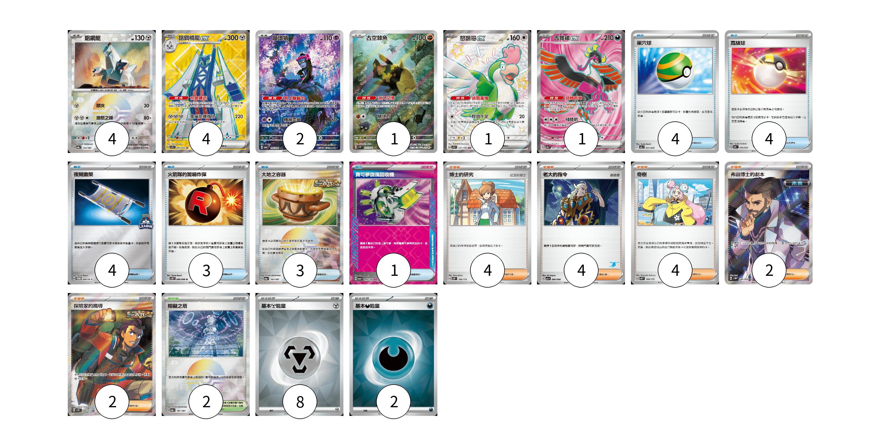 牌組構築方案 以此牌組為基礎新構築牌組 顯示卡面 顯示列表 寶可夢卡(13) 4 4 2 1 1 1 物品卡(19) 4 4 4 3 3 1 支援者卡(16) 4 4 4 2 2 競技場卡(2) 2 能量卡(10) 8 2 寶可夢卡(13) 卡牌名稱 張數 卡牌名稱 張數 鋁鋼龍 SV8a 112/187 04 鋁鋼橋龍ex SV7a 080/064 04 願增猿 SV6 107/101 02 古空棘魚 SV5K 077/071 01 怒鸚哥ex SV4a 337/190 01 吉雉雞ex SV6a 081/064 01 物品卡(19) 卡牌名稱 張數 卡牌名稱 張數 巢穴球 SVEL 011/020 04 高級球 SVHK 013/022 04 夜間擔架 SV-P 204/SV-P 04 火箭隊的驚嚇炸彈 SV10 089/098 03 大地之容器 SV8a 143/187 03 寶可夢旋風回收機 SV6 093/101 01 支援者卡(16) 卡牌名稱 張數 卡牌名稱 張數 博士的研究 SVM 166/175 04 老大的指令 SVI 066/066 04 奇樹 SVM 160/175 04 弗圖博士的劇本 SV4M 086/066 02 探險家的嚮導 SV5K 090/071 02 競技場卡(2) 卡牌名稱 張數 卡牌名稱 張數 阻礙之塔 SV8a 181/187 02 能量卡(10) 卡牌名稱 張數 卡牌名稱 張數 基本【鋼】能量 SVOD MET 08 基本【惡】能量 SVOM DAR 02 以此牌組為基礎新構築牌組 牌組編碼 YcZxYT-RuumRy-qRITpy copy 列印牌組單 牌組編碼已複製 分享至SNS