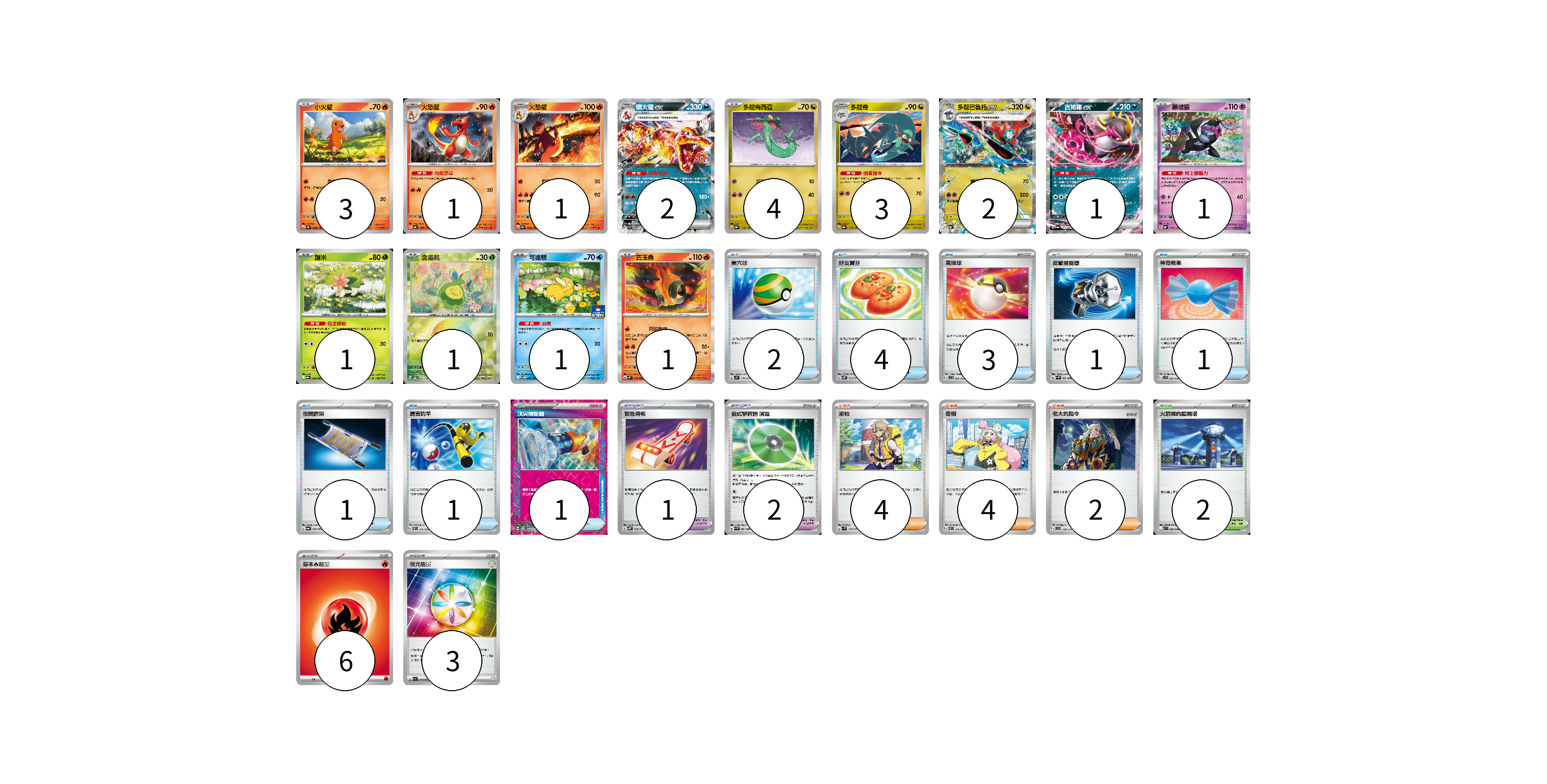 牌組構築方案 以此牌組為基礎新構築牌組 顯示卡面 顯示列表 寶可夢卡(23) 3 1 1 2 4 3 2 1 1 1 1 1 1 1 寶可夢道具(3) 1 2 物品卡(13) 2 4 3 1 1 1 1 支援者卡(10) 4 4 2 競技場卡(2) 2 能量卡(9) 6 3 寶可夢卡(23) 卡牌名稱 張數 卡牌名稱 張數 小火龍 SV2a 004/165 03 火恐龍 SV4a 026/190 01 火恐龍 SV2a 005/165 01 噴火龍ex SV3 066/108 02 多龍梅西亞 SV8a 118/187 04 多龍奇 SV8a 119/187 03 多龍巴魯托ex SV8a 120/187 02 吉雉雞ex SV6a 038/064 01 願增猿 SV8a 075/187 01 謝米 SV9a 006/063 01 含羞苞 SV8a 001/187 01 可達鴨 SV-P 220/SV-P 01 古玉魚 SV4K 016/066 01 厲害釣竿 SVEL 010/020 01 寶可夢道具(3) 卡牌名稱 張數 卡牌名稱 張數 緊急滑板 SV5K 064/071 01 招式學習器 演進 SV4M 063/066 02 物品卡(13) 卡牌名稱 張數 卡牌名稱 張數 巢穴球 SV1S 070/078 02 好友寶芬 SV5K 063/071 04 高級球 SVB 002/028 03 反擊捕捉器 SV4M 059/066 01 神奇糖果 SVB 003/028 01 夜間擔架 SV6a 056/064 01 頂尖捕捉器 SV5M 062/071 01 支援者卡(10) 卡牌名稱 張數 卡牌名稱 張數 派帕 SV1V 076/078 04 奇樹 SVEL 016/020 04 老大的指令(魁奇思) SVD 138/139 02 競技場卡(2) 卡牌名稱 張數 卡牌名稱 張數 火箭隊的監視塔 SV10 096/098 02 能量卡(9) 卡牌名稱 張數 卡牌名稱 張數 基本火能量 sv-p FIR 06 夜光能量 SV1a 073/073 03 以此牌組為基礎新構築牌組 牌組編碼 YeJQWq-JuISqg-DzYhLG copy 列印牌組單 牌組編碼已複製 分享至SNS