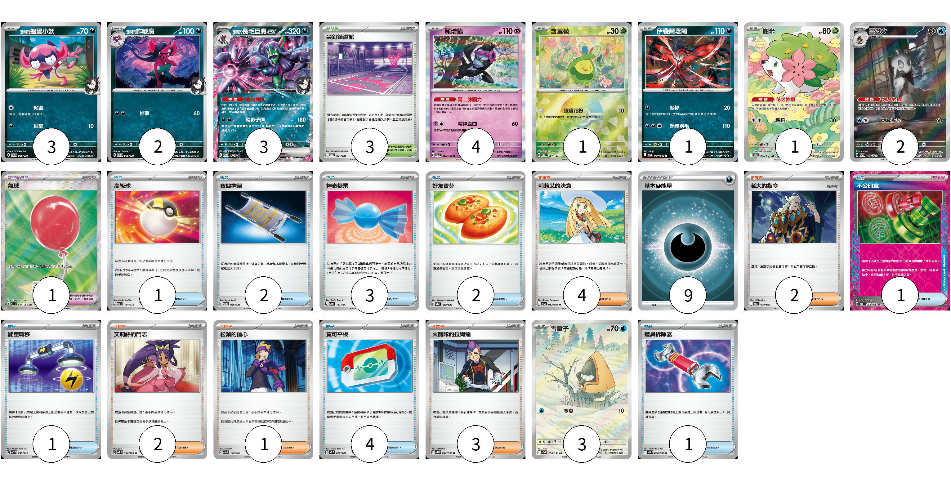 牌組構築方案 以此牌組為基礎新構築牌組 顯示卡面 顯示列表 寶可夢卡(20) 3 2 3 4 1 1 1 2 3 寶可夢道具(1) 1 物品卡(15) 1 2 3 2 1 1 4 1 支援者卡(12) 4 2 2 1 3 競技場卡(3) 3 能量卡(9) 9 寶可夢卡(20) 卡牌名稱 張數 卡牌名稱 張數 <瑪俐的>搗蛋小妖 SVOM 005/021 03 <瑪俐的>詐唬魔 SVOM 006/021 02 <瑪俐的>長毛巨魔ex SVOM 007/021 03 願增猿 SV6 055/101 04 含羞苞 SV8a 001/187 01 伊裴爾塔爾 M1L 040/063 01 謝米 SV9a 066/063 01 雪妖女 SV6 104/101 02 雪童子 M2a 200/193 03 寶可夢道具(1) 卡牌名稱 張數 卡牌名稱 張數 氣球 M1L 084/063 01 物品卡(15) 卡牌名稱 張數 卡牌名稱 張數 高級球 SVM 134/175 01 夜間擔架 SVOM 016/021 02 神奇糖果 SV4a 163/190 03 好友寶芬 SVTS 012/022 02 不公印章 SV5a 053/066 01 能量轉移 MC 638/742 01 寶可平板 MC 662/742 04 道具拆除器 SV11W 080/086 01 支援者卡(12) 卡牌名稱 張數 卡牌名稱 張數 莉莉艾的決意 M1L 062/063 04 老大的指令 MBD 020/022 02 艾莉絲的鬥志 SV9 094/100 02 松葉的信心 SV8a 178/187 01 火箭隊的拉姆達 SV10 094/098 03 競技場卡(3) 卡牌名稱 張數 卡牌名稱 張數 尖釘鎮道館 SVOM 021/021 03 能量卡(9) 卡牌名稱 張數 卡牌名稱 張數 基本惡能量 SLD DAR 09 以此牌組為基礎新構築牌組 牌組編碼 YelbNE-FEhnBr-bdNSfS copy 列印牌組單 牌組編碼已複製 分享至SNS