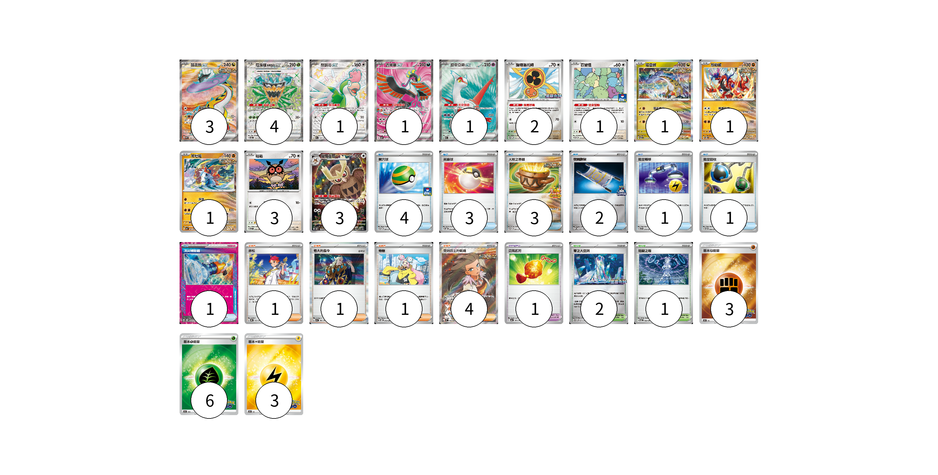 牌組構築方案 以此牌組為基礎新構築牌組 顯示卡面 顯示列表 寶可夢卡(22) 3 4 1 1 1 2 1 1 1 1 3 3 寶可夢道具(1) 1 物品卡(15) 4 3 3 2 1 1 1 支援者卡(7) 1 1 1 4 競技場卡(3) 2 1 能量卡(12) 3 6 3 寶可夢卡(22) 卡牌名稱 張數 卡牌名稱 張數 猛雷鼓ex SV5K 089/071 03 厄鬼椪 碧草面具ex SV6 114/101 04 怒鸚哥ex SV4a 337/190 01 吉雉雞ex SV6a 081/064 01 拉帝亞斯ex SV7a 078/064 01 旋轉洛托姆 SV-P 146/SV-P 02 百變怪 SV-P 111/SV-P 01 猛雷鼓 SV7 075/102 01 故勒頓 SV8 069/106 01 爬地翅 SV4K 041/066 01 咕咕 SV7 076/102 03 貓頭夜鷹 SV7 114/102 03 寶可夢道具(1) 卡牌名稱 張數 卡牌名稱 張數 勇氣護符 SV4a 169/190 01 物品卡(15) 卡牌名稱 張數 卡牌名稱 張數 巢穴球 SV-P 091/SV-P 04 高級球 SVOD 012/020 03 大地之容器 SV-P 084/SV-P 03 夜間擔架 SV-P 204/SV-P 02 能量轉移 SVTR 010/021 01 能量回收 SVTM 009/022 01 頂尖捕捉器 SV5M 062/071 01 支援者卡(7) 卡牌名稱 張數 卡牌名稱 張數 赤松 SV8a 163/187 01 老大的指令 SV4a 181/190 01 奇樹 SVOD 016/020 01 奧琳博士的氣魄 SV4K 085/066 04 競技場卡(3) 卡牌名稱 張數 卡牌名稱 張數 零之大空洞 SV-P 151/SV-P 02 阻礙之塔 SV6 100/101 01 能量卡(12) 卡牌名稱 張數 卡牌名稱 張數 基本鬥能量 S10b FIG 03 基本草能量 S10b GRA 06 基本雷能量 S10b LIG 03 以此牌組為基礎新構築牌組 牌組編碼 YfiZSB-WQafah-kNgwch copy 列印牌組單 牌組編碼已複製 分享至SNS