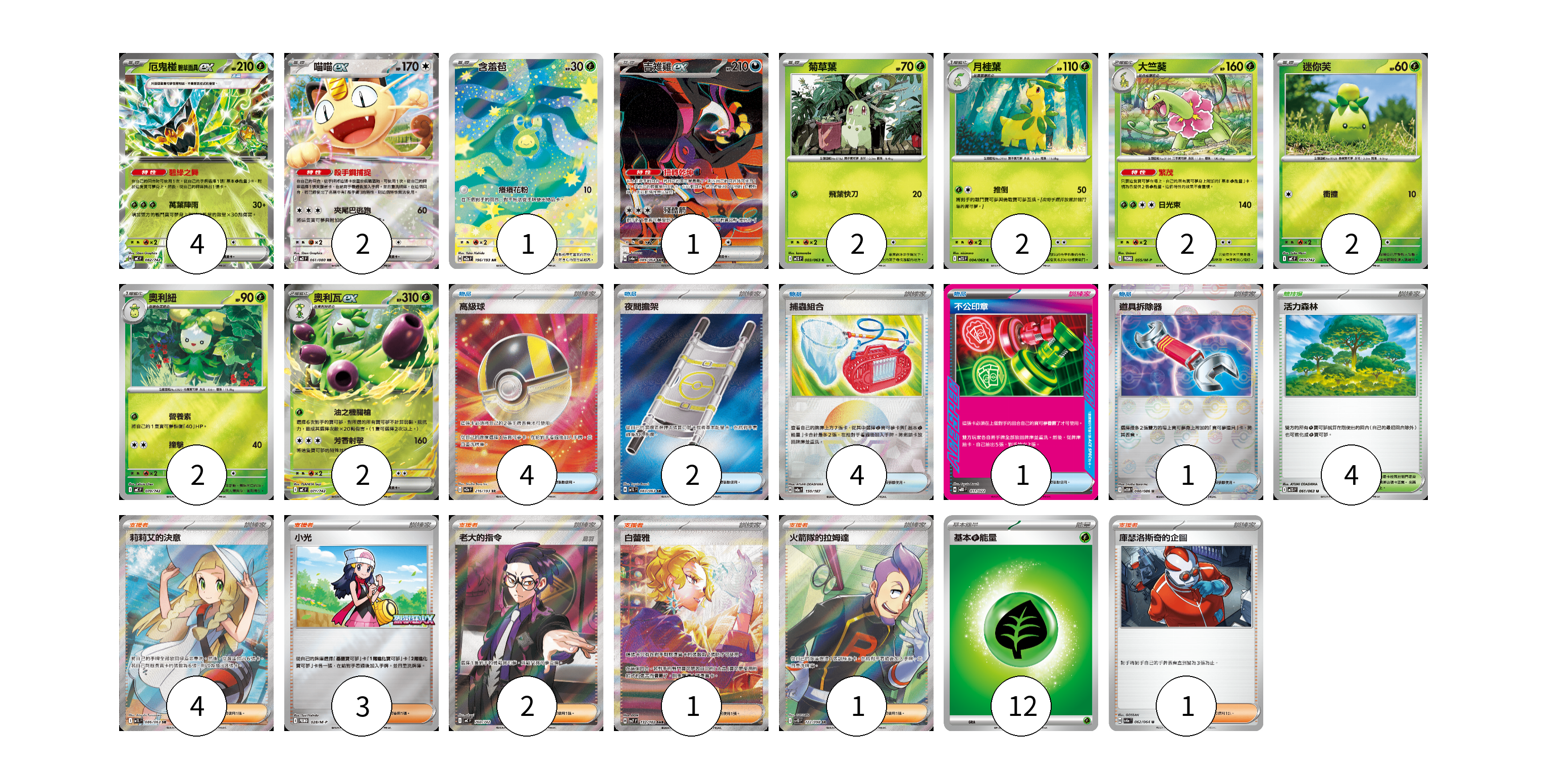 牌組構築方案 以此牌組為基礎新構築牌組 顯示卡面 顯示列表 寶可夢卡(20) 4 2 1 1 2 2 2 2 2 2 物品卡(12) 4 2 4 1 1 支援者卡(12) 4 3 2 1 1 1 競技場卡(4) 4 能量卡(12) 12 寶可夢卡(20) 卡牌名稱 張數 卡牌名稱 張數 厄鬼椪 碧草面具ex MC 082/742 04 喵喵ex M3 061/080 02 含羞苞 M2a 196/193 01 吉雉雞ex SV6a 089/064 01 菊草葉 M1S 003/063 02 月桂葉 M1S 004/063 02 大竺葵 M-P 055/M-P 02 迷你芙 MC 069/742 02 奧利紐 MC 070/742 02 奧利瓦ex MC 071/742 02 物品卡(12) 卡牌名稱 張數 卡牌名稱 張數 高級球 M2a 216/193 04 夜間擔架 M1L 083/063 02 捕蟲組合 SV8a 150/187 04 不公印章 MBD 011/022 01 道具拆除器 SV11W 080/086 01 支援者卡(12) 卡牌名稱 張數 卡牌名稱 張數 莉莉艾的決意 M1L 086/063 04 小光 M-P 028/M-P 03 老大的指令(烏羽) MC 760/742 02 白蕾雅 SV7 132/102 01 火箭隊的拉姆達 SV10 122/098 01 庫瑟洛斯奇的企圖 SV6a 062/064 01 競技場卡(4) 卡牌名稱 張數 卡牌名稱 張數 活力森林 M1S 061/063 04 能量卡(12) 卡牌名稱 張數 卡牌名稱 張數 基本【草】能量 MJ GRA 12 以此牌組為基礎新構築牌組 牌組編碼 YhUfOA-zXsBJc-FYCTBe copy 列印牌組單 牌組編碼已複製 分享至SNS