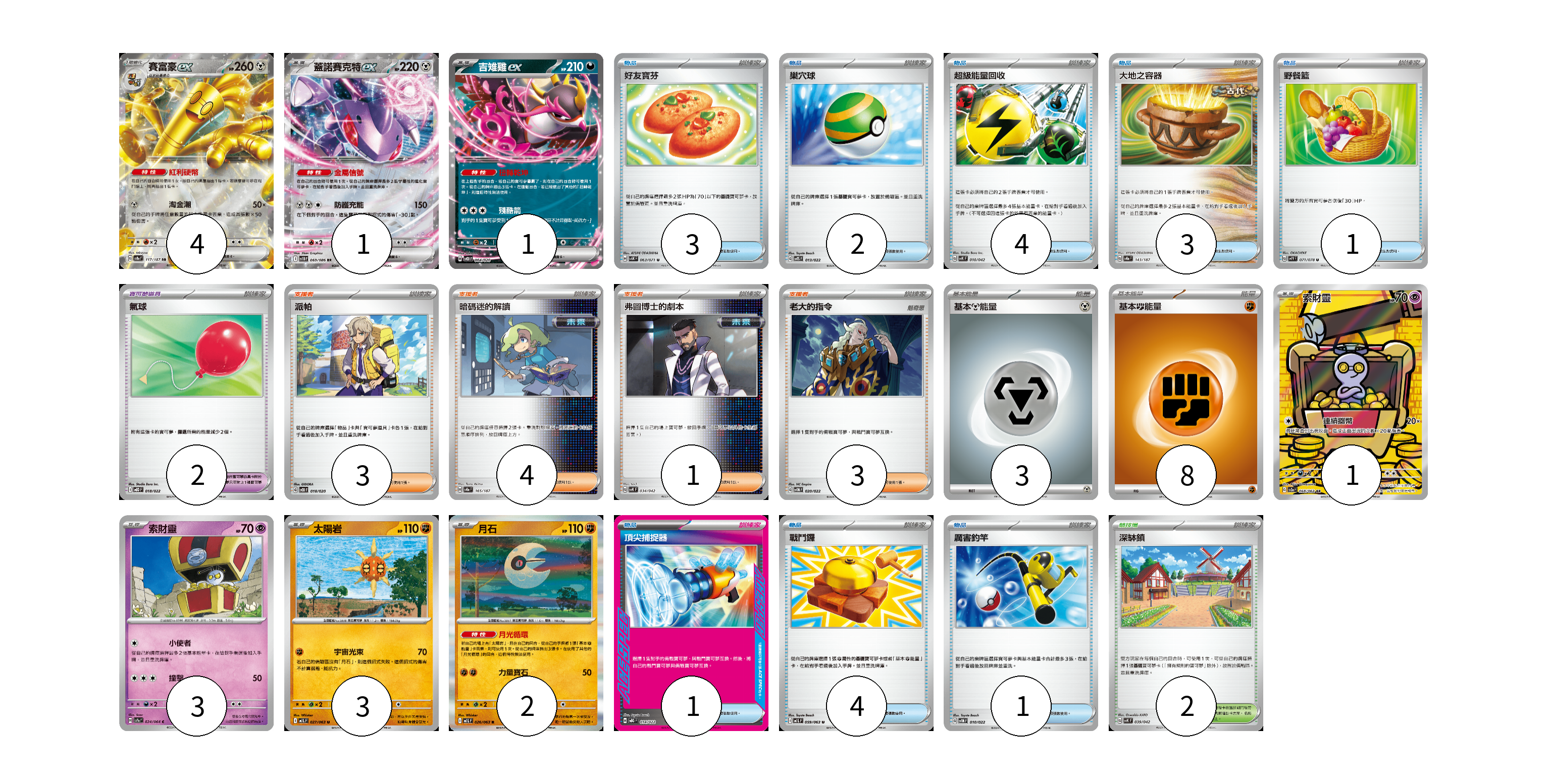 牌組構築方案 以此牌組為基礎新構築牌組 顯示卡面 顯示列表 寶可夢卡(15) 4 1 1 1 3 3 2 寶可夢道具(2) 2 物品卡(19) 3 2 4 3 1 1 4 1 支援者卡(11) 3 4 1 3 競技場卡(2) 2 能量卡(11) 3 8 寶可夢卡(15) 卡牌名稱 張數 卡牌名稱 張數 賽富豪ex SV8a 117/187 04 蓋諾賽克特ex SV11B 069/086 01 吉雉雞ex SVOD 004/020 01 索財靈 SV3a 068/062 01 索財靈 SV7a 024/064 03 太陽岩 M1L 027/063 03 月石 M1L 026/063 02 寶可夢道具(2) 卡牌名稱 張數 卡牌名稱 張數 氣球 MBD 018/022 02 物品卡(19) 卡牌名稱 張數 卡牌名稱 張數 好友寶芬 SV5K 063/071 03 巢穴球 SVTS 013/022 02 超級能量回收 SVK 010/042 04 大地之容器 SV8a 143/187 03 野餐籃 SV1V 071/078 01 頂尖捕捉器 MBG 014/022 01 戰鬥鑼 M1L 059/063 04 厲害釣竿 SVTM 010/022 01 支援者卡(11) 卡牌名稱 張數 卡牌名稱 張數 派帕 SVOD 018/020 03 暗碼迷的解讀 SV8a 165/187 04 弗圖博士的劇本 SVK 034/042 01 老大的指令 SVTM 020/022 03 競技場卡(2) 卡牌名稱 張數 卡牌名稱 張數 深缽鎮 SVK 039/042 02 能量卡(11) 卡牌名稱 張數 卡牌名稱 張數 基本【鋼】能量 SVTH MET 03 基本【鬥】能量 SVD FIG 08 以此牌組為基礎新構築牌組 牌組編碼 YkBmMb-giyice-KSlmlG copy 列印牌組單 牌組編碼已複製 分享至SNS