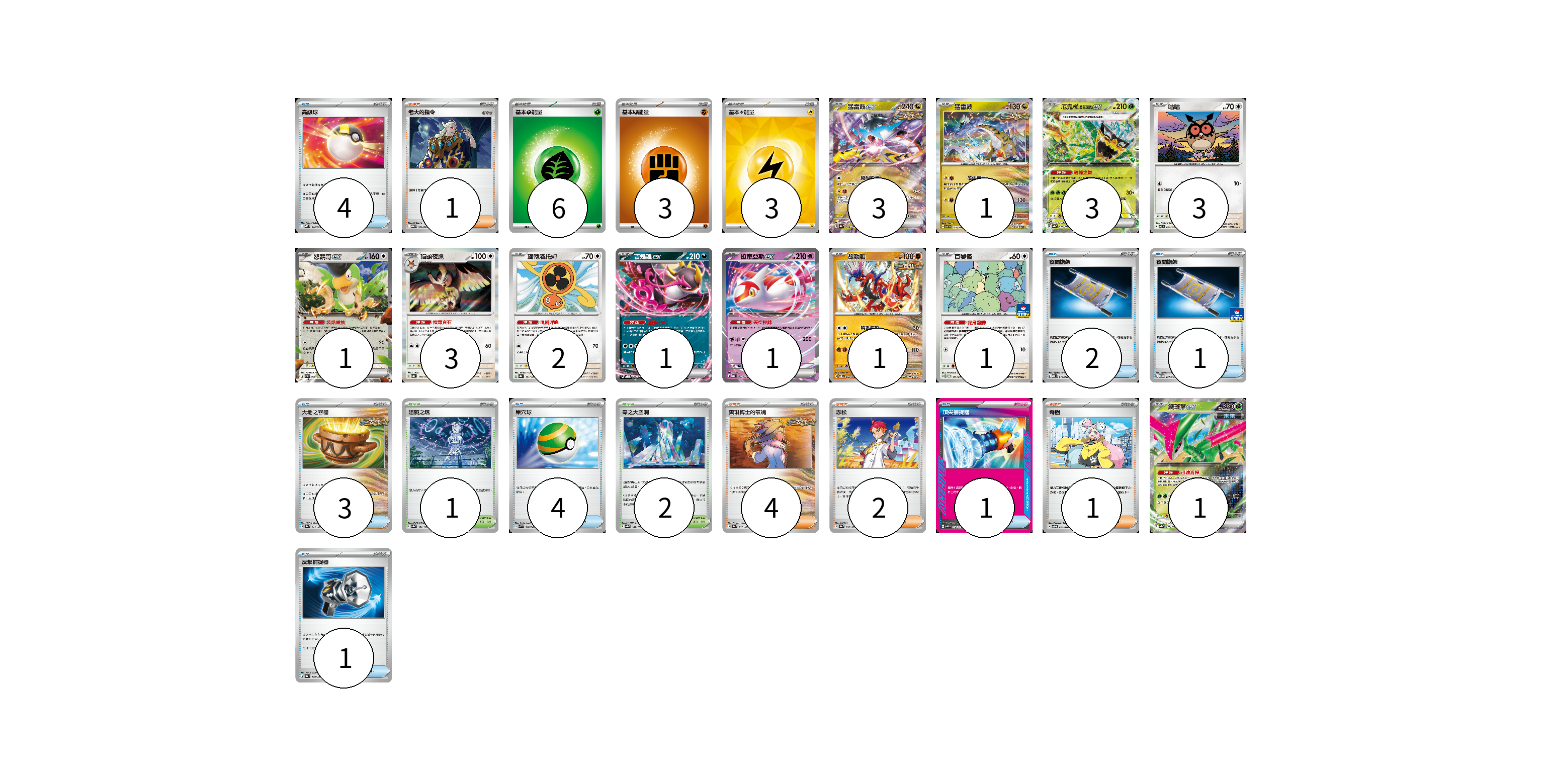 牌組構築方案 以此牌組為基礎新構築牌組 顯示卡面 顯示列表 寶可夢卡(21) 3 1 3 3 1 3 2 1 1 1 1 1 物品卡(16) 4 2 1 3 4 1 1 支援者卡(8) 1 4 2 1 競技場卡(3) 1 2 能量卡(12) 6 3 3 寶可夢卡(21) 卡牌名稱 張數 卡牌名稱 張數 猛雷鼓ex SV8a 124/187 03 猛雷鼓 SV7 075/102 01 厄鬼椪 碧草面具ex SV8a 020/187 03 咕咕 SV7 076/102 03 怒鸚哥ex SVK 006/042 01 貓頭夜鷹 SV8a 128/187 03 旋轉洛托姆 SV8a 131/187 02 吉雉雞ex SVOD 004/020 01 拉帝亞斯ex MBD 003/022 01 故勒頓 SV8 069/106 01 百變怪 SV-P 111/SV-P 01 鐵斑葉ex SV8a 016/187 01 物品卡(16) 卡牌名稱 張數 卡牌名稱 張數 高級球 MBD 014/022 04 夜間擔架 MBD 016/022 02 夜間擔架 SV-P 227/SV-P 01 大地之容器 SV8a 143/187 03 巢穴球 SVK 016/042 04 頂尖捕捉器 MBG 014/022 01 反擊捕捉器 SV8a 139/187 01 支援者卡(8) 卡牌名稱 張數 卡牌名稱 張數 老大的指令 MBG 021/022 01 奧琳博士的氣魄 SV8a 167/187 04 赤松 SV8a 163/187 02 奇樹 SVOD 016/020 01 競技場卡(3) 卡牌名稱 張數 卡牌名稱 張數 阻礙之塔 SV8a 181/187 01 零之大空洞 SV8a 182/187 02 能量卡(12) 卡牌名稱 張數 卡牌名稱 張數 基本【草】能量 M-P GRA 06 基本【鬥】能量 M-P FIG 03 基本【雷】能量 SVQP LIG 03 以此牌組為基礎新構築牌組 牌組編碼 YlKclN-deytEb-fNOCkZ copy 列印牌組單 牌組編碼已複製 分享至SNS