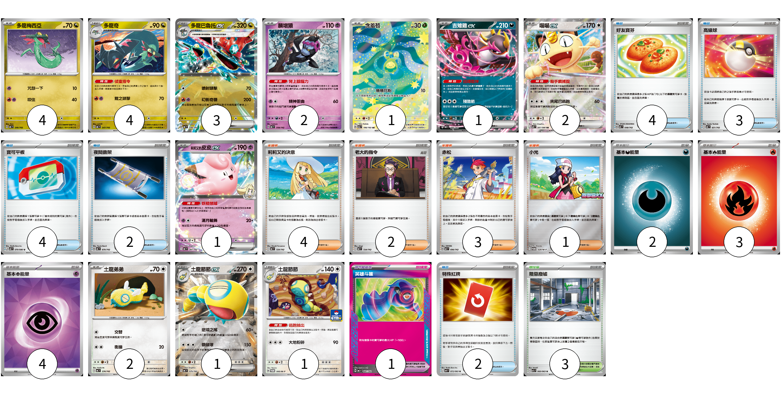 牌組構築方案 以此牌組為基礎新構築牌組 顯示卡面 顯示列表 寶可夢卡(22) 4 4 3 2 1 1 2 1 2 1 1 寶可夢道具(1) 1 物品卡(15) 4 3 4 2 2 支援者卡(10) 4 2 3 1 競技場卡(3) 3 能量卡(9) 2 3 4 寶可夢卡(22) 卡牌名稱 張數 卡牌名稱 張數 多龍梅西亞 MC 546/742 04 多龍奇 MC 547/742 04 多龍巴魯托ex MC 548/742 03 願增猿 MC 358/742 02 含羞苞 M2a 196/193 01 吉雉雞ex MC 489/742 01 喵喵ex M3 061/080 02 <莉莉艾的>皮皮ex MC 287/742 01 土龍弟弟 MC 574/742 02 土龍節節ex MC 575/742 01 土龍節節 M-P 045/M-P 01 寶可夢道具(1) 卡牌名稱 張數 卡牌名稱 張數 英雄斗篷 MC 687/742 01 物品卡(15) 卡牌名稱 張數 卡牌名稱 張數 好友寶芬 MC 648/742 04 高級球 MC 651/742 03 寶可平板 M3 070/080 04 夜間擔架 MC 670/742 02 特殊紅牌 M4 072/083 02 支援者卡(10) 卡牌名稱 張數 卡牌名稱 張數 莉莉艾的決意 MC 729/742 04 老大的指令 MC 724/742 02 赤松 MC 696/742 03 小光 M-P 028/M-P 01 競技場卡(3) 卡牌名稱 張數 卡牌名稱 張數 險惡廢墟 M1L 063/063 03 能量卡(9) 卡牌名稱 張數 卡牌名稱 張數 基本【惡】能量 MC DAR 02 基本【火】能量 MC FIR 03 基本【超】能量 SVOD PSY 04 以此牌組為基礎新構築牌組 牌組編碼 YmocuD-GOfGmA-rYjPzX copy 列印牌組單 牌組編碼已複製 分享至SNS