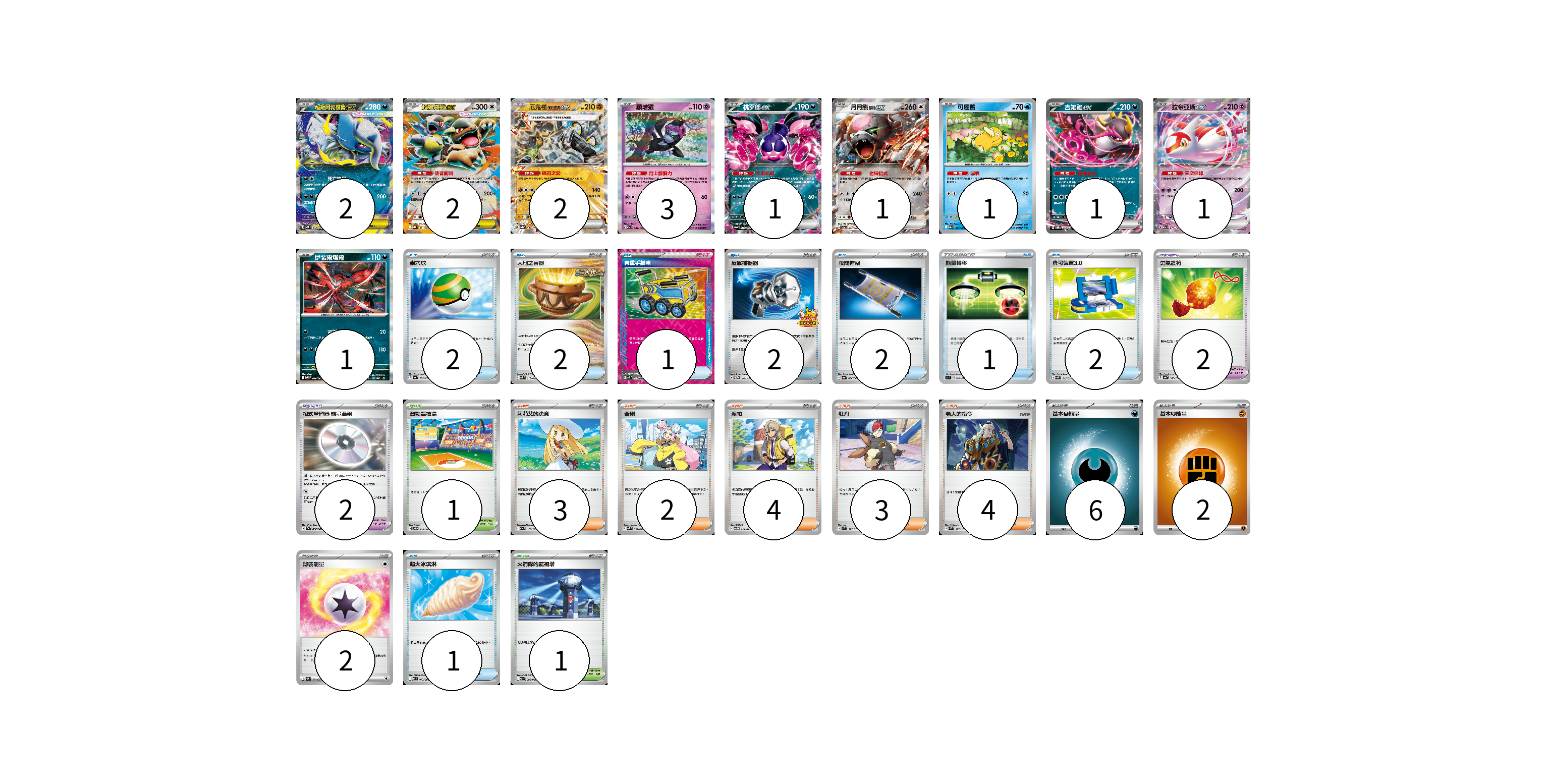 牌組構築方案 以此牌組為基礎新構築牌組 顯示卡面 顯示列表 寶可夢卡(15) 2 2 2 3 1 1 1 1 1 1 寶可夢道具(4) 2 2 物品卡(13) 2 2 1 2 2 1 2 1 支援者卡(16) 3 2 4 3 4 競技場卡(2) 1 1 能量卡(10) 6 2 2 寶可夢卡(15) 卡牌名稱 張數 卡牌名稱 張數 超級阿勃梭魯ex M1L 038/063 02 超級袋獸ex M1S 051/063 02 厄鬼椪 礎石面具ex SV8a 091/187 02 願增猿 M2a 081/193 03 桃歹郎ex SV6a 039/064 01 月月熊 赫月 ex SV5a 052/066 01 可達鴨 M2a 032/193 01 吉雉雞ex SVOM 009/021 01 拉帝亞斯ex M2a 075/193 01 伊裴爾塔爾 M1L 040/063 01 寶可夢道具(4) 卡牌名稱 張數 卡牌名稱 張數 勇氣護符 SV4a 169/190 02 招式學習器 能量渦輪 SV3a 056/062 02 物品卡(13) 卡牌名稱 張數 卡牌名稱 張數 巢穴球 SV4a 159/190 02 大地之容器 SVK 012/042 02 貴重手推車 SVK 020/042 01 反擊捕捉器 SV-P 083/SV-P 02 夜間擔架 SV6a 056/064 02 能量轉移 SI 366/414 01 寶可裝置3.0 SVAL 015/021 02 超大冰淇淋 M2 073/080 01 支援者卡(16) 卡牌名稱 張數 卡牌名稱 張數 莉莉艾的決意 M2a 175/193 03 奇樹 SVK 031/042 02 派帕 SVTM 019/022 04 牡丹 SV1S 077/078 03 老大的指令 SVM 172/175 04 競技場卡(2) 卡牌名稱 張數 卡牌名稱 張數 激動競技場 SV8 105/106 01 火箭隊的監視塔 SV10 096/098 01 能量卡(10) 卡牌名稱 張數 卡牌名稱 張數 基本【惡】能量 MBG DAR 06 基本【鬥】能量 M-P FIG 02 薄霧能量 SV5M 071/071 02 以此牌組為基礎新構築牌組 牌組編碼 YnSGiL-hGpnjD-tKStcI copy 列印牌組單 牌組編碼已複製 分享至SNS