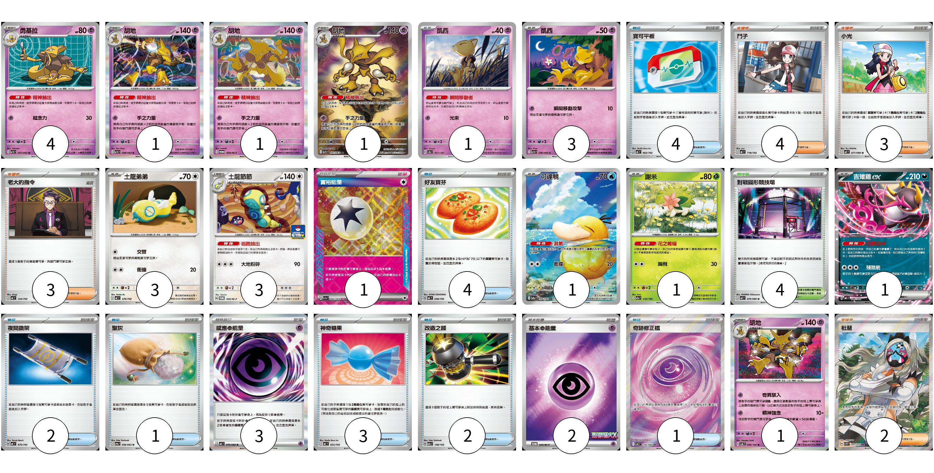 牌組構築方案 以此牌組為基礎新構築牌組 顯示卡面 顯示列表 寶可夢卡(21) 4 1 1 1 1 3 3 3 1 1 1 1 物品卡(17) 4 4 2 1 3 2 1 支援者卡(12) 4 3 3 2 競技場卡(4) 4 能量卡(6) 1 3 2 寶可夢卡(21) 卡牌名稱 張數 卡牌名稱 張數 勇基拉 M1S 037/063 04 胡地 M1S 038/063 01 胡地 M-P 058/M-P 01 胡地 M1S 071/063 01 凱西 SV8a 057/187 01 凱西 M1S 036/063 03 土龍弟弟 MC 574/742 03 土龍節節 M-P 045/M-P 03 可達鴨 M2a 199/193 01 謝米 M2a 012/193 01 吉雉雞ex MC 489/742 01 胡地 SV6 049/101 01 物品卡(17) 卡牌名稱 張數 卡牌名稱 張數 寶可平板 MC 662/742 04 好友寶芬 MC 648/742 04 夜間擔架 MC 670/742 02 聖灰 SV9a 056/063 01 神奇糖果 MC 655/742 03 改造之錘 M2a 148/193 02 奇跡修正檔 M3 104/080 01 支援者卡(12) 卡牌名稱 張數 卡牌名稱 張數 鬥子 MC 718/742 04 小光 M2 077/080 03 老大的指令 MC 724/742 03 枇琶 SV5K 091/071 02 競技場卡(4) 卡牌名稱 張數 卡牌名稱 張數 對戰圓形競技場 M2 079/080 04 能量卡(6) 卡牌名稱 張數 卡牌名稱 張數 富裕能量 SV7a 064/064 01 感應【超】能量 M3 079/080 03 基本【超】能量 M-P 033/M-P 02 以此牌組為基礎新構築牌組 牌組編碼 YoVNWl-JsNqOf-UFaFWC copy 列印牌組單 牌組編碼已複製 分享至SNS