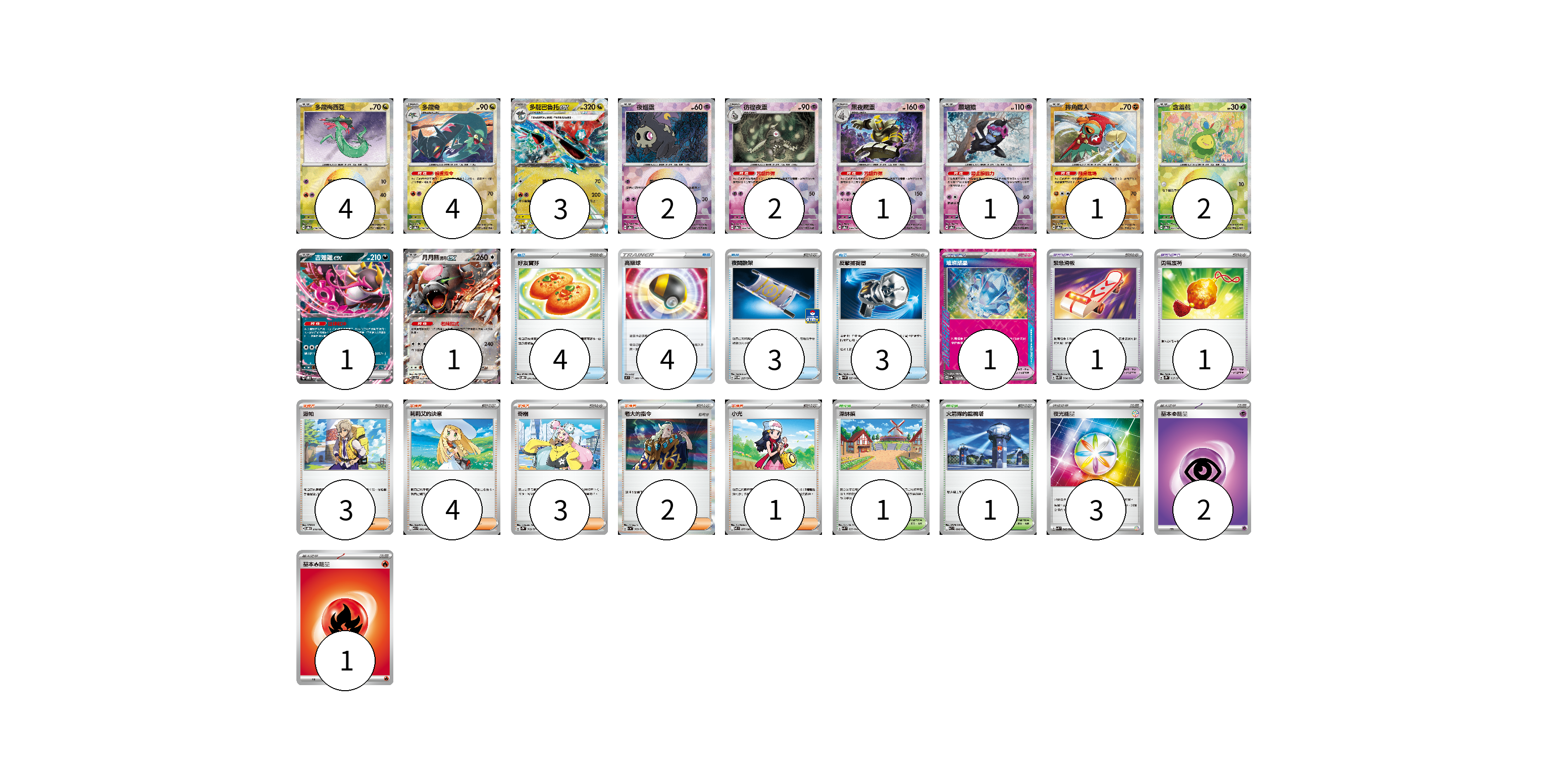 牌組構築方案 以此牌組為基礎新構築牌組 顯示卡面 顯示列表 寶可夢卡(22) 4 4 3 2 2 1 1 1 2 1 1 寶可夢道具(3) 1 1 1 物品卡(14) 4 4 3 3 支援者卡(13) 3 4 3 2 1 競技場卡(2) 1 1 能量卡(6) 3 2 1 寶可夢卡(22) 卡牌名稱 張數 卡牌名稱 張數 多龍梅西亞 SV8a 118/187 04 多龍奇 SV8a 119/187 04 多龍巴魯托ex SV8a 120/187 03 夜巡靈 SV8a 064/187 02 彷徨夜靈 SV8a 065/187 02 黑夜魔靈 SV8a 066/187 01 願增猿 SV8a 075/187 01 摔角鷹人 SV8a 084/187 01 含羞苞 SV8a 001/187 02 吉雉雞ex SVOD 004/020 01 月月熊 赫月 ex SV5a 052/066 01 寶可夢道具(3) 卡牌名稱 張數 卡牌名稱 張數 璀璨結晶 SV8a 152/187 01 緊急滑板 SV5K 064/071 01 勇氣護符 SV2D 067/071 01 物品卡(14) 卡牌名稱 張數 卡牌名稱 張數 好友寶芬 SVOD 011/020 04 高級球 S9 089/100 04 夜間擔架 SV-P 227/SV-P 03 反擊捕捉器 SV4M 059/066 03 支援者卡(13) 卡牌名稱 張數 卡牌名稱 張數 派帕 SVOD 018/020 03 莉莉艾的決意 M1L 062/063 04 奇樹 SV2D 069/071 03 老大的指令 SV1a 069/073 02 小光 M2 077/080 01 競技場卡(2) 卡牌名稱 張數 卡牌名稱 張數 深缽鎮 SVK 039/042 01 火箭隊的監視塔 SV10 096/098 01 能量卡(6) 卡牌名稱 張數 卡牌名稱 張數 夜光能量 SVK 042/042 03 基本超能量 sv-p PSY 02 基本火能量 sv-p FIR 01 以此牌組為基礎新構築牌組 牌組編碼 YonLzb-XoZxmN-TMnLyl copy 列印牌組單 牌組編碼已複製 分享至SNS