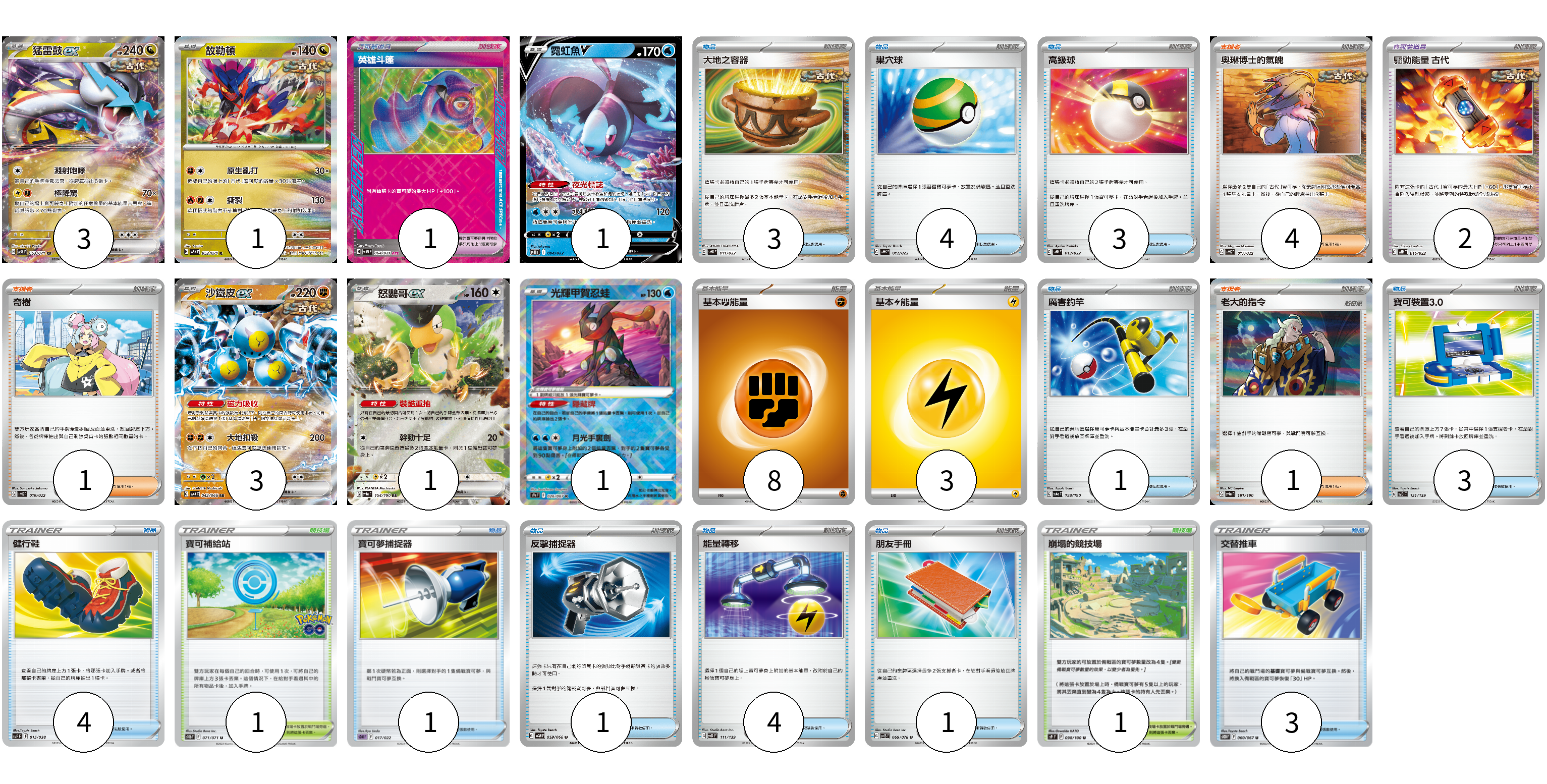 牌組構築方案 以此牌組為基礎新構築牌組 顯示卡面 顯示列表 寶可夢卡(10) 3 1 1 3 1 1 寶可夢道具(3) 1 2 物品卡(28) 3 4 3 1 3 4 1 1 4 1 3 支援者卡(6) 4 1 1 競技場卡(2) 1 1 能量卡(11) 8 3 寶可夢卡(10) 卡牌名稱 張數 卡牌名稱 張數 猛雷鼓ex SV5K 053/071 03 故勒頓 SV5K 052/071 01 霓虹魚V SVHK 004/022 01 沙鐵皮ex SV4K 042/066 03 怒鸚哥ex SV4a 154/190 01 光輝甲賀忍蛙 S9a 026/067 01 寶可夢道具(3) 卡牌名稱 張數 卡牌名稱 張數 英雄斗篷 SV5M 064/071 01 驅勁能量 古代 SVHK 016/022 02 物品卡(28) 卡牌名稱 張數 卡牌名稱 張數 大地之容器 SVHK 011/022 03 巢穴球 SVHK 012/022 04 高級球 SVHK 013/022 03 厲害釣竿 SV4a 158/190 01 寶可裝置3.0 SVD 121/139 03 健行鞋 SVF 015/038 04 寶可夢捕捉器 SDM 017/022 01 反擊捕捉器 SV4M 059/066 01 能量轉移 SVD 111/139 04 朋友手冊 SV1S 069/078 01 交替推車 S10D 060/067 03 支援者卡(6) 卡牌名稱 張數 卡牌名稱 張數 奧琳博士的氣魄 SVHK 017/022 04 奇樹 SVHK 019/022 01 老大的指令 SV4a 181/190 01 競技場卡(2) 卡牌名稱 張數 卡牌名稱 張數 寶可補給站 S10b 071/071 01 崩塌的競技場 S9 098/100 01 能量卡(11) 卡牌名稱 張數 卡牌名稱 張數 基本【鬥】能量 SVF FIG 08 基本【雷】能量 SVF LIG 03 以此牌組為基礎新構築牌組 牌組編碼 YoyAoA-SutpOm-aLyNaF copy 列印牌組單 牌組編碼已複製 分享至SNS