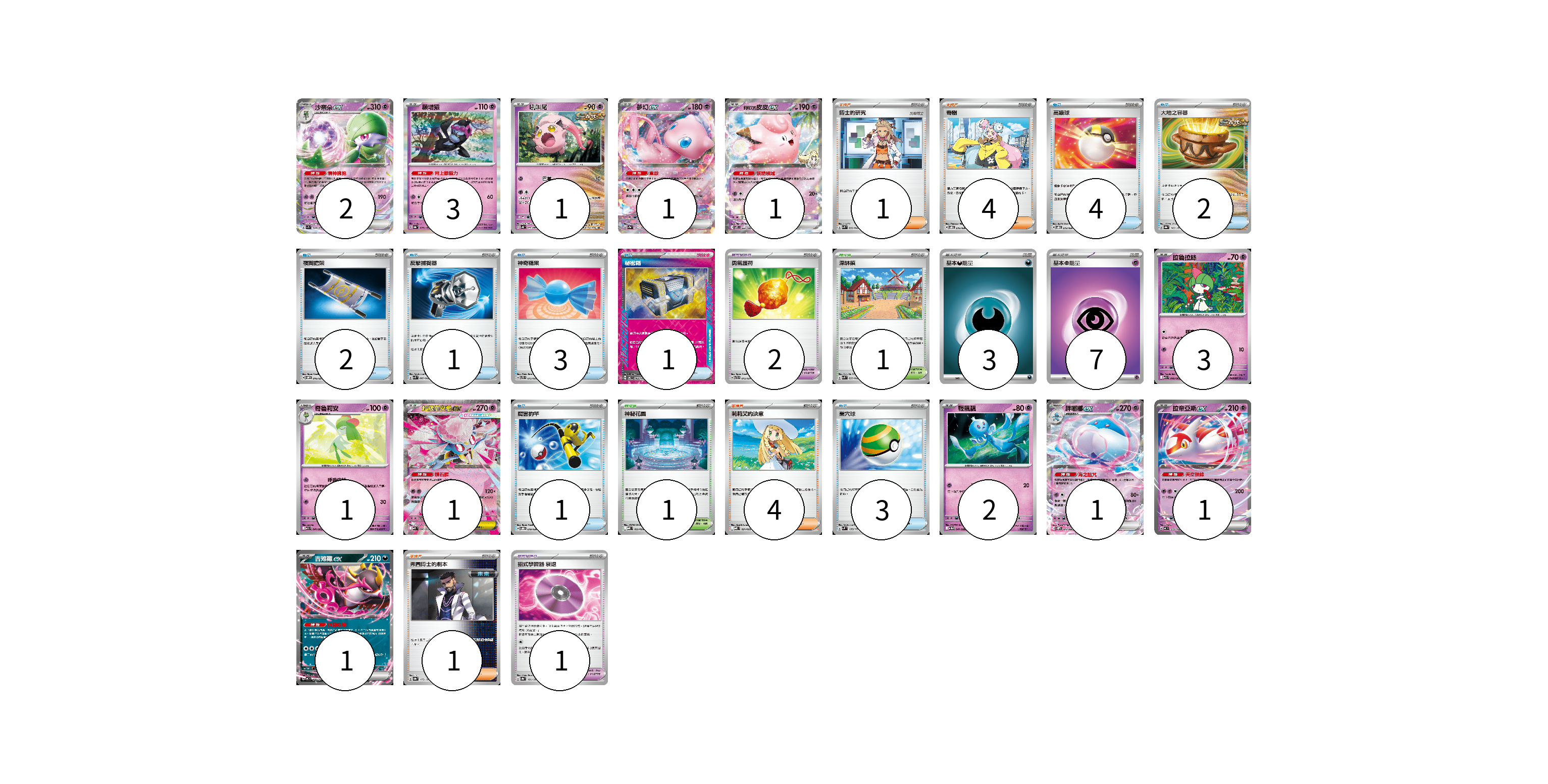牌組構築方案 以此牌組為基礎新構築牌組 顯示卡面 顯示列表 寶可夢卡(18) 2 3 1 1 1 3 1 1 2 1 1 1 寶可夢道具(3) 2 1 物品卡(17) 4 2 2 1 3 1 1 3 支援者卡(10) 1 4 4 1 競技場卡(2) 1 1 能量卡(10) 3 7 寶可夢卡(18) 卡牌名稱 張數 卡牌名稱 張數 沙奈朵ex SV1S 028/078 02 願增猿 SV8a 075/187 03 吼叫尾 SV4K 032/066 01 夢幻ex SV2a 151/165 01 莉莉艾的皮皮ex SV9 033/100 01 拉魯拉絲 M1S 040/063 03 奇魯莉安 M1S 041/063 01 超級蒂安希ex MBD 006/022 01 輕飄飄 SV11W 041/086 02 胖嘟嘟ex SV11W 042/086 01 拉帝亞斯ex MC 312/742 01 吉雉雞ex MC 489/742 01 寶可夢道具(3) 卡牌名稱 張數 卡牌名稱 張數 勇氣護符 SVTR 015/021 02 招式學習器 衰退 SV8a 161/187 01 物品卡(17) 卡牌名稱 張數 卡牌名稱 張數 高級球 SVOD 012/020 04 大地之容器 SV8a 143/187 02 夜間擔架 SVOM 016/021 02 反擊捕捉器 SVK 009/042 01 神奇糖果 SVTS 015/022 03 秘密箱 SV6 092/101 01 厲害釣竿 SVOD 010/020 01 巢穴球 SVM 133/175 03 支援者卡(10) 卡牌名稱 張數 卡牌名稱 張數 博士的研究 SVK 032/042 01 奇樹 SVOD 016/020 04 莉莉艾的決意 MBD 021/022 04 弗圖博士的劇本 SV8a 175/187 01 競技場卡(2) 卡牌名稱 張數 卡牌名稱 張數 深缽鎮 SVK 039/042 01 神秘花園 MBD 022/022 01 能量卡(10) 卡牌名稱 張數 卡牌名稱 張數 基本惡能量 sv-p DAR 03 基本超能量 sv-p PSY 07 以此牌組為基礎新構築牌組 牌組編碼 YpHqJE-rMAVgV-RYDnri copy 列印牌組單 牌組編碼已複製 分享至SNS