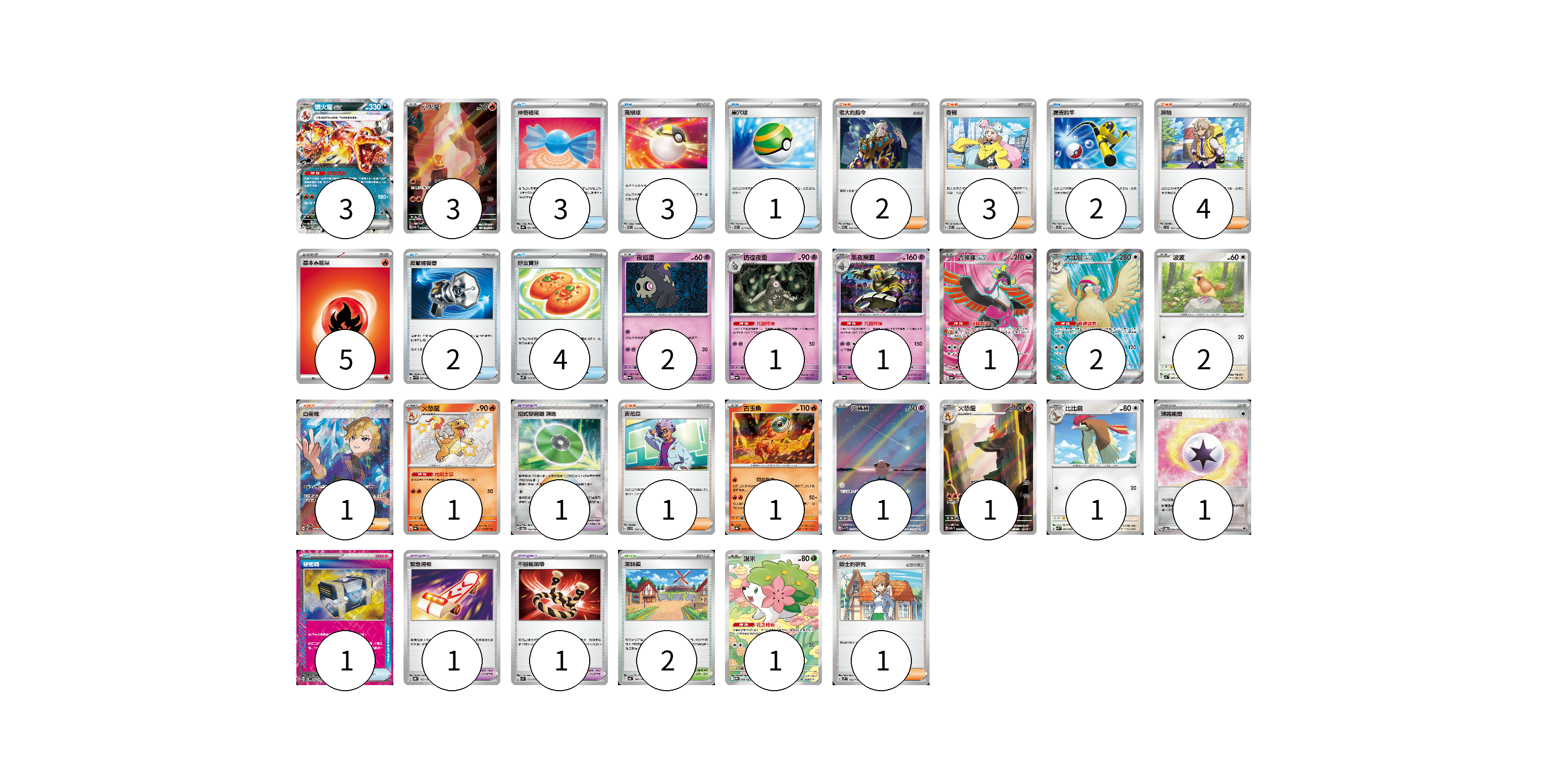 牌組構築方案 以此牌組為基礎新構築牌組 顯示卡面 顯示列表 寶可夢卡(21) 3 3 2 1 1 1 2 2 1 1 1 1 1 1 寶可夢道具(3) 1 1 1 物品卡(16) 3 3 1 2 2 4 1 支援者卡(12) 2 3 4 1 1 1 競技場卡(2) 2 能量卡(6) 5 1 寶可夢卡(21) 卡牌名稱 張數 卡牌名稱 張數 噴火龍ex SV3 066/108 03 小火龍 SV2a 168/165 03 夜巡靈 SV6a 018/064 02 彷徨夜靈 SV6a 019/064 01 黑夜魔靈 SV6a 020/064 01 吉雉雞ex SV6a 081/064 01 大比鳥ex SV3 128/108 02 波波 SV3 087/108 02 火恐龍 SV4a 211/190 01 古玉魚 SV8a 025/187 01 皮寶寶 SV3 113/108 01 火恐龍 SV2a 169/165 01 比比鳥 SVK 004/042 01 謝米 SV9a 066/063 01 寶可夢道具(3) 卡牌名稱 張數 卡牌名稱 張數 招式學習器 演進 SV8a 160/187 01 緊急滑板 SV8a 153/187 01 不服輸頭帶 SV1S 073/078 01 物品卡(16) 卡牌名稱 張數 卡牌名稱 張數 神奇糖果 SV3a 053/062 03 高級球 SVEL 012/020 03 巢穴球 SVEL 011/020 01 厲害釣竿 SVF 013/038 02 反擊捕捉器 SV4M 059/066 02 好友寶芬 SV5K 063/071 04 秘密箱 SV6 092/101 01 支援者卡(12) 卡牌名稱 張數 卡牌名稱 張數 老大的指令 SVEL 019/020 02 奇樹 SVEL 016/020 03 派帕 SVD 137/139 04 白蕾雅 SV7 126/102 01 吉尼亞 SVD 129/139 01 博士的研究 SVM 166/175 01 競技場卡(2) 卡牌名稱 張數 卡牌名稱 張數 深缽鎮 SV4a 185/190 02 能量卡(6) 卡牌名稱 張數 卡牌名稱 張數 基本【火】能量 SVF FIR 05 薄霧能量 SV8a 186/187 01 以此牌組為基礎新構築牌組 牌組編碼 YqMoZr-CVXIBK-OexxfJ copy 列印牌組單 牌組編碼已複製 分享至SNS