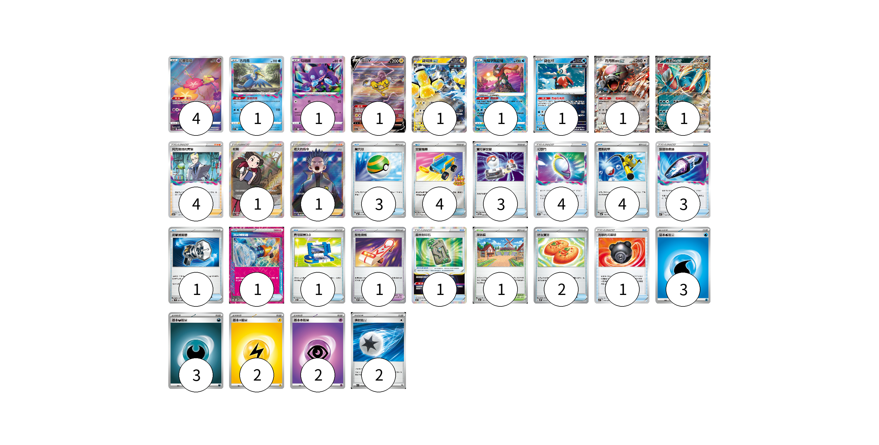 牌組構築方案 以此牌組為基礎新構築牌組 顯示卡面 顯示列表 寶可夢卡(12) 4 1 1 1 1 1 1 1 1 寶可夢道具(2) 1 1 物品卡(27) 3 4 3 4 4 3 1 1 1 2 1 支援者卡(6) 4 1 1 競技場卡(1) 1 能量卡(12) 3 3 2 2 2 寶可夢卡(12) 卡牌名稱 張數 卡牌名稱 張數 花療環環 S12a 187/172 04 古月鳥 S11 033/100 01 勾魂眼 S11 044/100 01 雷公V S12a 218/172 01 鐵臂膀ex SV4M 027/066 01 光輝甲賀忍蛙 SVF 004/038 01 鐵包袱 SV4M 020/066 01 月月熊 赫月 ex SV5a 052/066 01 轟鳴月ex SV4K 054/066 01 寶可夢道具(2) 卡牌名稱 張數 卡牌名稱 張數 緊急滑板 SV5K 064/071 01 森林封印石 S12 092/098 01 物品卡(27) 卡牌名稱 張數 卡牌名稱 張數 巢穴球 SVHK 012/022 03 交替推車 SV-P 082/SV-P 04 寶可夢交替 SV5a 056/066 03 幻想門 S12a 141/172 04 厲害釣竿 SV4a 158/190 04 放逐吸塵器 SVF 023/038 03 反擊捕捉器 SV4M 059/066 01 頂尖捕捉器 SV5M 062/071 01 寶可裝置3.0 SVEL 014/020 01 好友寶芬 SV5K 063/071 02 洗翠的沉重球 SVF 019/038 01 支援者卡(6) 卡牌名稱 張數 卡牌名稱 張數 阿克羅瑪的實驗 S12a 148/172 04 杜娟 S12a 242/172 01 老大的指令(赤日) S12a 250/172 01 競技場卡(1) 卡牌名稱 張數 卡牌名稱 張數 深缽鎮 SV4a 185/190 01 能量卡(12) 卡牌名稱 張數 卡牌名稱 張數 基本水能量 sv-p WAT 03 基本【惡】能量 SVF DAR 03 基本【雷】能量 SVF LIG 02 基本【超】能量 SVAW PSY 02 噴射能量 SV1a 072/073 02 以此牌組為基礎新構築牌組 牌組編碼 YsPmjA-pJErPD-SXVcVL copy 列印牌組單 牌組編碼已複製 分享至SNS