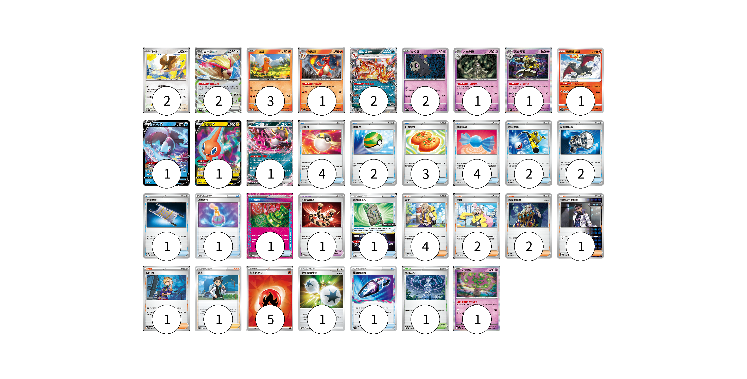 牌組構築方案 以此牌組為基礎新構築牌組 顯示卡面 顯示列表 寶可夢卡(19) 2 2 3 1 2 2 1 1 1 1 1 1 1 寶可夢道具(2) 1 1 物品卡(21) 4 2 3 4 2 2 1 1 1 1 支援者卡(11) 4 2 2 1 1 1 競技場卡(1) 1 能量卡(6) 5 1 寶可夢卡(19) 卡牌名稱 張數 卡牌名稱 張數 波波 SVK 003/042 02 大比鳥ex SVK 005/042 02 小火龍 SVTL 001/021 03 火恐龍 SVTL 002/021 01 噴火龍ex SVTL 006/021 02 夜巡靈 SV6a 018/064 02 彷徨夜靈 SV6a 019/064 01 黑夜魔靈 SV6a 020/064 01 光輝噴火龍 SVTL 003/021 01 霓虹魚V SVB 008/028 01 洛托姆V S11 037/100 01 吉雉雞ex SV6a 038/064 01 花岩怪 SV4a 086/190 01 寶可夢道具(2) 卡牌名稱 張數 卡牌名稱 張數 不服輸頭帶 SV4a 168/190 01 森林封印石 SV-P 141/SV-P 01 物品卡(21) 卡牌名稱 張數 卡牌名稱 張數 高級球 SVTG 013/019 04 巢穴球 SVTG 012/019 02 好友寶芬 SVTG 011/019 03 神奇糖果 SVTG 014/019 04 厲害釣竿 SVTL 009/021 02 反擊捕捉器 SVTS 009/022 02 夜間擔架 SV6a 056/064 01 消除香水 SVF 011/038 01 不公印章 SV5a 053/066 01 放逐吸塵器 SVF 023/038 01 支援者卡(11) 卡牌名稱 張數 卡牌名稱 張數 派帕 SVTL 020/021 04 奇樹 SVTM 017/022 02 老大的指令 SVTH 017/018 02 弗圖博士的劇本 SVHM 021/022 01 白蕾雅 SV7 100/102 01 捩木 S11 097/100 01 競技場卡(1) 卡牌名稱 張數 卡牌名稱 張數 阻礙之塔 SV6 100/101 01 能量卡(6) 卡牌名稱 張數 卡牌名稱 張數 基本【火】能量 SVK FIR 05 雙重渦輪能量 SVTR 021/021 01 以此牌組為基礎新構築牌組 牌組編碼 YuXZPV-JtbPaw-tAGzcj copy 列印牌組單 牌組編碼已複製 分享至SNS