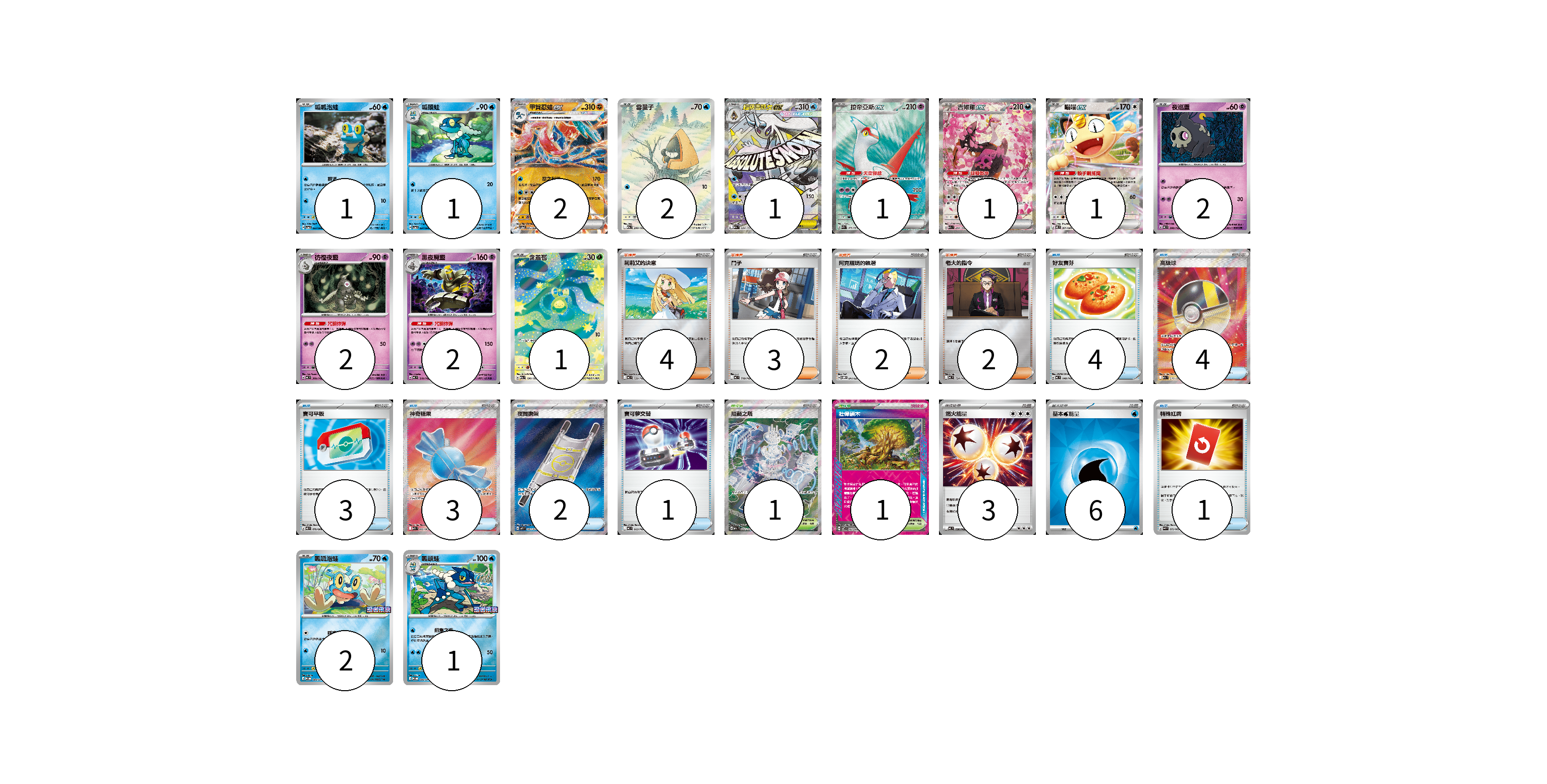 牌組構築方案 以此牌組為基礎新構築牌組 顯示卡面 顯示列表 寶可夢卡(20) 1 1 2 2 1 1 1 1 2 2 2 1 2 1 物品卡(18) 4 4 3 3 2 1 1 支援者卡(11) 4 3 2 2 競技場卡(2) 1 1 能量卡(9) 3 6 寶可夢卡(20) 卡牌名稱 張數 卡牌名稱 張數 呱呱泡蛙 SV5a 023/066 01 呱頭蛙 SV5a 024/066 01 甲賀忍蛙ex SV5a 045/066 02 雪童子 M2a 200/193 02 超級雪妖女ex M2a 224/193 01 拉帝亞斯ex SV7a 078/064 01 吉雉雞ex M2a 244/193 01 喵喵ex M3 061/080 01 夜巡靈 MC 308/742 02 彷徨夜靈 MC 309/742 02 黑夜魔靈 MC 310/742 02 含羞苞 M2a 196/193 01 呱呱泡蛙 M-P 089/M-P 02 呱頭蛙 M-P 090/M-P 01 物品卡(18) 卡牌名稱 張數 卡牌名稱 張數 好友寶芬 MC 648/742 04 高級球 M2a 216/193 04 寶可平板 M3 070/080 03 神奇糖果 M1S 082/063 03 夜間擔架 M1L 083/063 02 寶可夢交替 MC 663/742 01 特殊紅牌 M4 072/083 01 支援者卡(11) 卡牌名稱 張數 卡牌名稱 張數 莉莉艾的決意 MC 729/742 04 鬥子 MC 718/742 03 阿克羅瑪的執著 SVOM 017/021 02 老大的指令 MC 724/742 02 競技場卡(2) 卡牌名稱 張數 卡牌名稱 張數 阻礙之塔 M2a 222/193 01 壯偉碩木 SV7 101/102 01 能量卡(9) 卡牌名稱 張數 卡牌名稱 張數 燃火能量 MC 736/742 03 基本【水】能量 SVM WAT 06 以此牌組為基礎新構築牌組 牌組編碼 YwRqkx-ikhyUb-ZgsyYq copy 列印牌組單 牌組編碼已複製 分享至SNS
