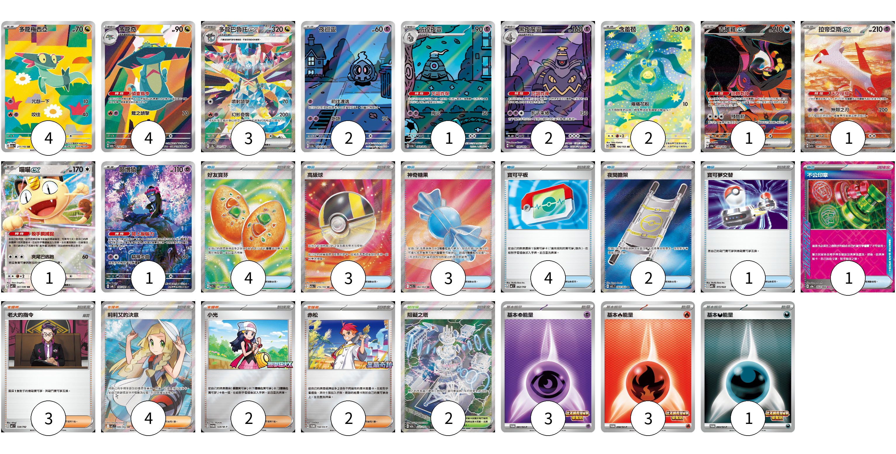 牌組構築方案 以此牌組為基礎新構築牌組 顯示卡面 顯示列表 寶可夢卡(22) 4 4 3 2 1 2 2 1 1 1 1 物品卡(18) 4 3 3 4 2 1 1 支援者卡(11) 3 4 2 2 競技場卡(2) 2 能量卡(7) 3 3 1 寶可夢卡(22) 卡牌名稱 張數 卡牌名稱 張數 多龍梅西亞 M2a 211/193 04 多龍奇 M2a 212/193 04 多龍巴魯托ex SV8a 221/187 03 夜巡靈 SV6a 068/064 02 彷徨夜靈 SV6a 069/064 01 黑夜魔靈 SV6a 070/064 02 含羞苞 M2a 196/193 02 吉雉雞ex SV6a 089/064 01 拉帝亞斯ex SV7a 087/064 01 喵喵ex M3 061/080 01 願增猿 SV6 107/101 01 物品卡(18) 卡牌名稱 張數 卡牌名稱 張數 好友寶芬 M1S 081/063 04 高級球 M2a 216/193 03 神奇糖果 M1S 082/063 03 寶可平板 MC 662/742 04 夜間擔架 M1L 083/063 02 寶可夢交替 MBG 015/022 01 不公印章 SV5a 053/066 01 支援者卡(11) 卡牌名稱 張數 卡牌名稱 張數 老大的指令 MC 724/742 03 莉莉艾的決意 M1L 086/063 04 小光 M-P 028/M-P 02 赤松 SV-P 150/SV-P 02 競技場卡(2) 卡牌名稱 張數 卡牌名稱 張數 阻礙之塔 M2a 222/193 02 能量卡(7) 卡牌名稱 張數 卡牌名稱 張數 基本【超】能量 SV-P 261/SV-P 03 基本【火】能量 SV-P 258/SV-P 03 基本【惡】能量 SV-P 263/SV-P 01 以此牌組為基礎新構築牌組 牌組編碼 YxPAUq-yEkgLu-QxhBrj copy 列印牌組單 牌組編碼已複製 分享至SNS