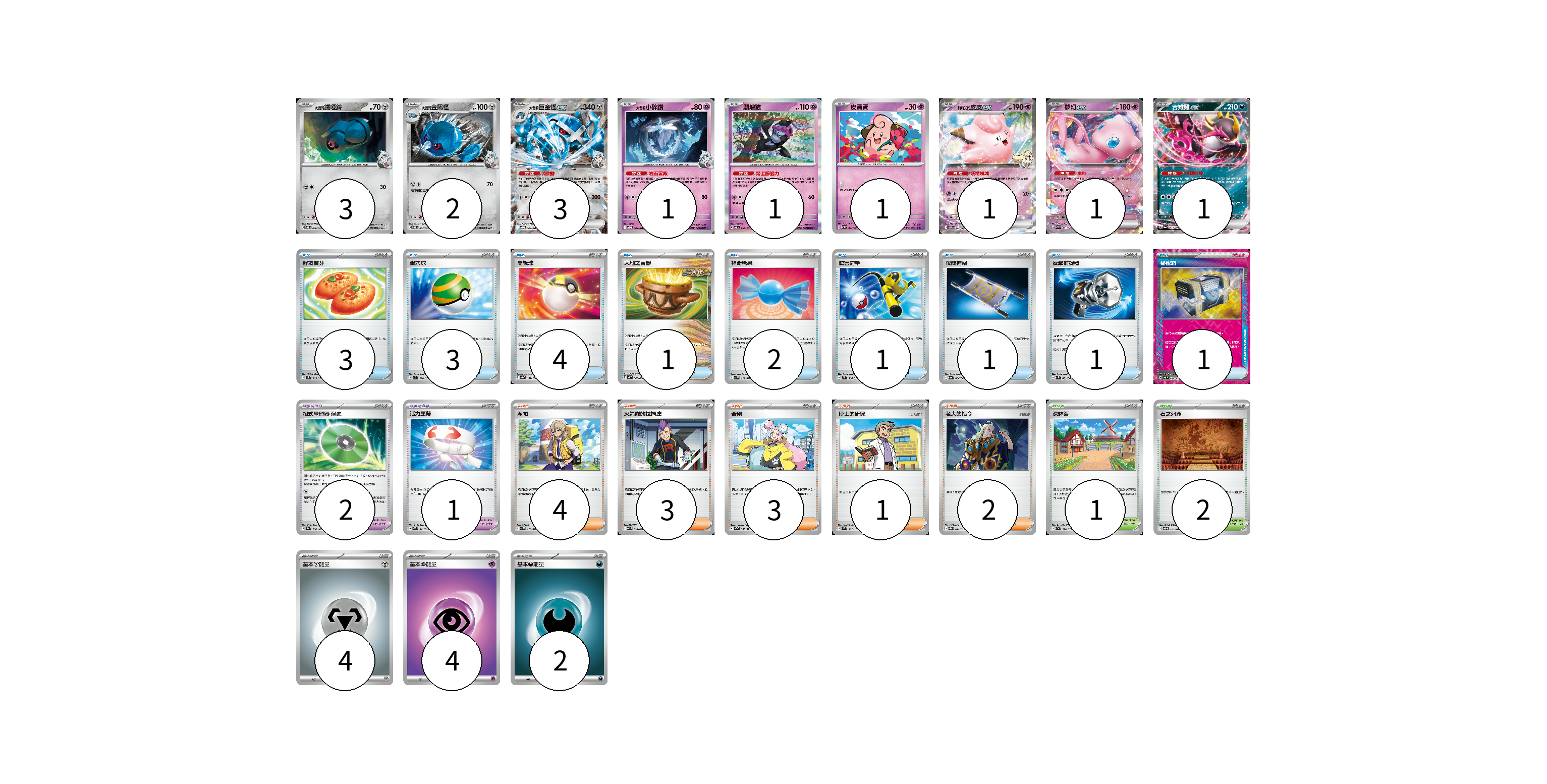 牌組構築方案 以此牌組為基礎新構築牌組 顯示卡面 顯示列表 寶可夢卡(14) 3 2 3 1 1 1 1 1 1 寶可夢道具(3) 2 1 物品卡(17) 3 3 4 1 2 1 1 1 1 支援者卡(13) 4 3 3 1 2 競技場卡(3) 1 2 能量卡(10) 4 4 2 寶可夢卡(14) 卡牌名稱 張數 卡牌名稱 張數 <大吾的>鐵啞鈴 SVOD 006/020 03 <大吾的>金屬怪 SVOD 007/020 02 <大吾的>巨金怪ex SVOD 008/020 03 <大吾的>小碎鑽 SVOD 003/020 01 願增猿 SV6 055/101 01 皮寶寶 SV3 042/108 01 莉莉艾的皮皮ex SV9 033/100 01 夢幻ex SVK 001/042 01 吉雉雞ex SV6a 038/064 01 寶可夢道具(3) 卡牌名稱 張數 卡牌名稱 張數 招式學習器 演進 SV8a 160/187 02 活力頭帶 SVAW 019/023 01 物品卡(17) 卡牌名稱 張數 卡牌名稱 張數 好友寶芬 SV5K 063/071 03 巢穴球 SV1S 070/078 03 高級球 SV4a 161/190 04 大地之容器 SV4K 060/066 01 神奇糖果 SV1V 072/078 02 厲害釣竿 SV2P 066/071 01 夜間擔架 SV6a 056/064 01 反擊捕捉器 SV4M 059/066 01 秘密箱 SV6 092/101 01 支援者卡(13) 卡牌名稱 張數 卡牌名稱 張數 派帕 SV1V 076/078 04 火箭隊的拉姆達 SV10 094/098 03 奇樹 SV2D 069/071 03 博士的研究 SVM 162/175 01 老大的指令 SVEM 020/020 02 競技場卡(3) 卡牌名稱 張數 卡牌名稱 張數 深缽鎮 SV1a 070/073 01 石之洞窟 SVOD 020/020 02 能量卡(10) 卡牌名稱 張數 卡牌名稱 張數 基本鋼能量 sv-p MET 04 基本超能量 sv-p PSY 04 基本惡能量 sv-p DAR 02 以此牌組為基礎新構築牌組 牌組編碼 YxYgGj-WOnqLk-mEtBfr copy 列印牌組單 牌組編碼已複製 分享至SNS