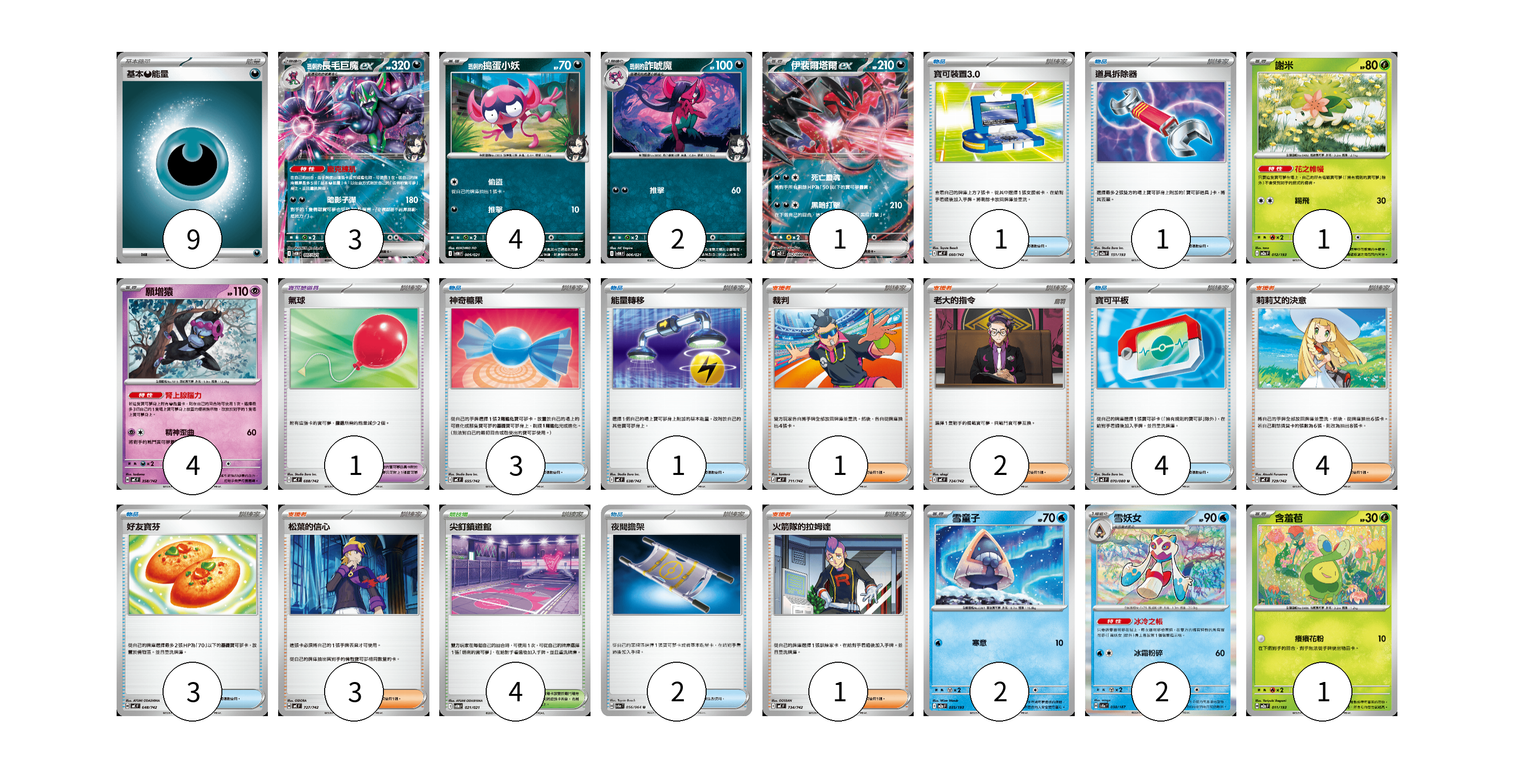牌組構築方案 以此牌組為基礎新構築牌組 顯示卡面 顯示列表 寶可夢卡(20) 3 4 2 1 1 4 2 2 1 寶可夢道具(1) 1 物品卡(15) 1 1 3 1 4 3 2 支援者卡(11) 1 2 4 3 1 競技場卡(4) 4 能量卡(9) 9 寶可夢卡(20) 卡牌名稱 張數 卡牌名稱 張數 <瑪俐的>長毛巨魔ex SVOM 007/021 03 <瑪俐的>搗蛋小妖 SVOM 005/021 04 <瑪俐的>詐唬魔 SVOM 006/021 02 伊裴爾塔爾ex M3 052/080 01 謝米 M2a 012/193 01 願增猿 MC 358/742 04 雪童子 M2a 035/193 02 雪妖女 SV8a 038/187 02 含羞苞 M2a 011/193 01 寶可夢道具(1) 卡牌名稱 張數 卡牌名稱 張數 氣球 MC 688/742 01 物品卡(15) 卡牌名稱 張數 卡牌名稱 張數 寶可裝置3.0 MC 660/742 01 道具拆除器 M2a 151/193 01 神奇糖果 MC 655/742 03 能量轉移 MC 638/742 01 寶可平板 M3 070/080 04 好友寶芬 MC 648/742 03 夜間擔架 SV6a 056/064 02 支援者卡(11) 卡牌名稱 張數 卡牌名稱 張數 裁判 MC 711/742 01 老大的指令 MC 724/742 02 莉莉艾的決意 MC 729/742 04 松葉的信心 MC 727/742 03 火箭隊的拉姆達 MC 734/742 01 競技場卡(4) 卡牌名稱 張數 卡牌名稱 張數 尖釘鎮道館 SVOM 021/021 04 能量卡(9) 卡牌名稱 張數 卡牌名稱 張數 基本【惡】能量 MC DAR 09 以此牌組為基礎新構築牌組 牌組編碼 YyXAPz-vRqebR-bgIkvs copy 列印牌組單 牌組編碼已複製 分享至SNS