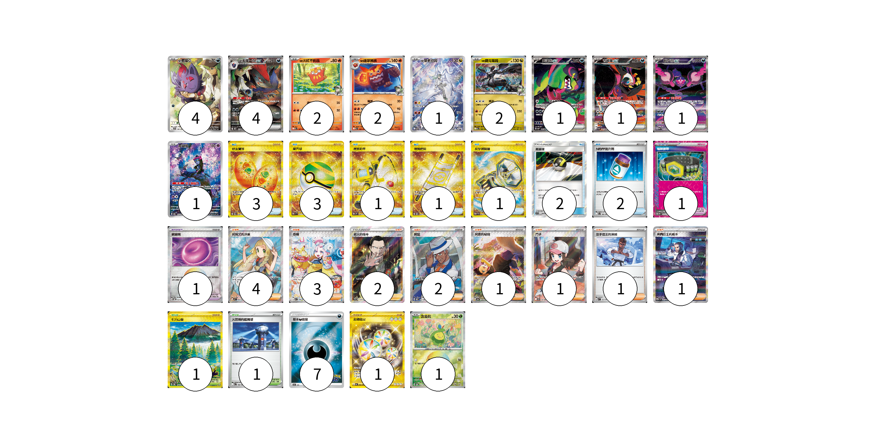 牌組構築方案 以此牌組為基礎新構築牌組 顯示卡面 顯示列表 寶可夢卡(20) 4 4 2 2 1 2 1 1 1 1 1 寶可夢道具(2) 1 1 物品卡(13) 3 3 1 1 1 2 2 支援者卡(15) 4 3 2 2 1 1 1 1 競技場卡(2) 1 1 能量卡(8) 7 1 寶可夢卡(20) 卡牌名稱 張數 卡牌名稱 張數 N的索羅亞 SV9 108/100 04 N的索羅亞克ex SV9 127/100 04 N的火紅不倒翁 M2a 027/193 02 N的達摩狒狒 M2a 028/193 02 N的萊希拉姆 SV9 109/100 01 N的捷克羅姆 M2a 129/193 02 夠讚狗ex SV6a 087/064 01 吉雉雞ex SV6a 089/064 01 桃歹郎ex SV6a 090/064 01 願增猿 SV6 107/101 01 含羞苞 SV8a 001/187 01 寶可夢道具(2) 卡牌名稱 張數 卡牌名稱 張數 極限腰帶 SV8a 159/187 01 鎖鏈糬 SV8a 154/187 01 物品卡(13) 卡牌名稱 張數 卡牌名稱 張數 好友寶芬 SV6 133/101 03 巢穴球 SV1S 107/078 03 厲害釣竿 SV2P 098/071 01 夜間擔架 SV8 137/106 01 反擊捕捉器 SV4M 094/066 01 高級球 AS5b 178/186 02 N的PP提升劑 M2a 146/193 02 支援者卡(15) 卡牌名稱 張數 卡牌名稱 張數 莉莉艾的決意 M1L 086/063 04 奇樹 SV2D 096/071 03 老大的指令(坂木) SC1b 170/153 02 席藍 SV8 127/106 02 阿杏的秘招 SV8a 228/187 01 鬥子 SV11W 166/086 01 空手道王的演練 SVM 151/175 01 弗圖博士的劇本 SV4M 091/066 01 競技場卡(2) 卡牌名稱 張數 卡牌名稱 張數 引力山岳 SV8 138/106 01 火箭隊的監視塔 M2a 189/193 01 能量卡(8) 卡牌名稱 張數 卡牌名稱 張數 基本惡能量 S10b DAR 07 反轉能量 SV3a 092/062 01 以此牌組為基礎新構築牌組 牌組編碼 YygBcK-WauXsV-fcQjxB copy 列印牌組單 牌組編碼已複製 分享至SNS