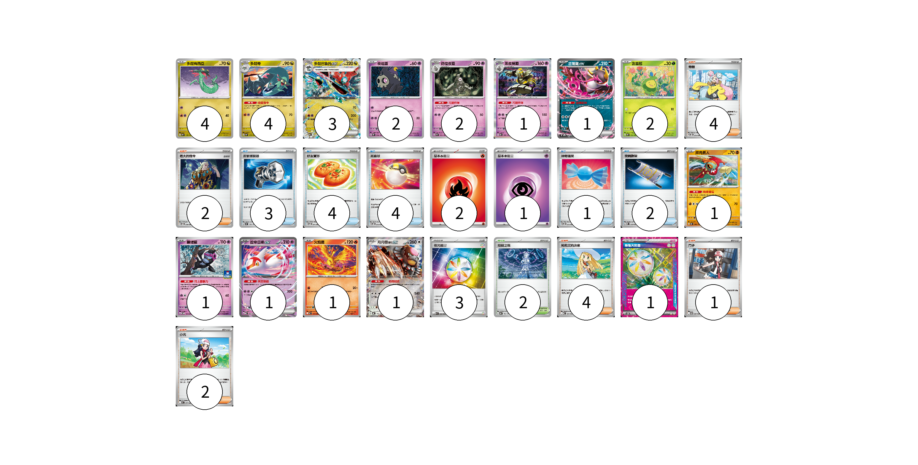 牌組構築方案 以此牌組為基礎新構築牌組 顯示卡面 顯示列表 寶可夢卡(24) 4 4 3 2 2 1 1 2 1 1 1 1 1 物品卡(14) 3 4 4 1 2 支援者卡(13) 4 2 4 1 2 競技場卡(2) 2 能量卡(7) 2 1 3 1 寶可夢卡(24) 卡牌名稱 張數 卡牌名稱 張數 多龍梅西亞 SV8a 118/187 04 多龍奇 SV8a 119/187 04 多龍巴魯托ex SV8a 120/187 03 夜巡靈 SV8a 064/187 02 彷徨夜靈 SV8a 065/187 02 黑夜魔靈 SV8a 066/187 01 吉雉雞ex SVOD 004/020 01 含羞苞 SV8a 001/187 02 摔角鷹人 SV8a 084/187 01 願增猿 M-P 014/M-P 01 拉帝亞斯ex MBD 003/022 01 火焰鳥 M2 014/080 01 月月熊 赫月ex SV8a 134/187 01 物品卡(14) 卡牌名稱 張數 卡牌名稱 張數 反擊捕捉器 SV8a 139/187 03 好友寶芬 SVOD 011/020 04 高級球 SVOD 012/020 04 神奇糖果 SVOD 013/020 01 夜間擔架 MBD 016/022 02 支援者卡(13) 卡牌名稱 張數 卡牌名稱 張數 奇樹 SVOD 016/020 04 老大的指令 SVOD 019/020 02 莉莉艾的決意 MBD 021/022 04 鬥子 SV11W 085/086 01 小光 M2 077/080 02 競技場卡(2) 卡牌名稱 張數 卡牌名稱 張數 阻礙之塔 SV8a 181/187 02 能量卡(7) 卡牌名稱 張數 卡牌名稱 張數 基本火能量 sv-p FIR 02 基本超能量 sv-p PSY 01 夜光能量 SVK 042/042 03 新衝天能量 SV5K 071/071 01 以此牌組為基礎新構築牌組 牌組編碼 YygYmw-JPsZay-CeLbOZ copy 列印牌組單 牌組編碼已複製 分享至SNS