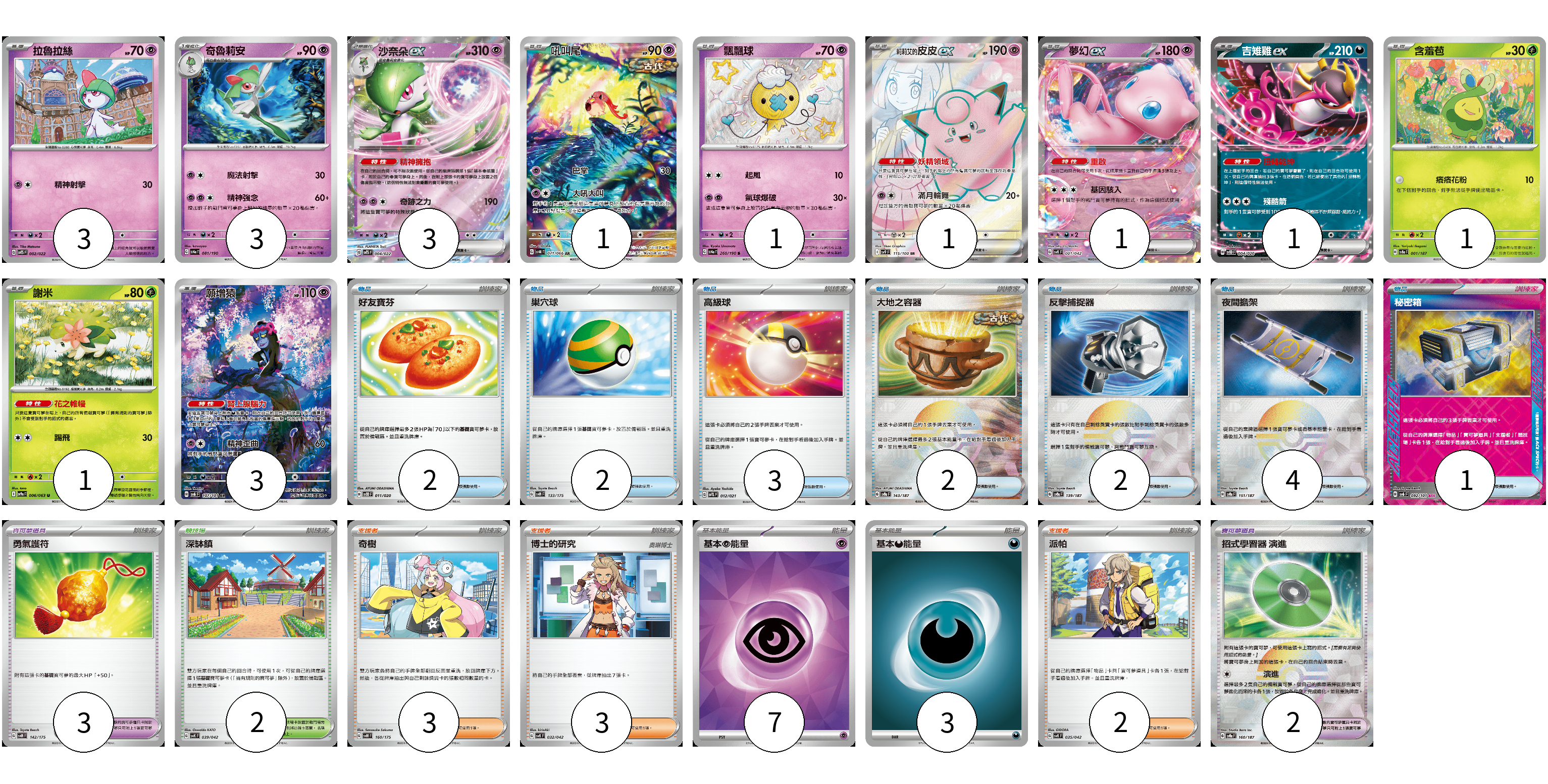 牌組構築方案 以此牌組為基礎新構築牌組 顯示卡面 顯示列表 寶可夢卡(19) 3 3 3 1 1 1 1 1 1 1 3 寶可夢道具(5) 3 2 物品卡(16) 2 2 3 2 2 4 1 支援者卡(8) 3 3 2 競技場卡(2) 2 能量卡(10) 7 3 寶可夢卡(19) 卡牌名稱 張數 卡牌名稱 張數 拉魯拉絲 SVTS 002/022 03 奇魯莉安 SV4a 081/190 03 沙奈朵ex SVTS 004/022 03 吼叫尾 SV4K 071/066 01 飄飄球 SV4a 260/190 01 莉莉艾的皮皮ex SV9 115/100 01 夢幻ex SVK 001/042 01 吉雉雞ex SVOD 004/020 01 含羞苞 SV8a 001/187 01 謝米 SV9a 006/063 01 願增猿 SV6 107/101 03 寶可夢道具(5) 卡牌名稱 張數 卡牌名稱 張數 勇氣護符 SVM 142/175 03 招式學習器 演進 SV8a 160/187 02 物品卡(16) 卡牌名稱 張數 卡牌名稱 張數 好友寶芬 SVOD 011/020 02 巢穴球 SVM 133/175 02 高級球 SVTL 012/021 03 大地之容器 SV8a 143/187 02 反擊捕捉器 SV8a 139/187 02 夜間擔架 SV8a 151/187 04 秘密箱 SV6 092/101 01 支援者卡(8) 卡牌名稱 張數 卡牌名稱 張數 奇樹 SVM 160/175 03 博士的研究 SVK 032/042 03 派帕 SVK 035/042 02 競技場卡(2) 卡牌名稱 張數 卡牌名稱 張數 深缽鎮 SVK 039/042 02 能量卡(10) 卡牌名稱 張數 卡牌名稱 張數 基本【超】能量 SVOD PSY 07 基本惡能量 sv-p DAR 03 以此牌組為基礎新構築牌組 牌組編碼 ZAfusD-JtYboD-dioYmd copy 列印牌組單 牌組編碼已複製 分享至SNS