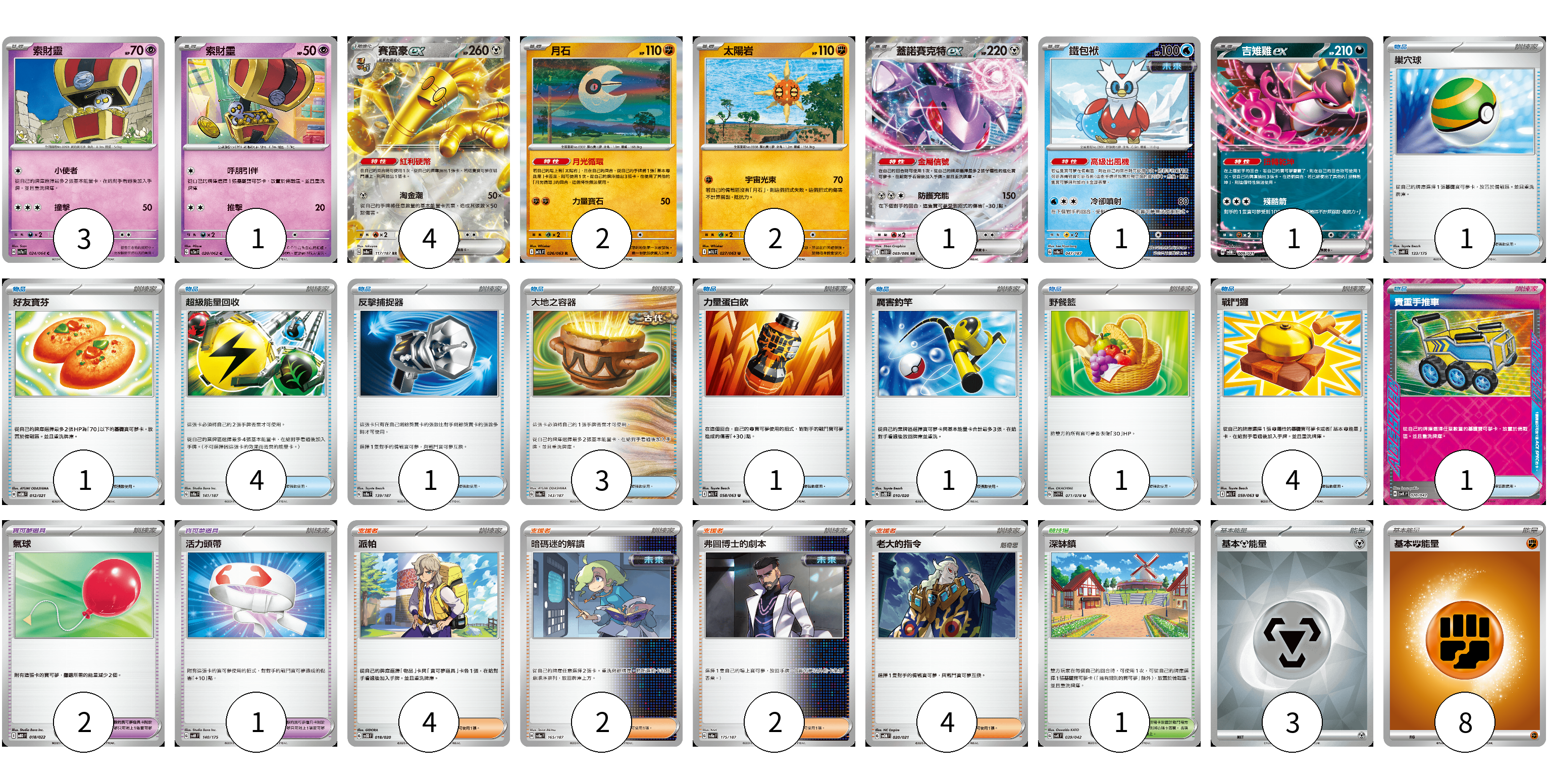 牌組構築方案 以此牌組為基礎新構築牌組 顯示卡面 顯示列表 寶可夢卡(15) 3 1 4 2 2 1 1 1 寶可夢道具(3) 2 1 物品卡(18) 1 1 4 1 3 1 1 1 4 1 支援者卡(12) 4 2 2 4 競技場卡(1) 1 能量卡(11) 3 8 寶可夢卡(15) 卡牌名稱 張數 卡牌名稱 張數 索財靈 SV7a 024/064 03 索財靈 SV3a 020/062 01 賽富豪ex SV8a 117/187 04 月石 M1L 026/063 02 太陽岩 M1L 027/063 02 蓋諾賽克特ex SV11B 069/086 01 鐵包袱 SV8a 047/187 01 吉雉雞ex SVOM 009/021 01 寶可夢道具(3) 卡牌名稱 張數 卡牌名稱 張數 氣球 MBD 018/022 02 活力頭帶 SVM 140/175 01 物品卡(18) 卡牌名稱 張數 卡牌名稱 張數 巢穴球 SVM 133/175 01 好友寶芬 SVOM 012/021 01 超級能量回收 SV8a 141/187 04 反擊捕捉器 SV8a 139/187 01 大地之容器 SV8a 143/187 03 力量蛋白飲 M1L 058/063 01 厲害釣竿 SVOD 010/020 01 野餐籃 SV1V 071/078 01 戰鬥鑼 M1L 059/063 04 貴重手推車 SVK 020/042 01 支援者卡(12) 卡牌名稱 張數 卡牌名稱 張數 派帕 SVOD 018/020 04 暗碼迷的解讀 SV8a 165/187 02 弗圖博士的劇本 SV8a 175/187 02 老大的指令 SVOM 020/021 04 競技場卡(1) 卡牌名稱 張數 卡牌名稱 張數 深缽鎮 SVK 039/042 01 能量卡(11) 卡牌名稱 張數 卡牌名稱 張數 基本【鋼】能量 SVOD MET 03 基本【鬥】能量 M-P FIG 08 以此牌組為基礎新構築牌組 牌組編碼 ZBujkg-WRaNme-ijSwYO copy 列印牌組單 牌組編碼已複製 分享至SNS