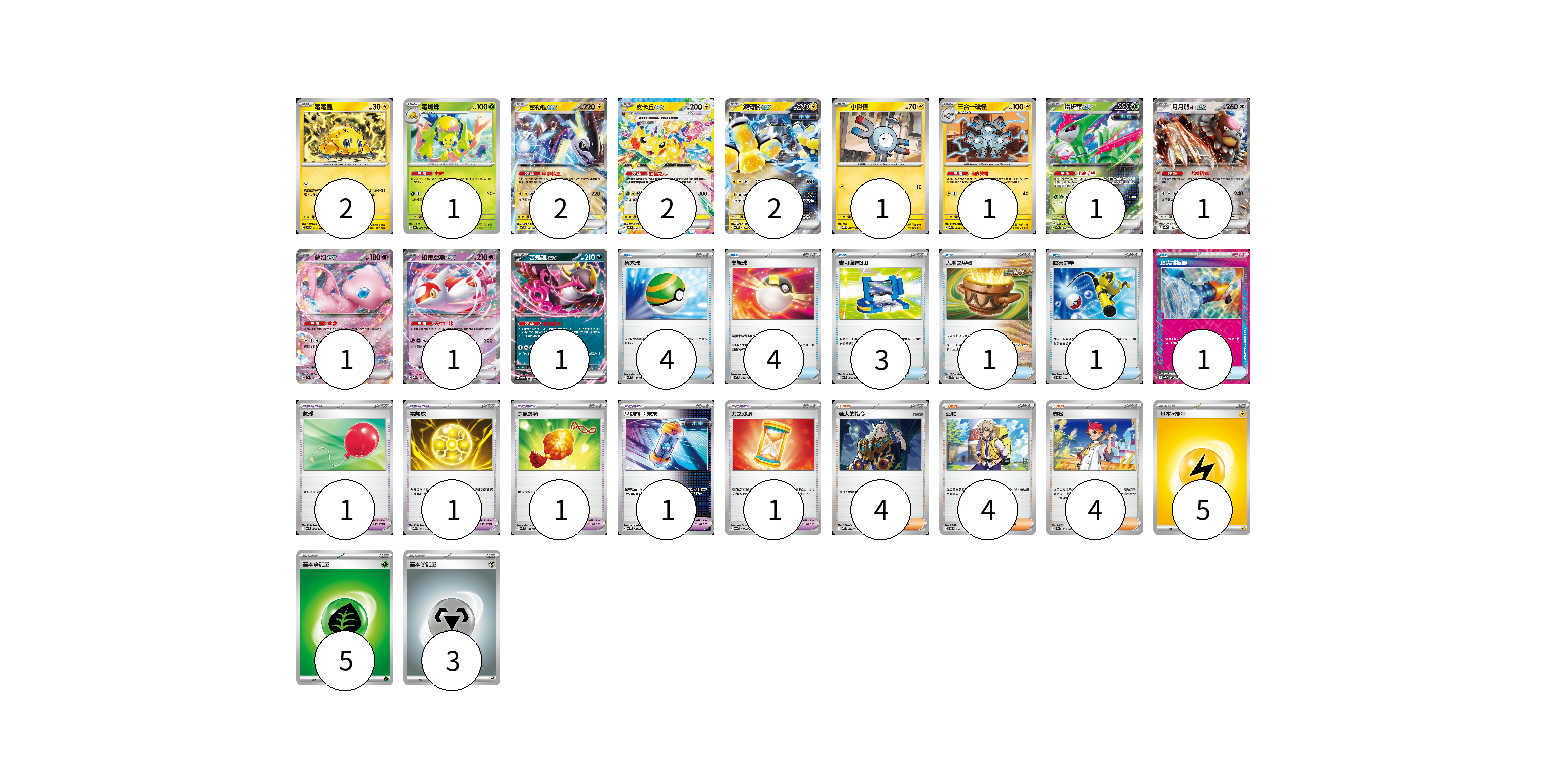 牌組構築方案 以此牌組為基礎新構築牌組 顯示卡面 顯示列表 寶可夢卡(16) 2 1 2 2 2 1 1 1 1 1 1 1 寶可夢道具(5) 1 1 1 1 1 物品卡(14) 4 4 3 1 1 1 支援者卡(12) 4 4 4 能量卡(13) 5 5 3 寶可夢卡(16) 卡牌名稱 張數 卡牌名稱 張數 電電蟲 SV7 032/102 02 電蜘蛛 SV6a 002/064 01 密勒頓ex SVTR 008/021 02 皮卡丘ex SV8 033/106 02 鐵臂膀ex SV4M 027/066 02 小磁怪 M1S 027/063 01 三合一磁怪 M2a 046/193 01 鐵斑葉ex SV5M 016/071 01 月月熊 赫月ex SV8a 134/187 01 夢幻ex SV2a 151/165 01 拉帝亞斯ex M2a 075/193 01 吉雉雞ex SVOD 004/020 01 寶可夢道具(5) 卡牌名稱 張數 卡牌名稱 張數 氣球 MC 688/742 01 電氣球 M2a 163/193 01 勇氣護符 SVM 142/175 01 驅勁能量 未來 SV4M 062/066 01 力之沙漏 SV6a 058/064 01 物品卡(14) 卡牌名稱 張數 卡牌名稱 張數 巢穴球 SVM 133/175 04 高級球 MC 651/742 04 寶可裝置3.0 MC 660/742 03 大地之容器 SVK 012/042 01 厲害釣竿 SVOD 010/020 01 頂尖捕捉器 SV8a 148/187 01 支援者卡(12) 卡牌名稱 張數 卡牌名稱 張數 老大的指令 MBD 020/022 04 派帕 SVOD 018/020 04 赤松 SV8a 163/187 04 能量卡(13) 卡牌名稱 張數 卡牌名稱 張數 基本雷能量 sv-p LIG 05 基本草能量 sv-p GRA 05 基本鋼能量 sv-p MET 03 以此牌組為基礎新構築牌組 牌組編碼 ZEGZcM-MNMkgw-RZhXHc copy 列印牌組單 牌組編碼已複製 分享至SNS