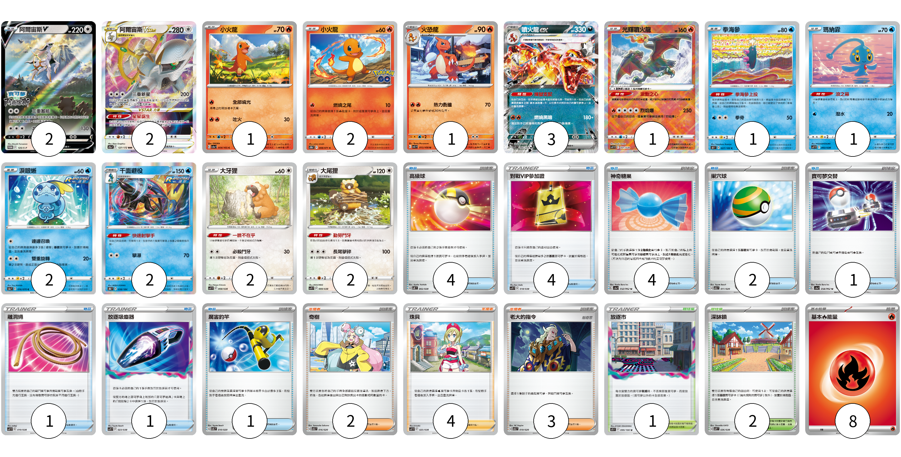 牌組構築方案 以此牌組為基礎新構築牌組 顯示卡面 顯示列表 寶可夢卡(23) 2 2 1 2 1 3 1 1 1 2 2 2 2 1 物品卡(17) 4 4 4 2 1 1 1 支援者卡(9) 2 4 3 競技場卡(3) 1 2 能量卡(8) 8 寶可夢卡(23) 卡牌名稱 張數 卡牌名稱 張數 阿爾宙斯V S-P 125/S-P 02 阿爾宙斯VSTAR S12a 127/172 02 小火龍 SV2a 004/165 01 小火龍 S10b 008/071 02 火恐龍 SV3 013/108 01 噴火龍ex SV3 066/108 03 光輝噴火龍 SVF 001/038 01 拳海參 S8 027/100 01 瑪納霏 SVF 003/038 01 淚眼蜥 S5a 016/070 02 千面避役 S8b 038/184 02 大牙狸 SVF 008/038 02 大尾狸 SVF 009/038 02 厲害釣竿 SVEL 010/020 01 物品卡(17) 卡牌名稱 張數 卡牌名稱 張數 高級球 SVB 002/028 04 對戰VIP參加證 SVF 018/038 04 神奇糖果 SV3a 053/062 04 巢穴球 SVEL 011/020 02 寶可夢交替 SV3a 054/062 01 離洞繩 SVF 010/038 01 放逐吸塵器 SVF 023/038 01 支援者卡(9) 卡牌名稱 張數 卡牌名稱 張數 奇樹 SVEL 016/020 02 珠貝 SVF 025/038 04 老大的指令 SVEL 019/020 03 競技場卡(3) 卡牌名稱 張數 卡牌名稱 張數 放逐市 S11 099/100 01 深缽鎮 SVF 036/038 02 能量卡(8) 卡牌名稱 張數 卡牌名稱 張數 基本【火】能量 SVEL FIR 08 以此牌組為基礎新構築牌組 牌組編碼 ZGANbq-BIsmhm-nupEwU copy 列印牌組單 牌組編碼已複製 分享至SNS