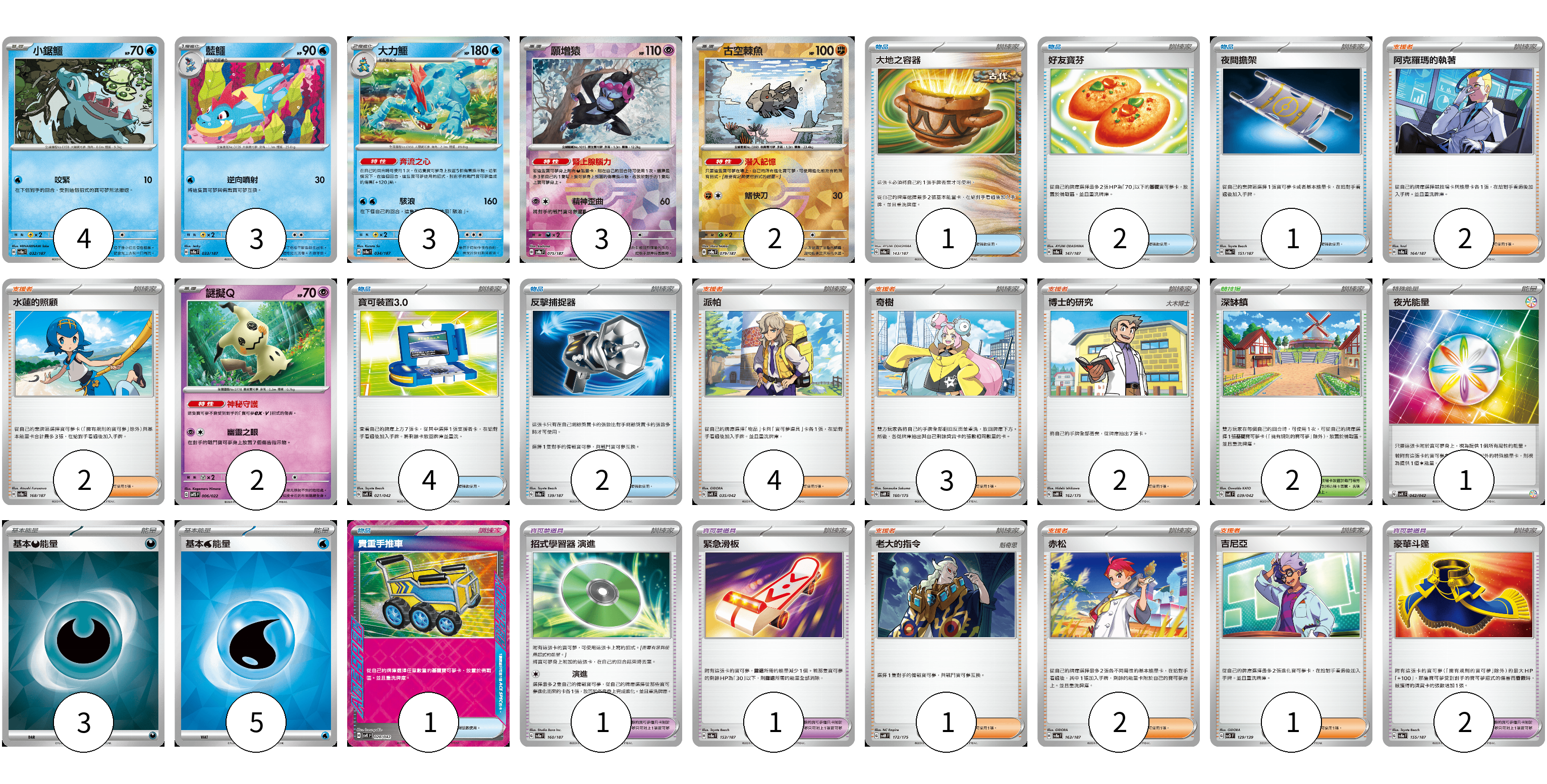 牌組構築方案 以此牌組為基礎新構築牌組 顯示卡面 顯示列表 寶可夢卡(17) 4 3 3 3 2 2 寶可夢道具(4) 1 1 2 物品卡(11) 1 2 1 4 2 1 支援者卡(17) 2 2 4 3 2 1 2 1 競技場卡(2) 2 能量卡(9) 1 3 5 寶可夢卡(17) 卡牌名稱 張數 卡牌名稱 張數 小鋸鱷 SV8a 032/187 04 藍鱷 SV8a 033/187 03 大力鱷 SV8a 034/187 03 願增猿 SV8a 075/187 03 古空棘魚 SV8a 079/187 02 謎擬Q SVTS 006/022 02 寶可夢道具(4) 卡牌名稱 張數 卡牌名稱 張數 招式學習器 演進 SV8a 160/187 01 緊急滑板 SV8a 153/187 01 豪華斗篷 SV8a 155/187 02 物品卡(11) 卡牌名稱 張數 卡牌名稱 張數 大地之容器 SV8a 143/187 01 好友寶芬 SV8a 147/187 02 夜間擔架 SV8a 151/187 01 寶可裝置3.0 SVK 021/042 04 反擊捕捉器 SV8a 139/187 02 貴重手推車 SVK 020/042 01 支援者卡(17) 卡牌名稱 張數 卡牌名稱 張數 阿克羅瑪的執著 SV8a 164/187 02 水蓮的照顧 SV8a 168/187 02 派帕 SVK 035/042 04 奇樹 SVM 160/175 03 博士的研究 SVM 162/175 02 老大的指令 SVM 172/175 01 赤松 SV8a 163/187 02 吉尼亞 SVD 129/139 01 競技場卡(2) 卡牌名稱 張數 卡牌名稱 張數 深缽鎮 SVK 039/042 02 能量卡(9) 卡牌名稱 張數 卡牌名稱 張數 夜光能量 SVK 042/042 01 基本【惡】能量 SVK DAR 03 基本【水】能量 SVK WAT 05 以此牌組為基礎新構築牌組 牌組編碼 ZJuGIY-sKearl-wLfDuZ copy 列印牌組單 牌組編碼已複製 分享至SNS