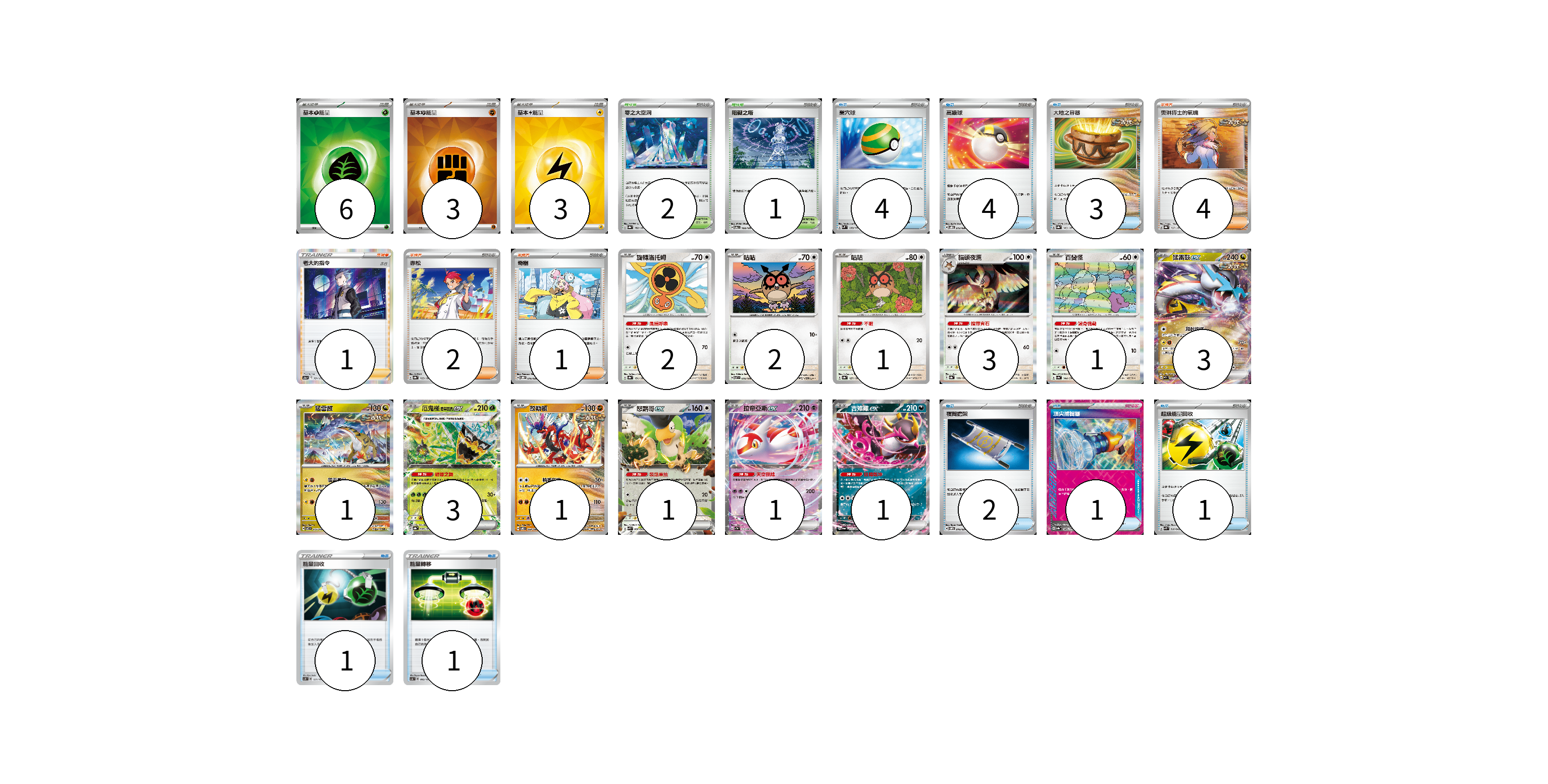 牌組構築方案 以此牌組為基礎新構築牌組 顯示卡面 顯示列表 寶可夢卡(20) 2 2 1 3 1 3 1 3 1 1 1 1 物品卡(17) 4 4 3 2 1 1 1 1 支援者卡(8) 4 1 2 1 競技場卡(3) 2 1 能量卡(12) 6 3 3 寶可夢卡(20) 卡牌名稱 張數 卡牌名稱 張數 旋轉洛托姆 SV8a 131/187 02 咕咕 SV7 076/102 02 咕咕 SV8a 127/187 01 貓頭夜鷹 SV8a 128/187 03 百變怪 SV4a 144/190 01 猛雷鼓ex SV5K 053/071 03 猛雷鼓 SV7 075/102 01 厄鬼椪 碧草面具ex SV8a 020/187 03 故勒頓 SV8 069/106 01 怒鸚哥ex SVK 006/042 01 拉帝亞斯ex SV7a 019/064 01 吉雉雞ex SV6a 038/064 01 物品卡(17) 卡牌名稱 張數 卡牌名稱 張數 巢穴球 SVM 133/175 04 高級球 SVOD 012/020 04 大地之容器 SV8a 143/187 03 夜間擔架 SVOM 016/021 02 頂尖捕捉器 SV8a 148/187 01 超級能量回收 SVK 010/042 01 能量回收 SCD 121/159 01 能量轉移 SCA 092/135 01 支援者卡(8) 卡牌名稱 張數 卡牌名稱 張數 奧琳博士的氣魄 SV8a 167/187 04 老大的指令(赤日) S12a 161/172 01 赤松 SV8a 163/187 02 奇樹 SVOD 016/020 01 競技場卡(3) 卡牌名稱 張數 卡牌名稱 張數 零之大空洞 SV8a 182/187 02 阻礙之塔 SV6 100/101 01 能量卡(12) 卡牌名稱 張數 卡牌名稱 張數 基本【草】能量 SVK GRA 06 基本【鬥】能量 SVK FIG 03 基本【雷】能量 SVK LIG 03 以此牌組為基礎新構築牌組 牌組編碼 ZLRwPD-bWdUKT-klpiQH copy 列印牌組單 牌組編碼已複製 分享至SNS