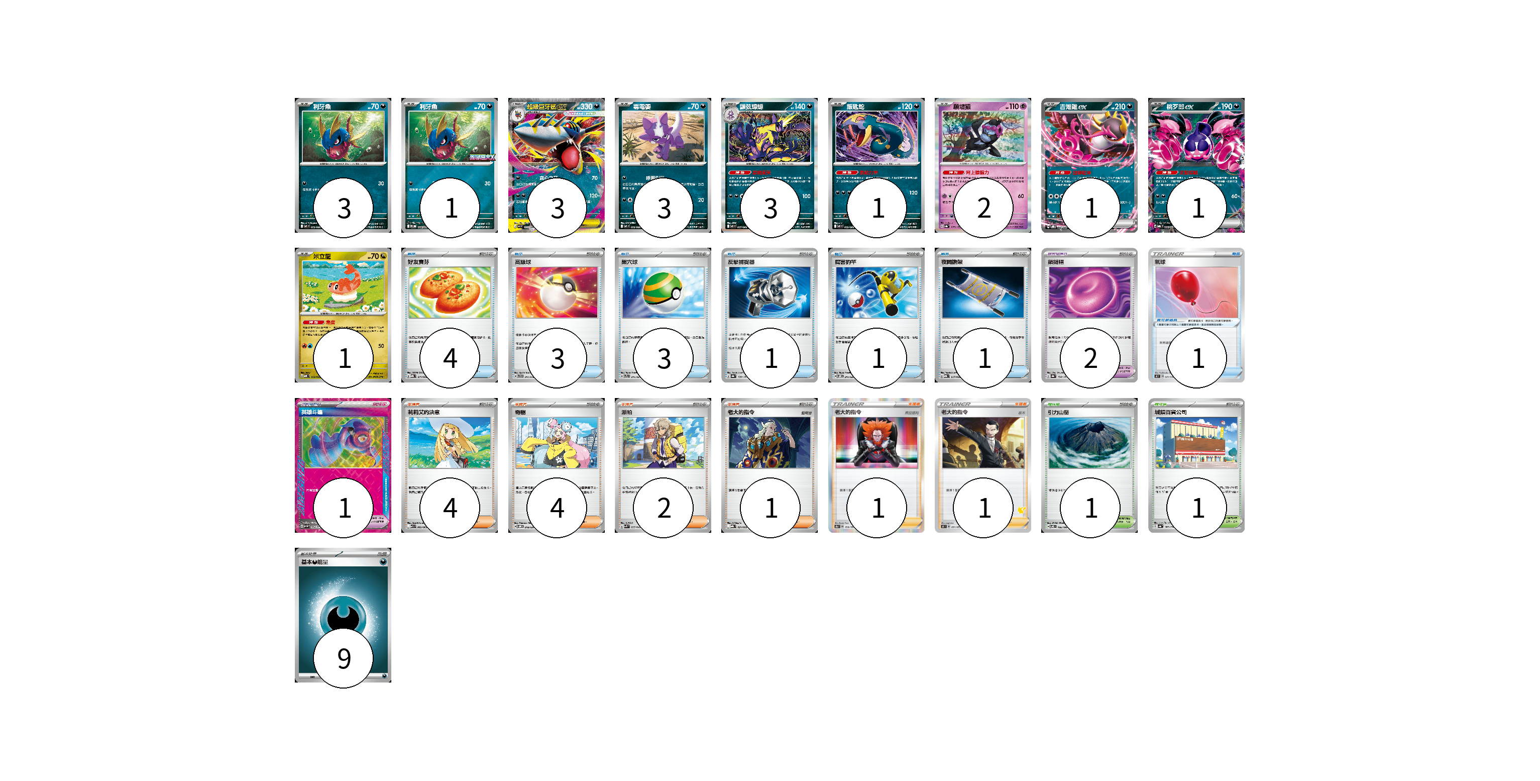 牌組構築方案 以此牌組為基礎新構築牌組 顯示卡面 顯示列表 寶可夢卡(19) 3 1 3 3 3 1 2 1 1 1 寶可夢道具(4) 2 1 1 物品卡(13) 4 3 3 1 1 1 支援者卡(13) 4 4 2 1 1 1 競技場卡(2) 1 1 能量卡(9) 9 寶可夢卡(19) 卡牌名稱 張數 卡牌名稱 張數 利牙魚 M2 050/080 03 利牙魚 M-P 026/M-P 01 超級巨牙鯊ex M2 051/080 03 毒電嬰 M2 056/080 03 顫弦蠑螈 M2 057/080 03 飯匙蛇 M2 052/080 01 願增猿 SV8a 075/187 02 吉雉雞ex SVOD 004/020 01 桃歹郎ex MBG 009/022 01 米立龍 MBD 010/022 01 寶可夢道具(4) 卡牌名稱 張數 卡牌名稱 張數 鎖鏈糬 SV8a 154/187 02 氣球 SK 021/030 01 英雄斗篷 SV5M 064/071 01 物品卡(13) 卡牌名稱 張數 卡牌名稱 張數 好友寶芬 MBG 011/022 04 高級球 SVTH 011/018 03 巢穴球 SVTL 011/021 03 反擊捕捉器 SV8a 139/187 01 厲害釣竿 SVOM 011/021 01 夜間擔架 MBG 017/022 01 支援者卡(13) 卡牌名稱 張數 卡牌名稱 張數 莉莉艾的決意 M1L 062/063 04 奇樹 SVOM 018/021 04 派帕 SVK 035/042 02 老大的指令 MBG 021/022 01 老大的指令(弗拉達利) S8b 158/184 01 老大的指令(坂木) SH 051/053 01 競技場卡(2) 卡牌名稱 張數 卡牌名稱 張數 引力山岳 SV8 106/106 01 城鎮百貨公司 SV4a 183/190 01 能量卡(9) 卡牌名稱 張數 卡牌名稱 張數 基本【惡】能量 M-P DAR 09 以此牌組為基礎新構築牌組 牌組編碼 ZLzgXJ-FSXfII-xAsolM copy 列印牌組單 牌組編碼已複製 分享至SNS