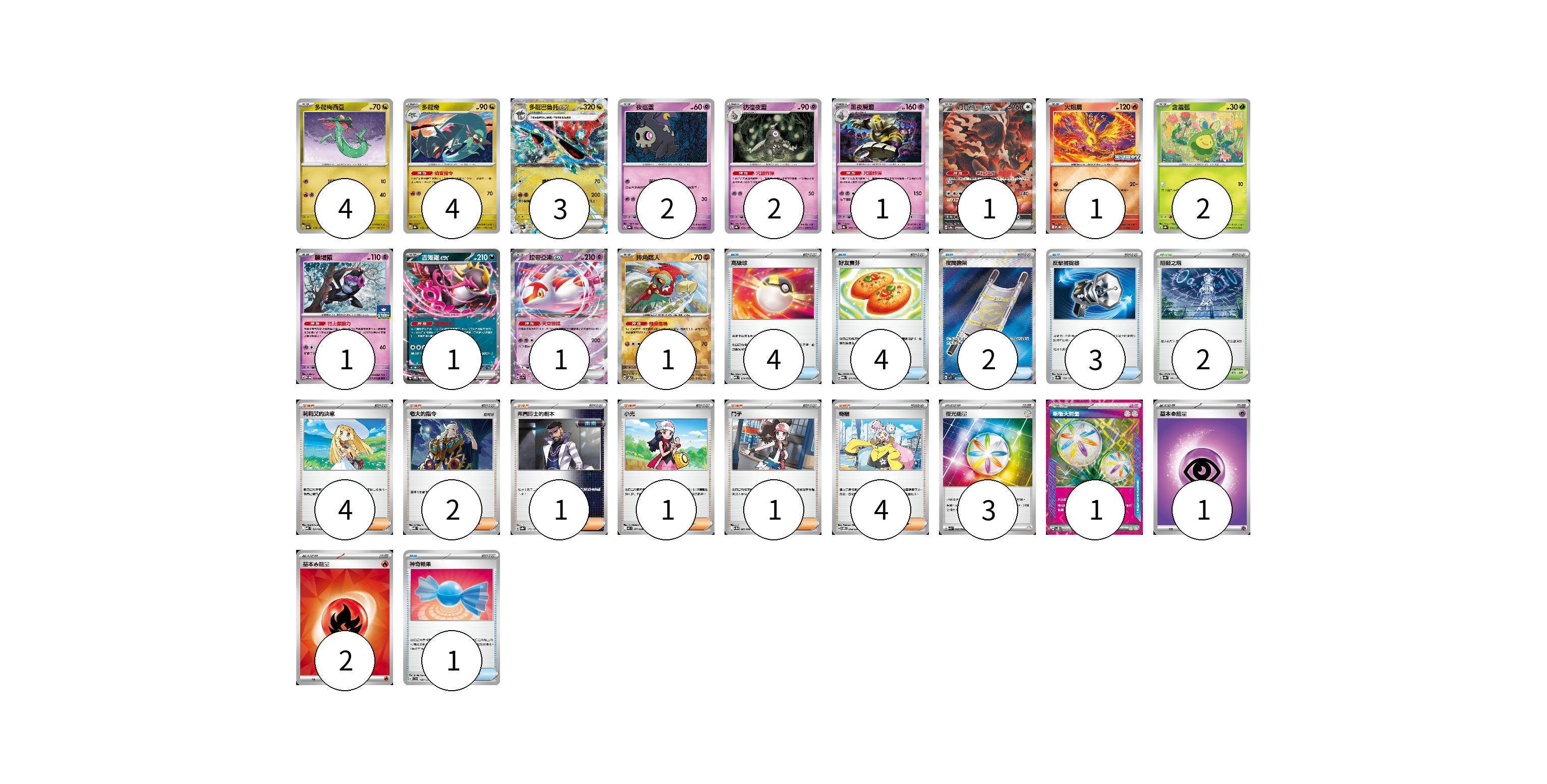 牌組構築方案 以此牌組為基礎新構築牌組 顯示卡面 顯示列表 寶可夢卡(24) 4 4 3 2 2 1 1 1 2 1 1 1 1 物品卡(14) 4 4 2 3 1 支援者卡(13) 4 2 1 1 1 4 競技場卡(2) 2 能量卡(7) 3 1 1 2 寶可夢卡(24) 卡牌名稱 張數 卡牌名稱 張數 多龍梅西亞 SV8a 118/187 04 多龍奇 SV8a 119/187 04 多龍巴魯托ex SV8a 120/187 03 夜巡靈 SV8a 064/187 02 彷徨夜靈 SV8a 065/187 02 黑夜魔靈 SV8a 066/187 01 月月熊 赫月ex SV8a 225/187 01 火焰鳥 M-P 022/M-P 01 含羞苞 SV8a 001/187 02 願增猿 M-P 014/M-P 01 吉雉雞ex SVOM 009/021 01 拉帝亞斯ex SV7a 019/064 01 摔角鷹人 SV8a 084/187 01 物品卡(14) 卡牌名稱 張數 卡牌名稱 張數 高級球 MBD 014/022 04 好友寶芬 MBG 011/022 04 夜間擔架 M1L 083/063 02 反擊捕捉器 SV8a 139/187 03 神奇糖果 SVD 120/139 01 支援者卡(13) 卡牌名稱 張數 卡牌名稱 張數 莉莉艾的決意 MBD 021/022 04 老大的指令 MBD 020/022 02 弗圖博士的劇本 SV8a 175/187 01 小光 M2 077/080 01 鬥子 SV11W 085/086 01 奇樹 SVOM 018/021 04 競技場卡(2) 卡牌名稱 張數 卡牌名稱 張數 阻礙之塔 SV8a 181/187 02 能量卡(7) 卡牌名稱 張數 卡牌名稱 張數 夜光能量 SVK 042/042 03 新衝天能量 SV5K 071/071 01 基本【超】能量 MBD PSY 01 基本【火】能量 SVQL FIR 02 以此牌組為基礎新構築牌組 牌組編碼 ZMCxHG-AzDSRo-KBUTZx copy 列印牌組單 牌組編碼已複製 分享至SNS