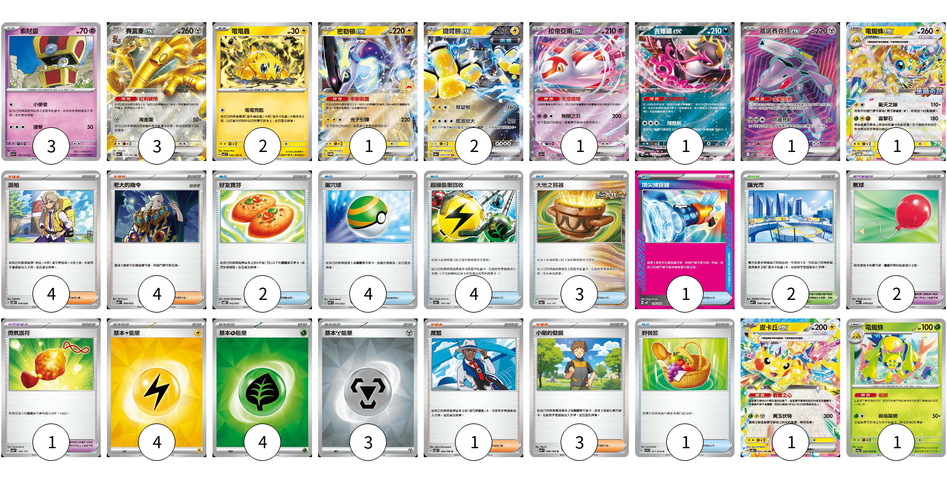 牌組構築方案 以此牌組為基礎新構築牌組 顯示卡面 顯示列表 寶可夢卡(17) 3 3 2 1 2 1 1 1 1 1 1 寶可夢道具(3) 2 1 物品卡(15) 2 4 4 3 1 1 支援者卡(12) 4 4 1 3 競技場卡(2) 2 能量卡(11) 4 4 3 寶可夢卡(17) 卡牌名稱 張數 卡牌名稱 張數 索財靈 SV7a 024/064 03 賽富豪ex SV8a 117/187 03 電電蟲 SV7 032/102 02 密勒頓ex SV-P 164/SV-P 01 鐵臂膀ex SV8a 054/187 02 拉帝亞斯ex SV7a 019/064 01 吉雉雞ex SV8a 104/187 01 蓋諾賽克特ex SV11B 164/086 01 電蜘蛛ex SV-P 144/SV-P 01 皮卡丘ex SV8 033/106 01 電蜘蛛 SV6a 002/064 01 寶可夢道具(3) 卡牌名稱 張數 卡牌名稱 張數 氣球 MBD 018/022 02 勇氣護符 SVM 142/175 01 物品卡(15) 卡牌名稱 張數 卡牌名稱 張數 好友寶芬 SVOM 012/021 02 巢穴球 SVTS 013/022 04 超級能量回收 SV8a 141/187 04 大地之容器 SV8a 143/187 03 頂尖捕捉器 MBG 014/022 01 野餐籃 SV1V 071/078 01 支援者卡(12) 卡牌名稱 張數 卡牌名稱 張數 派帕 SVOD 018/020 04 老大的指令 MBD 020/022 04 席藍 SV8 102/106 01 小剛的發掘 SV9 096/100 03 競技場卡(2) 卡牌名稱 張數 卡牌名稱 張數 釀光市 SV9 098/100 02 能量卡(11) 卡牌名稱 張數 卡牌名稱 張數 基本【雷】能量 SVQP LIG 04 基本【草】能量 SVM GRA 04 基本【鋼】能量 SVOD MET 03 以此牌組為基礎新構築牌組 牌組編碼 ZNzxaV-jsbyeL-YrMwnl copy 列印牌組單 牌組編碼已複製 分享至SNS