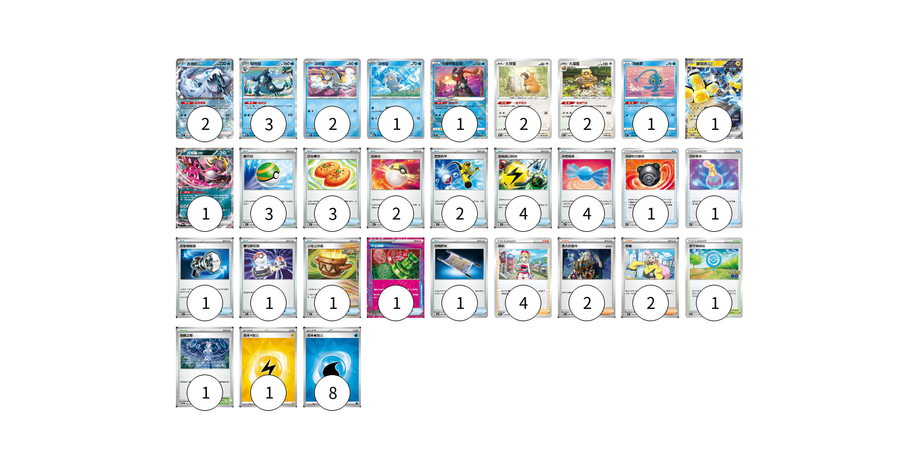 牌組構築方案 以此牌組為基礎新構築牌組 顯示卡面 顯示列表 寶可夢卡(16) 2 3 2 1 1 2 2 1 1 1 物品卡(25) 3 3 2 2 4 4 1 1 1 1 1 1 1 支援者卡(8) 4 2 2 競技場卡(2) 1 1 能量卡(9) 1 8 寶可夢卡(16) 卡牌名稱 張數 卡牌名稱 張數 古劍豹ex SV2P 028/071 02 戟脊龍 SV4a 053/190 03 涼脊龍 SV2P 024/071 02 涼脊龍 SV4a 051/190 01 光輝甲賀忍蛙 S9a 026/067 01 大牙狸 SVTL 007/021 02 大尾狸 SVTL 008/021 02 瑪納霏 SVF 003/038 01 鐵臂膀ex SVTR 007/021 01 吉雉雞ex SV6a 038/064 01 物品卡(25) 卡牌名稱 張數 卡牌名稱 張數 巢穴球 SVK 016/042 03 好友寶芬 SVK 015/042 03 高級球 SVK 018/042 02 厲害釣竿 SVK 011/042 02 超級能量回收 SVK 010/042 04 神奇糖果 SVK 019/042 04 洗翠的沉重球 SVF 019/038 01 消除香水 SVF 011/038 01 反擊捕捉器 SVK 009/042 01 寶可夢交替 SVK 022/042 01 大地之容器 SVK 012/042 01 不公印章 SV5a 053/066 01 夜間擔架 SV6a 056/064 01 支援者卡(8) 卡牌名稱 張數 卡牌名稱 張數 珠貝 SVTG 016/019 04 老大的指令 SVK 036/042 02 奇樹 SVK 031/042 02 競技場卡(2) 卡牌名稱 張數 卡牌名稱 張數 寶可補給站 S10b 071/071 01 阻礙之塔 SV6 100/101 01 能量卡(9) 卡牌名稱 張數 卡牌名稱 張數 基本【雷】能量 SVK LIG 01 基本【水】能量 SVK WAT 08 以此牌組為基礎新構築牌組 牌組編碼 ZRbpch-AtWqhL-QcEtJk copy 列印牌組單 牌組編碼已複製 分享至SNS