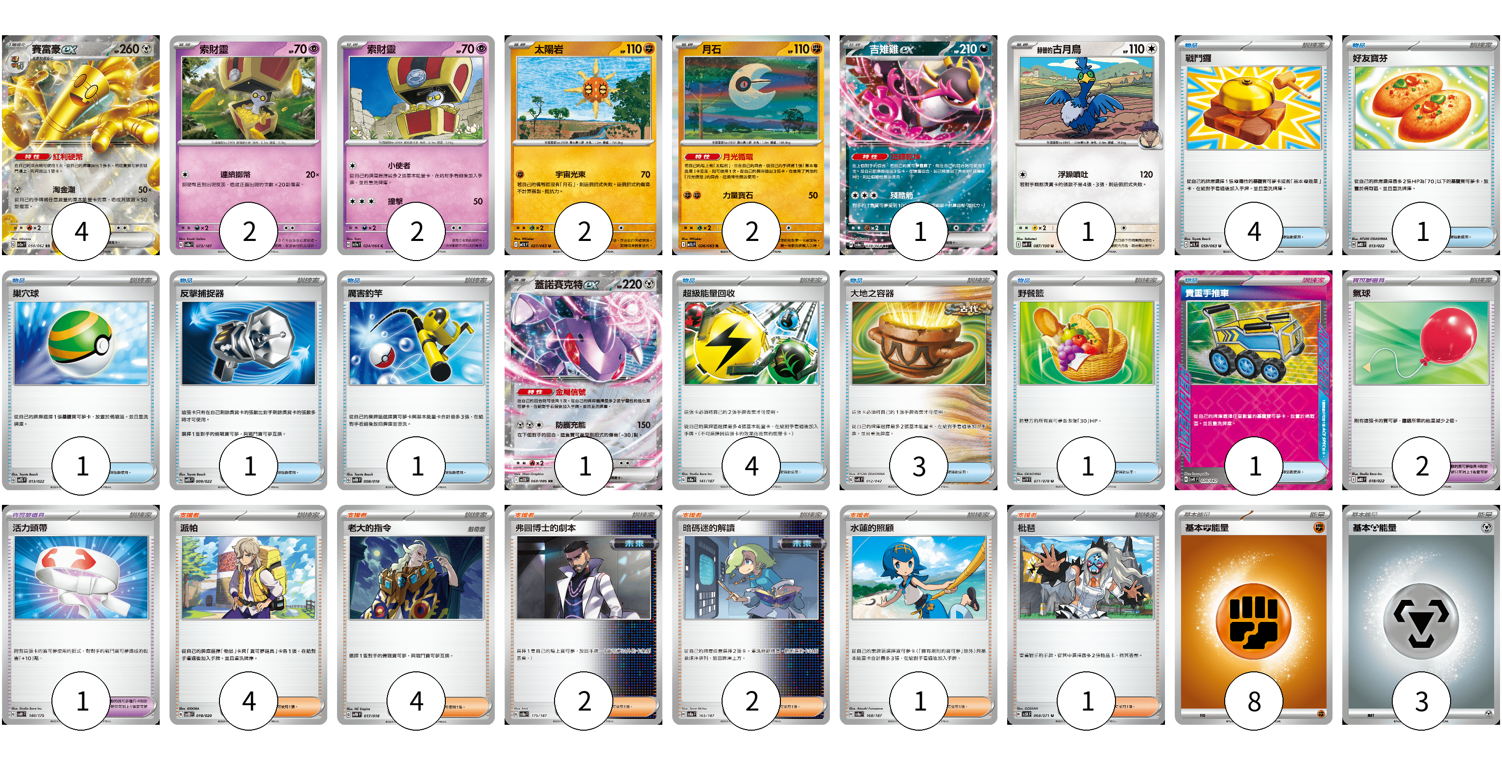 牌組構築方案 以此牌組為基礎新構築牌組 顯示卡面 顯示列表 寶可夢卡(15) 4 2 2 2 2 1 1 1 寶可夢道具(3) 2 1 物品卡(17) 4 1 1 1 1 4 3 1 1 支援者卡(14) 4 4 2 2 1 1 能量卡(11) 8 3 寶可夢卡(15) 卡牌名稱 張數 卡牌名稱 張數 賽富豪ex SV3a 050/062 04 索財靈 SV8a 073/187 02 索財靈 SV7a 024/064 02 太陽岩 M1L 027/063 02 月石 M1L 026/063 02 吉雉雞ex SV6a 038/064 01 赫普的古月鳥 SV9 087/100 01 蓋諾賽克特ex SV11B 069/086 01 寶可夢道具(3) 卡牌名稱 張數 卡牌名稱 張數 氣球 MBD 018/022 02 活力頭帶 SVM 140/175 01 物品卡(17) 卡牌名稱 張數 卡牌名稱 張數 戰鬥鑼 M1L 059/063 04 好友寶芬 MBD 013/022 01 巢穴球 SVTS 013/022 01 反擊捕捉器 SVTS 009/022 01 厲害釣竿 SVTH 008/018 01 超級能量回收 SV8a 141/187 04 大地之容器 SVK 012/042 03 野餐籃 SV1V 071/078 01 貴重手推車 SVK 020/042 01 支援者卡(14) 卡牌名稱 張數 卡牌名稱 張數 派帕 SVOD 018/020 04 老大的指令 SVTH 017/018 04 弗圖博士的劇本 SV8a 175/187 02 暗碼迷的解讀 SV8a 165/187 02 水蓮的照顧 SV8a 168/187 01 枇琶 SV5K 068/071 01 能量卡(11) 卡牌名稱 張數 卡牌名稱 張數 基本【鬥】能量 M-P FIG 08 基本【鋼】能量 M-P MET 03 以此牌組為基礎新構築牌組 牌組編碼 ZRyAaq-ijjBmg-JHNQPv copy 列印牌組單 牌組編碼已複製 分享至SNS