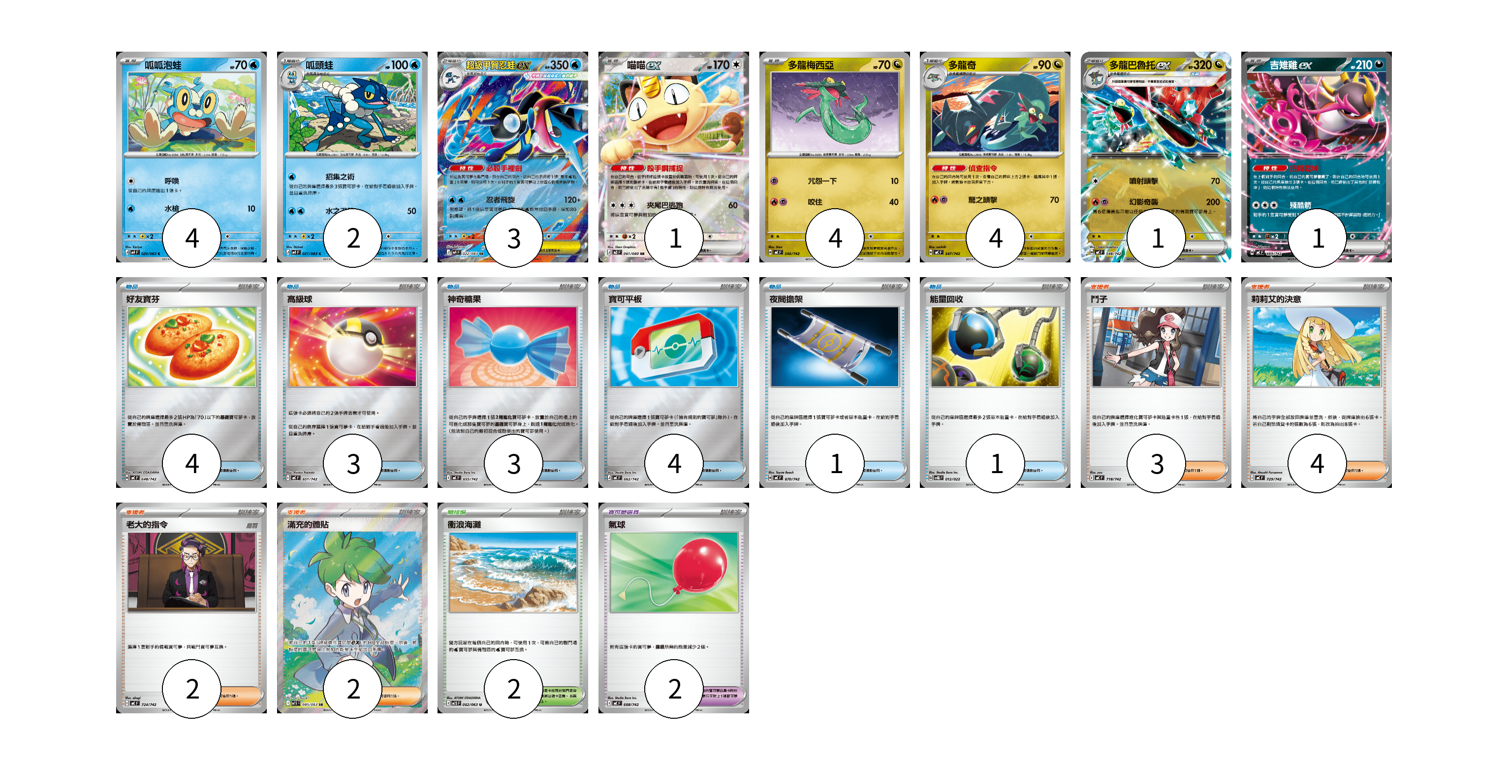 牌組構築方案 以此牌組為基礎新構築牌組 顯示卡面 顯示列表 寶可夢卡(20) 4 2 3 1 4 4 1 1 寶可夢道具(2) 2 物品卡(16) 4 3 3 4 1 1 支援者卡(11) 3 4 2 2 競技場卡(2) 2 寶可夢卡(20) 卡牌名稱 張數 卡牌名稱 張數 呱呱泡蛙 M4 020/083 04 呱頭蛙 M4 021/083 02 超級甲賀忍蛙ex M4 022/083 03 喵喵ex M3 061/080 01 多龍梅西亞 MC 546/742 04 多龍奇 MC 547/742 04 多龍巴魯托ex MC 548/742 01 吉雉雞ex MC 489/742 01 寶可夢道具(2) 卡牌名稱 張數 卡牌名稱 張數 氣球 MC 688/742 02 物品卡(16) 卡牌名稱 張數 卡牌名稱 張數 好友寶芬 MC 648/742 04 高級球 MC 651/742 03 神奇糖果 MC 655/742 03 寶可平板 MC 662/742 04 夜間擔架 MC 670/742 01 能量回收 SVQL 012/022 01 支援者卡(11) 卡牌名稱 張數 卡牌名稱 張數 鬥子 MC 718/742 03 莉莉艾的決意 MC 729/742 04 老大的指令 MC 724/742 02 滿充的體貼 M1S 085/063 02 競技場卡(2) 卡牌名稱 張數 卡牌名稱 張數 衝浪海灘 M1S 062/063 02 以此牌組為基礎新構築牌組 牌組編碼 ZStCLM-YnIcsx-KYWJpP copy 列印牌組單 牌組編碼已複製 分享至SNS